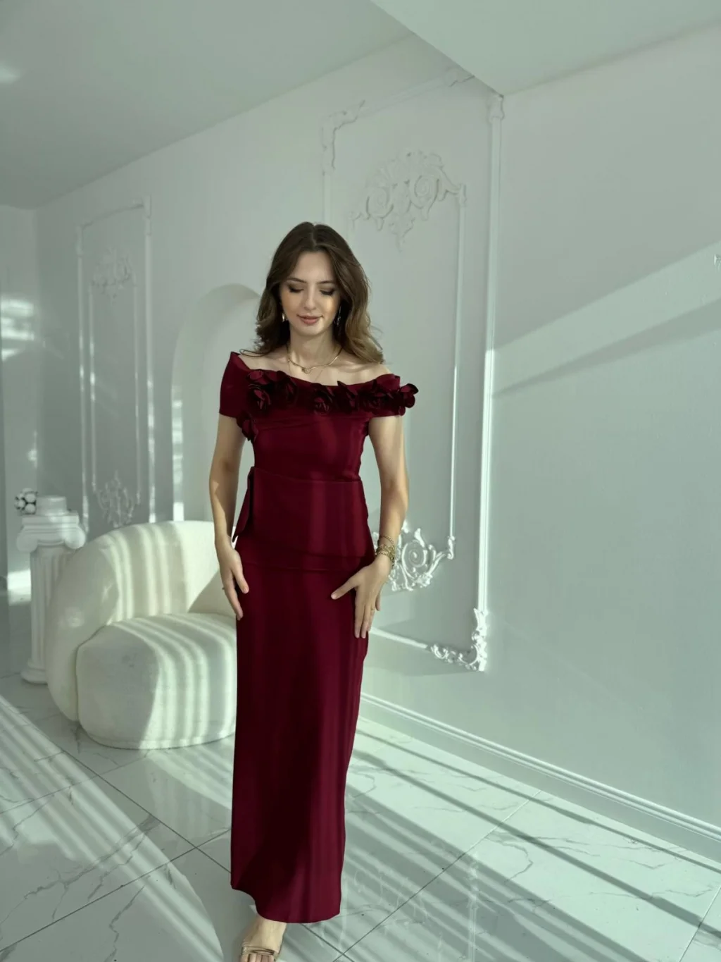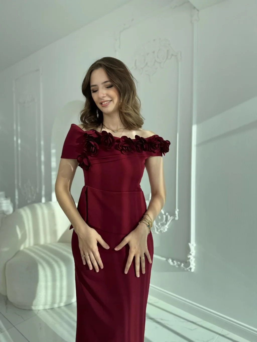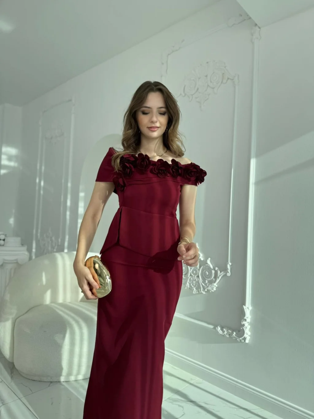3D Çiçek Detaylı Madonna Yaka Tam Boy Bordo Abiye Elbise