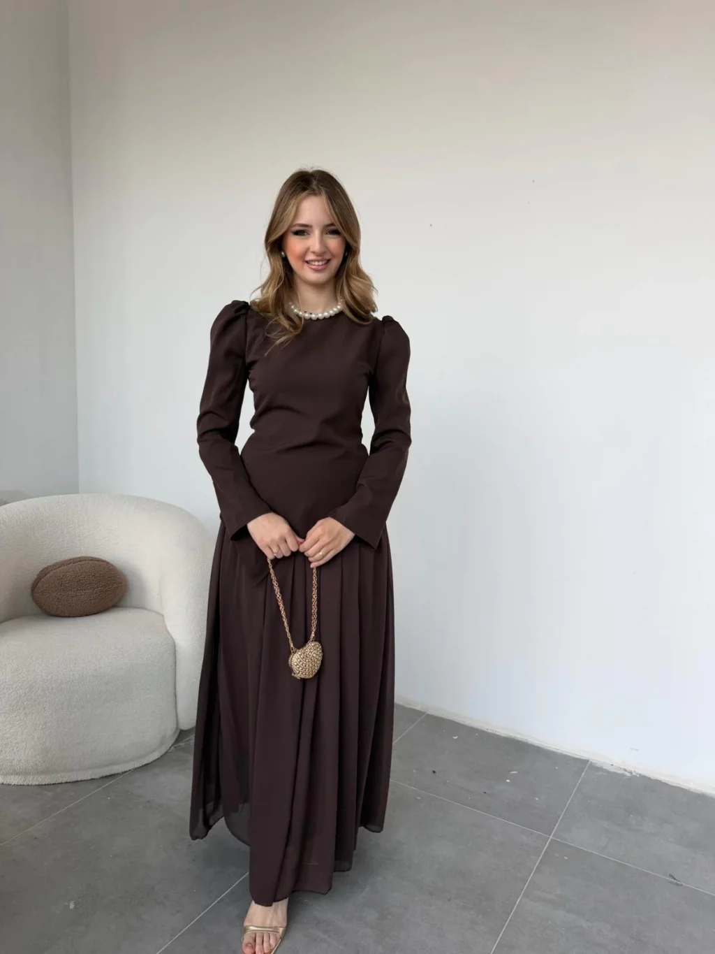Asimetrik Bluz ve Şifon Etek Kahve Takım