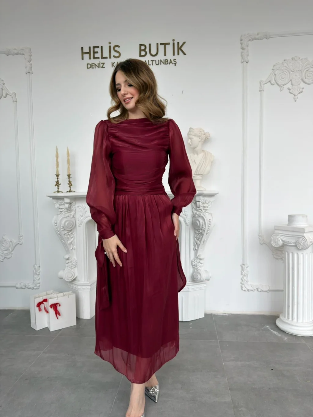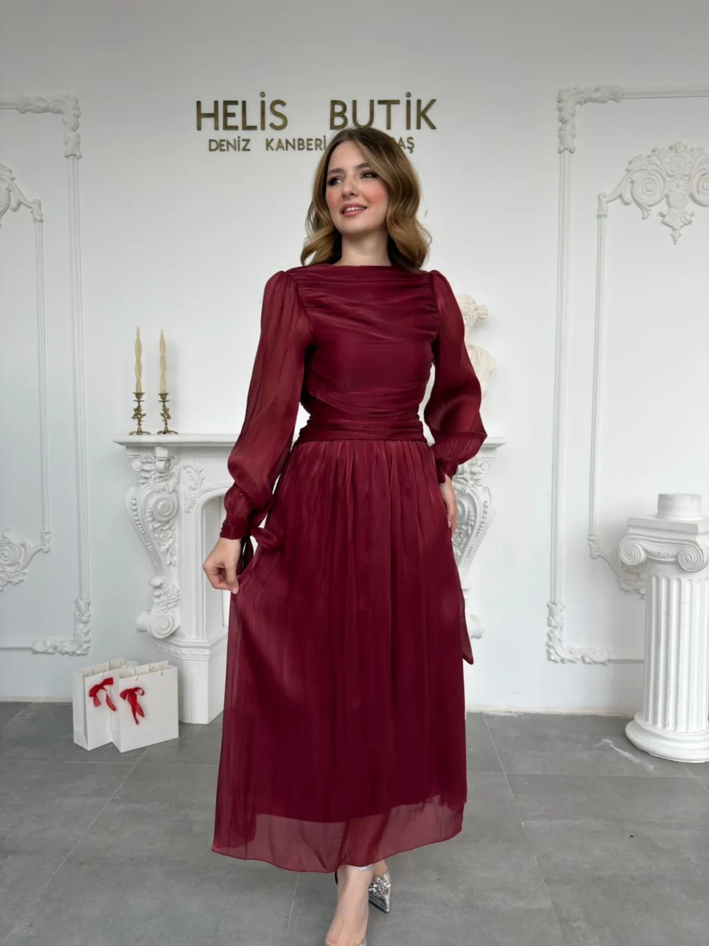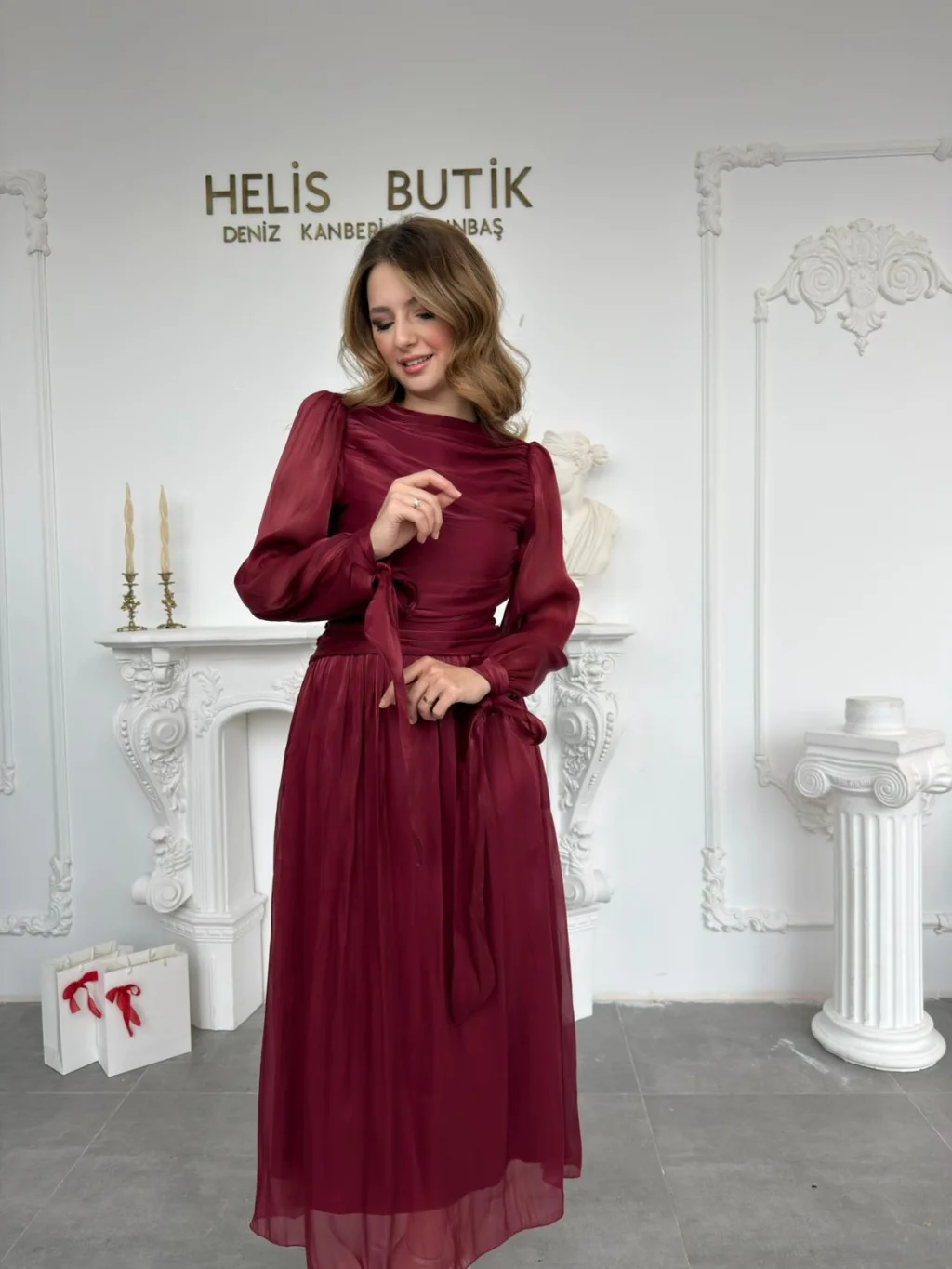 Özel günlerinde hem asil hem de göz alıcı görünmek isteyenlerin yeni favorisiyle tanışın! Işıltılı dokusuyla girdiğiniz her ortamda tüm bakışları üzerinize çekecek bu elbisemiz, zarafeti ve modern kesimi bir arada sunuyor. Hakim yaka üzerindeki soft büzgü detayları yüz hattınızı ön plana çıkarırken, kollarındaki bağlama detayları modele romantik bir hava katıyor.