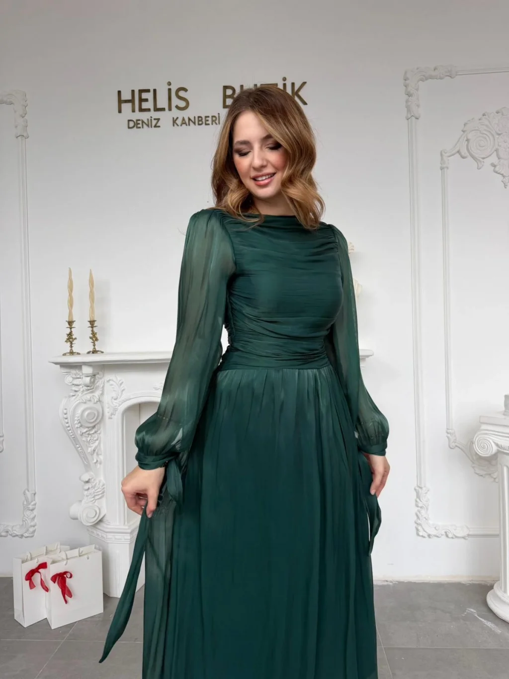 Bağlama Detaylı Simli Işıltılı Zümrüt Abiye Elbise