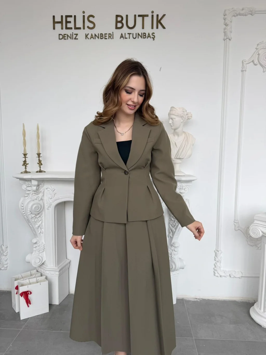 Gardırobunuzun en güçlü ve en zarif parçasıyla tanışmaya hazır mısınız? Modern kadının stil kodlarını yeniden yazan bu haki etek ceket takım, hem ofis şıklığında hem de özel davetlerde sizi odak noktası haline getirecek. Ceketin bel kısmındaki özel pens detayları ve tek düğmeli kapaması, vücut hatlarınızı zarifçe ortaya çıkarırken; eteğin geniş kesimi ve pilise detayları hareket özgürlüğünüzü kısıtlamadan asil bir duruş sergilemenizi sağlar.