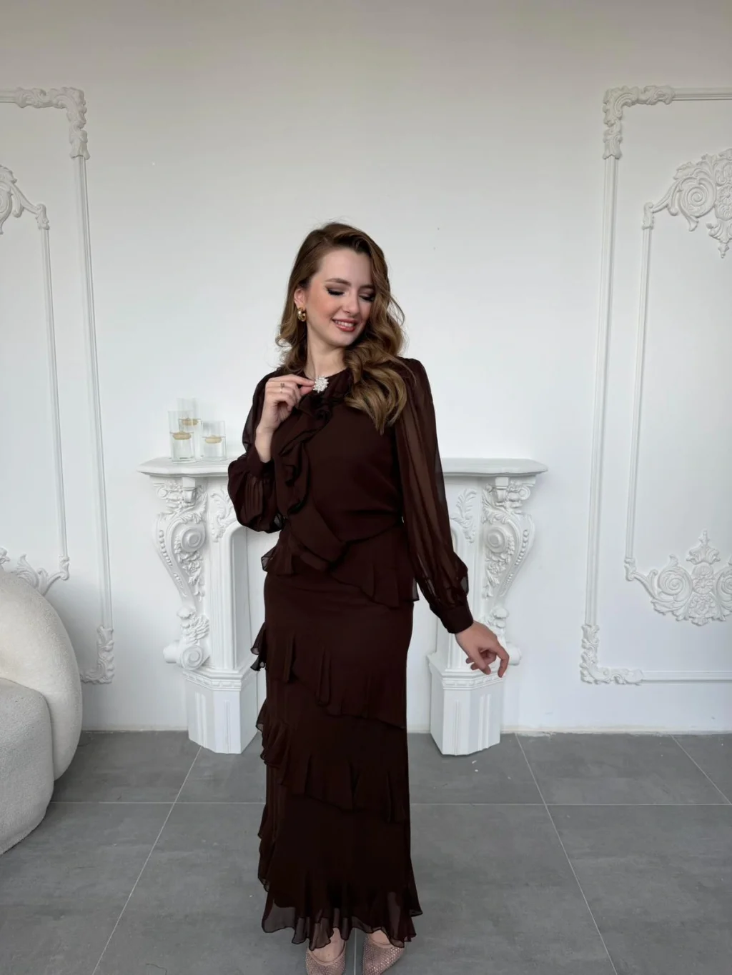 Bu özel takım, zarafetin en sade ve en etkileyici hâlini bir arada sunuyor. Üst parçada yer alan akışkan şifon dokusu, yumuşak dökümlü fırfır geçişleri ve isteğe göre çıkarılabilen broş detayı ile şık bir görünüm oluşturuyor. Kol kısmının hafif transparan yapısı takıma ince bir hareket katarken, etek bölümündeki kat kat fırfır geçişleri adım attıkça akışkan bir silüet sağlıyor. Tam kalıp yapısı sayesinde kendi bedeninizi gönül rahatlığıyla tercih edebilirsiniz.