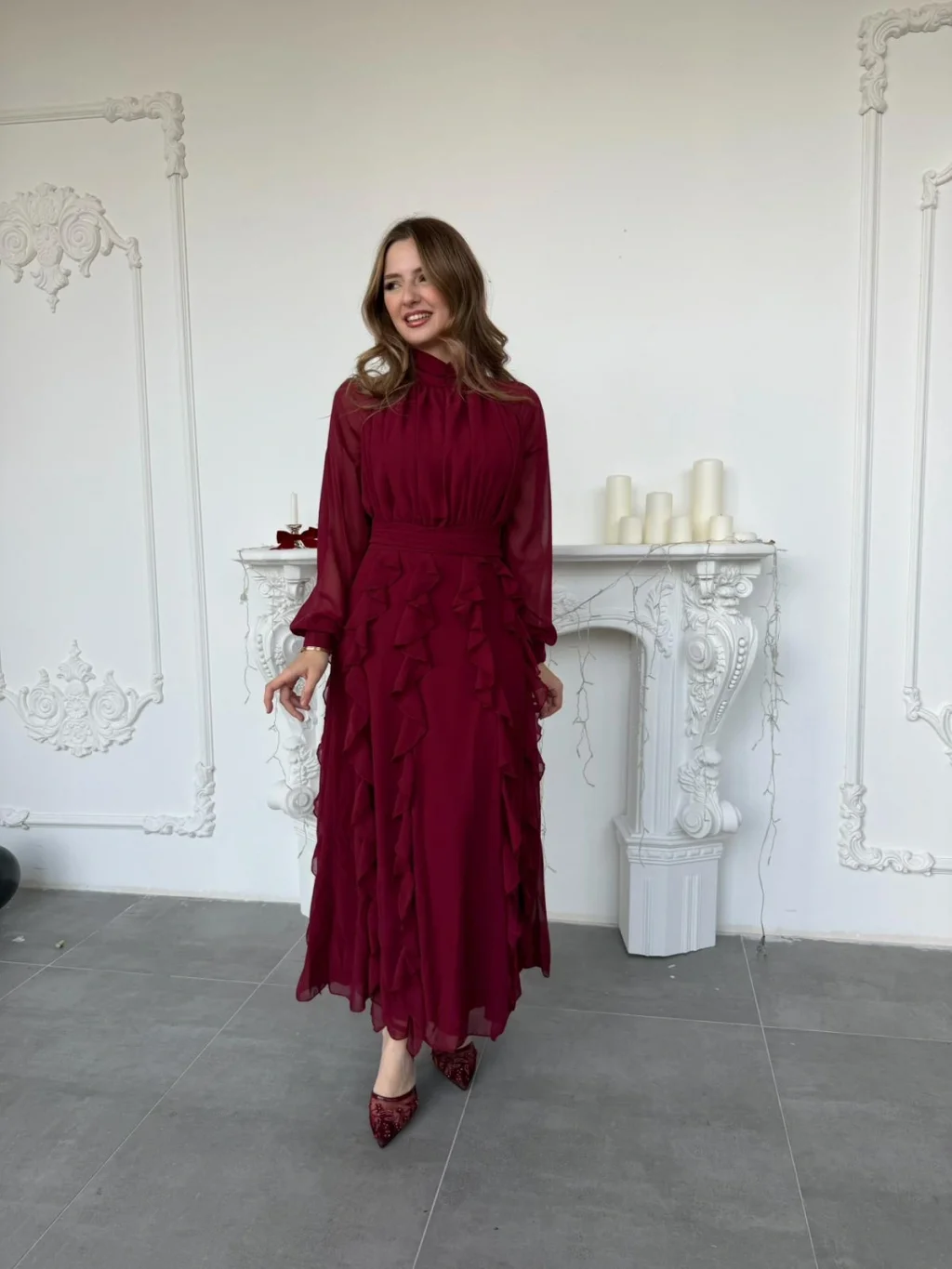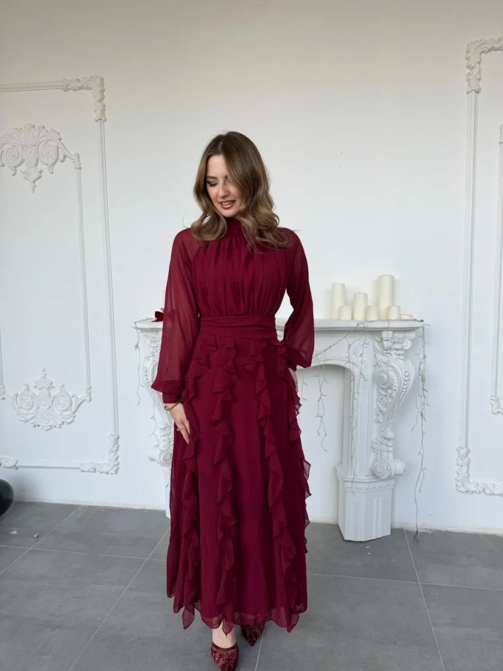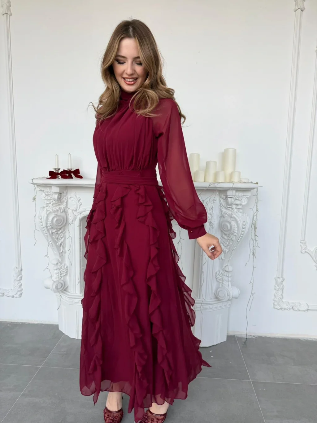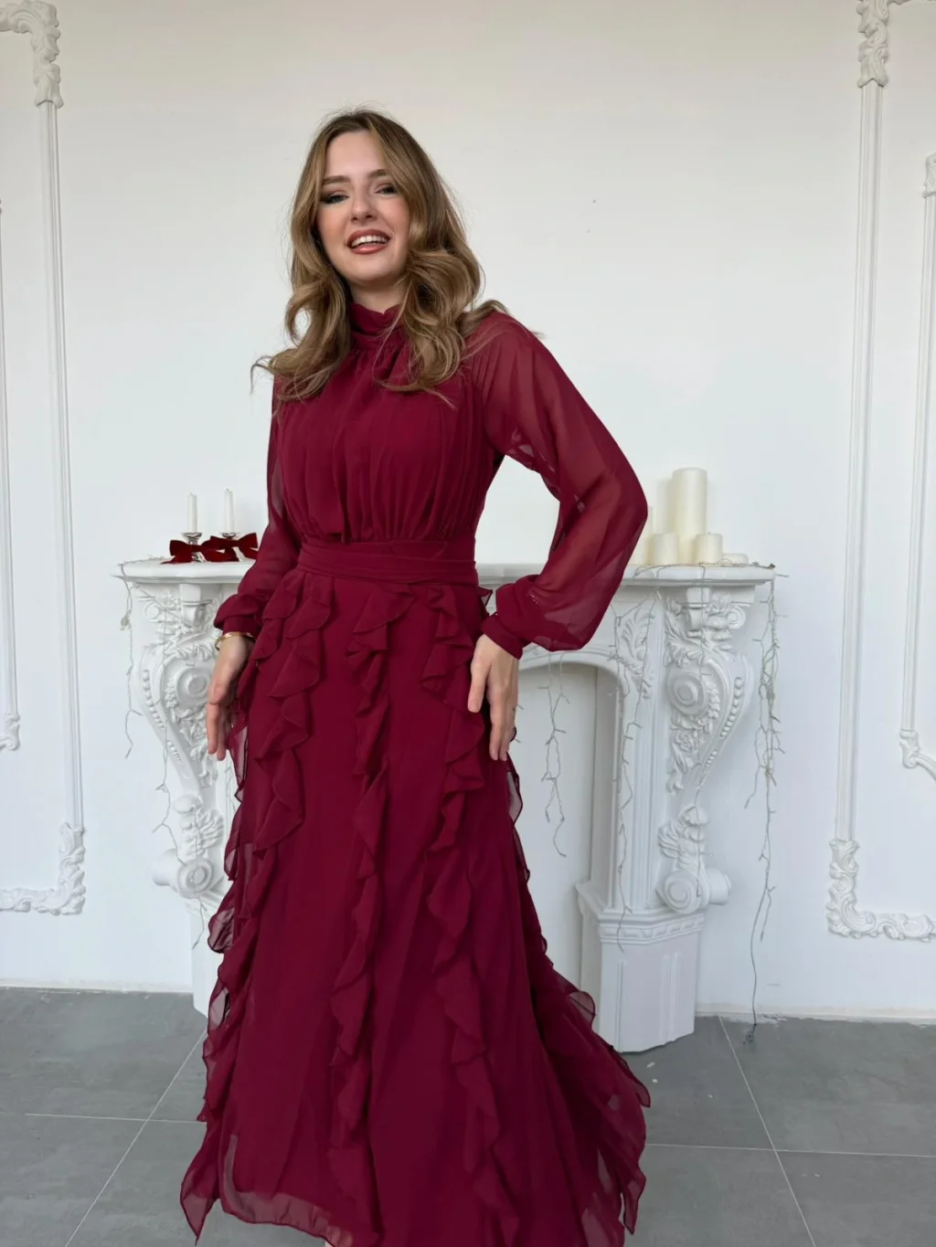 Yumuşak dökümlü şifon kumaşı, yüksek yakasında kullanılan zarif büzgü formu ve hareketli volan detaylarıyla bu elbise, özel günlerde sade ama güçlü bir duruş arayanlara hitap ediyor. Boydan aşağı inen kat kat volanlar, elbiseye akışkan bir siluet kazandırırken aynı zamanda her adımda romantik bir hareket sağlıyor. Bel bölgesine oturan çıkarılabilir kuşak, vücudu ideal şekilde sararak formu ince gösteriyor.