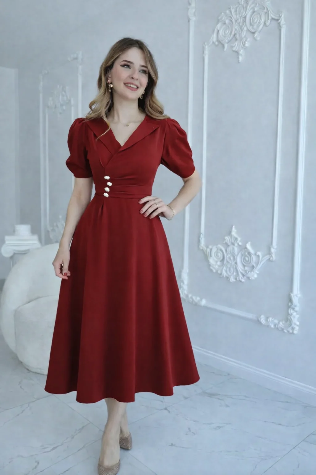 CEKET YAKA BALON KOL DÜĞME DETAY KIRMIZI ELBİSE