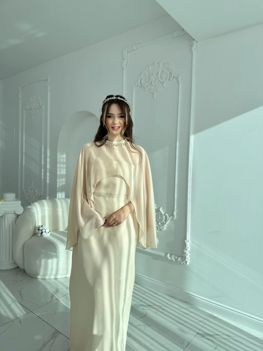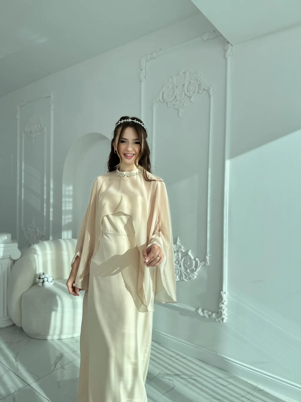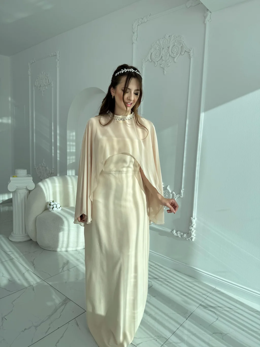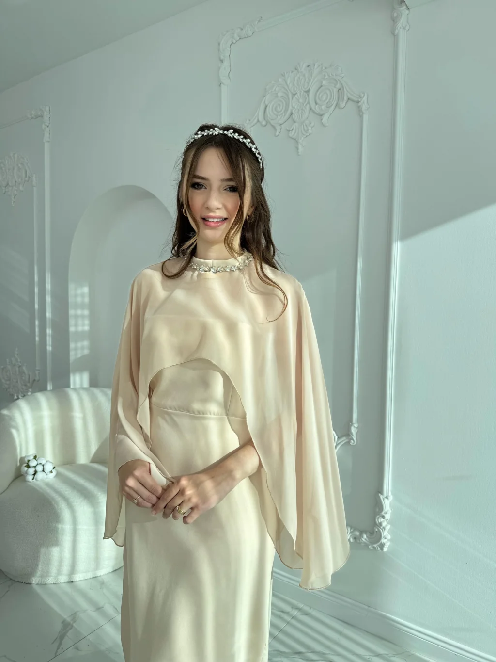 • ✅ İki parçalı form: straplez elbise + çıkarılabilir şifon şal