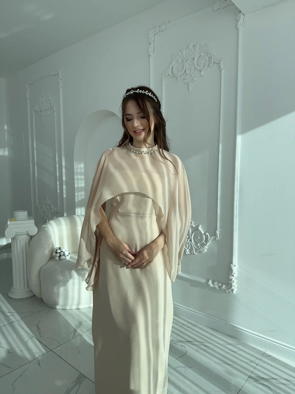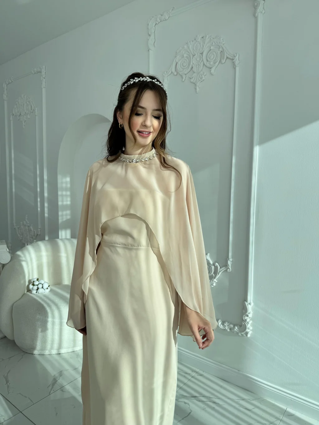 Çıkarılabilir Şal Detaylı Zarif Bej Elbise