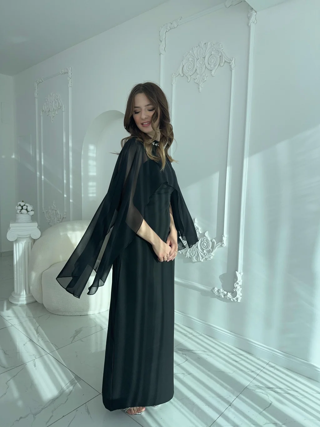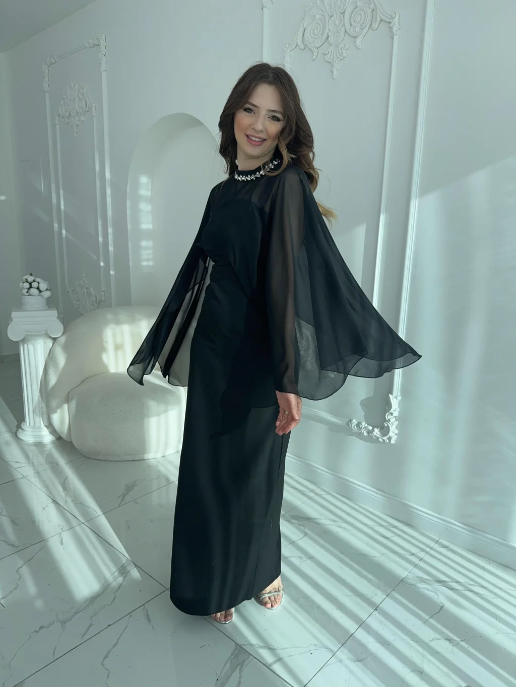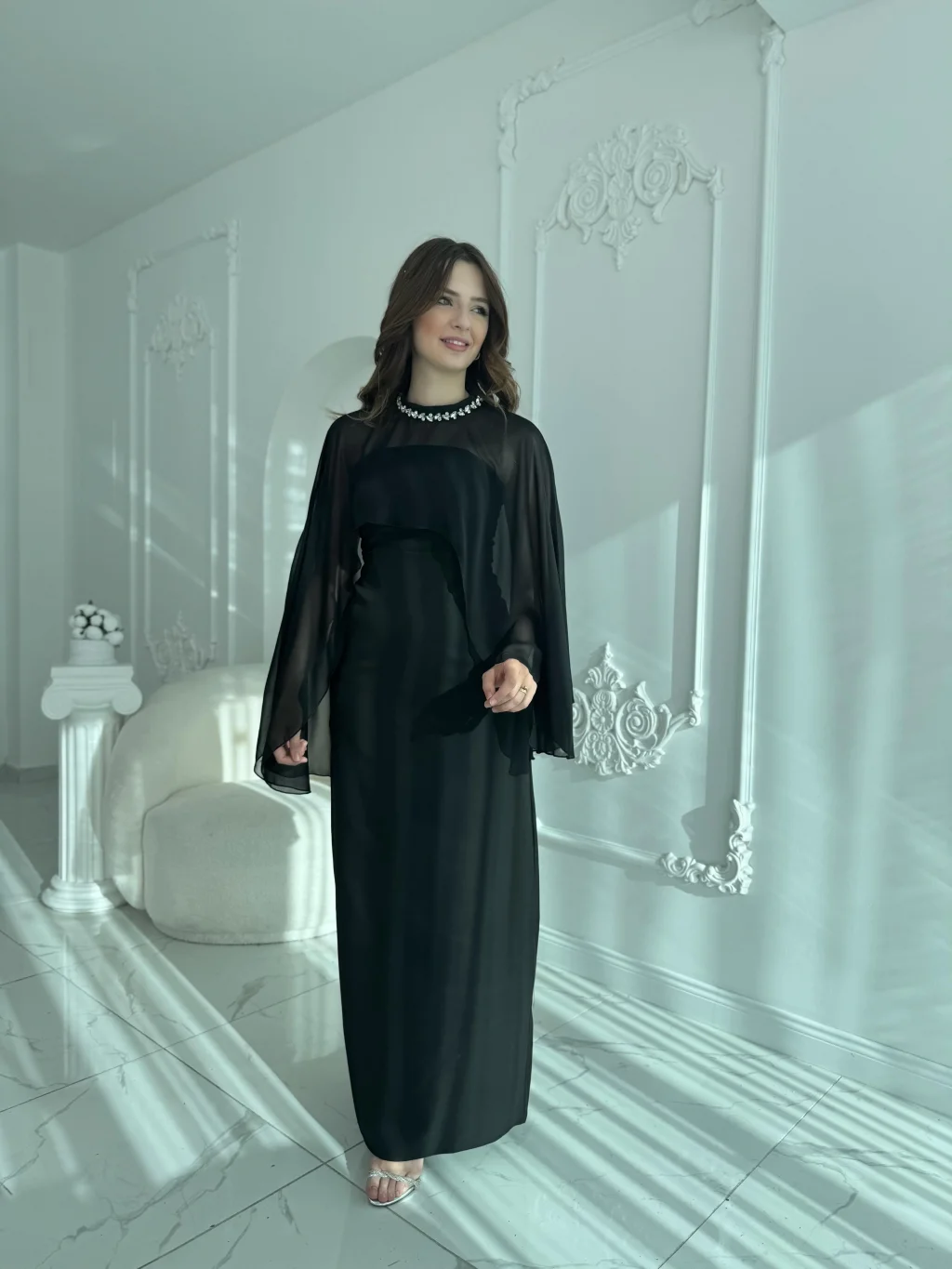• ✅ İki parçalı form: straplez elbise + çıkarılabilir şifon şal