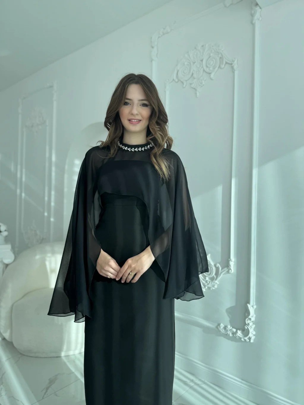 Çıkarılabilir Şal Detaylı Zarif Siyah Elbise