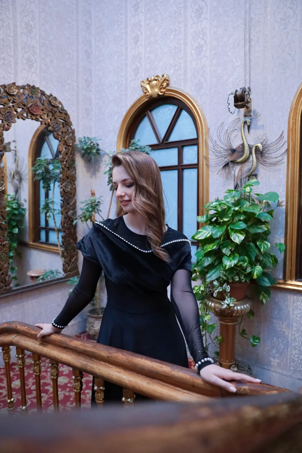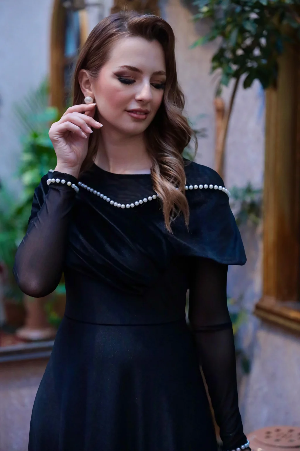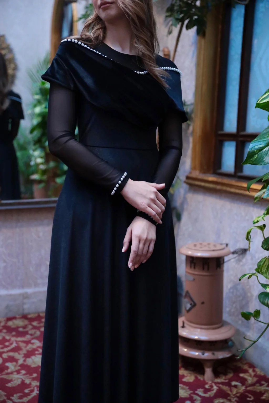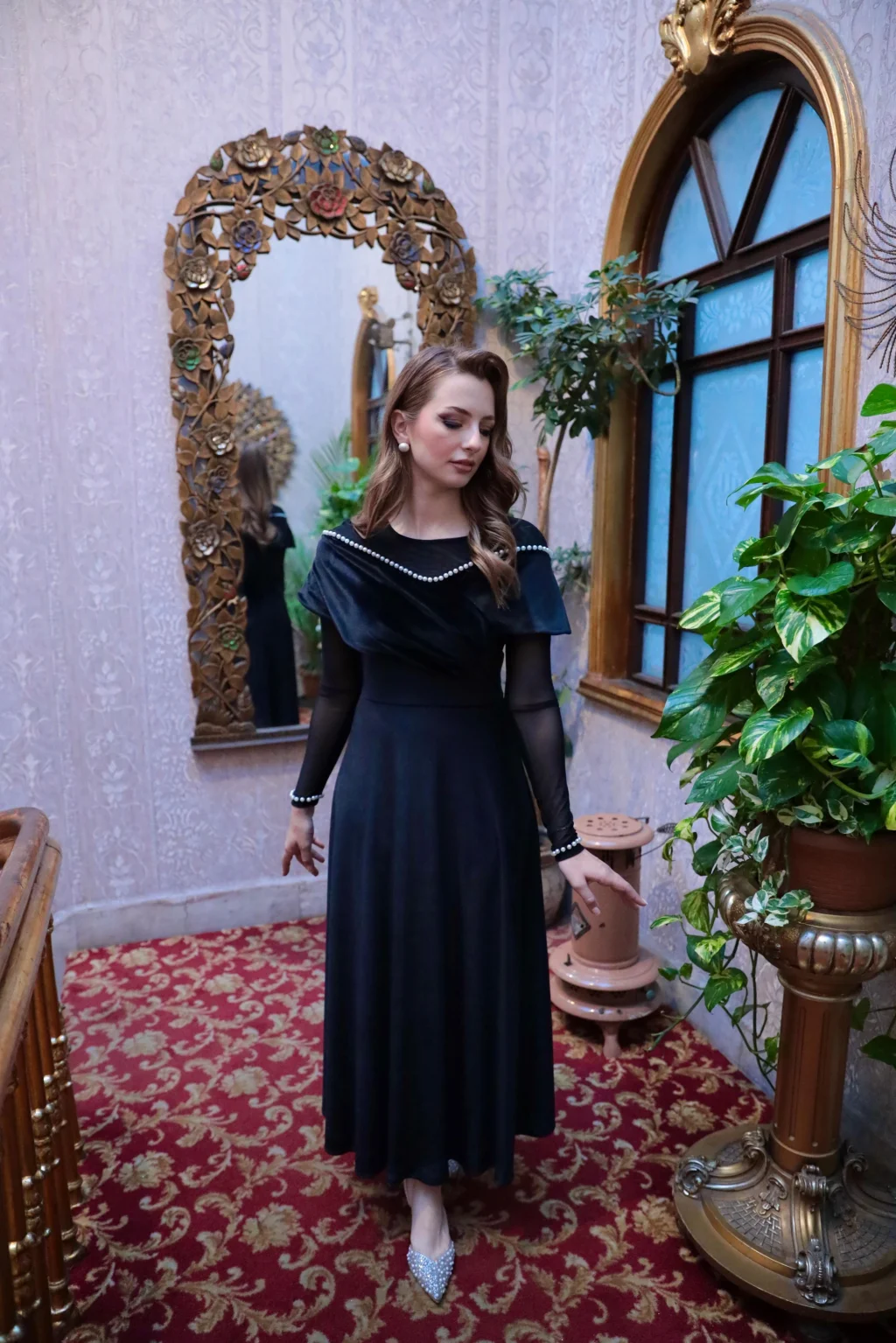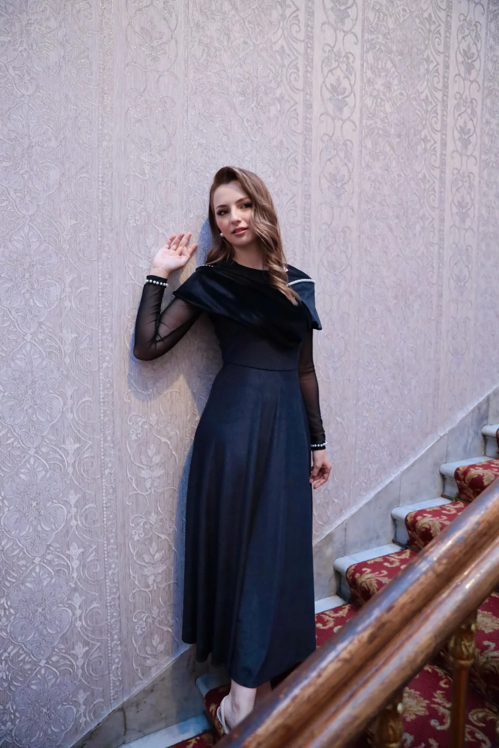 Helis Elegant Serisinin öne çıkan parçalarından biri olan bu özel tasarım elbise, zarif duruşu ve ince işçilikle hazırlanmış detaylarıyla dikkat çekiyor. Kadife kumaşın doğal ışıltısı, drapeli omuz tasarımı ile buluşarak her ortamda kendini gösteren güçlü bir siluet oluşturuyor. Kollarındaki transparan tül dokusu elbiseye hafiflik katarken, omuzdan bilek ucuna uzanan el işçiliği inci detaylar tasarıma sofistike bir dokunuş ekliyor.