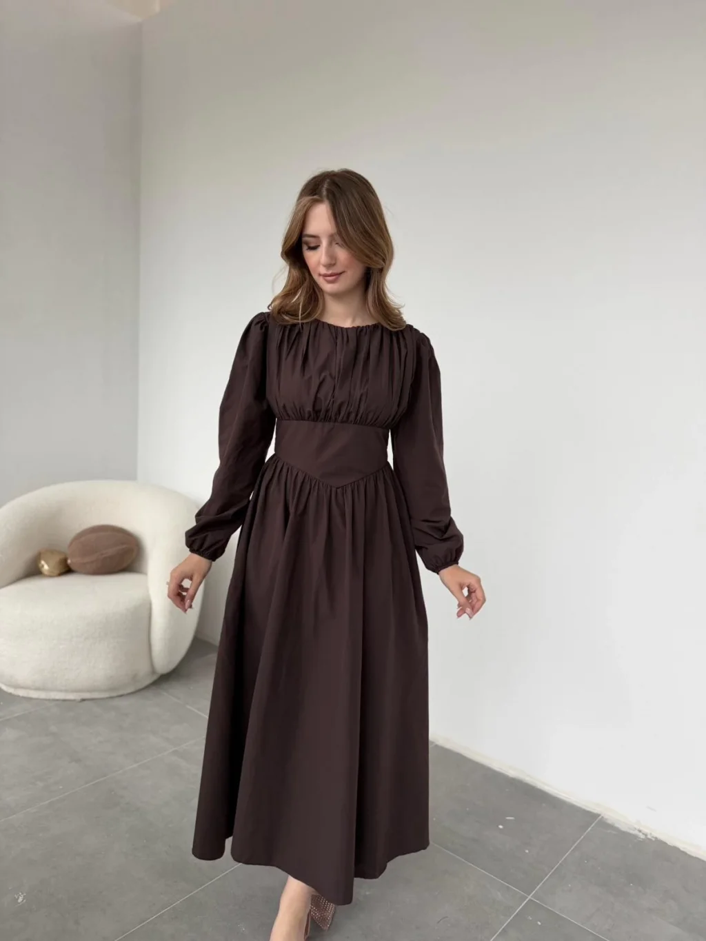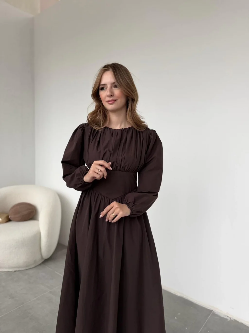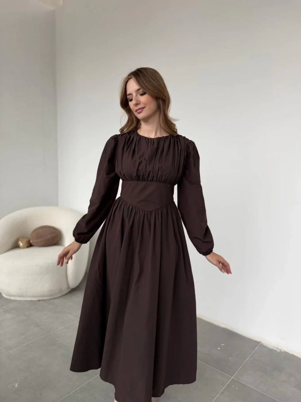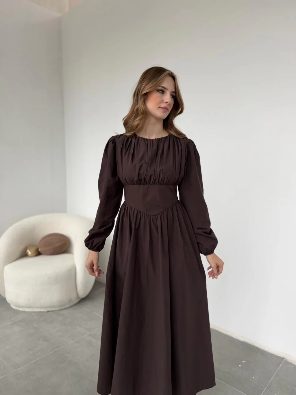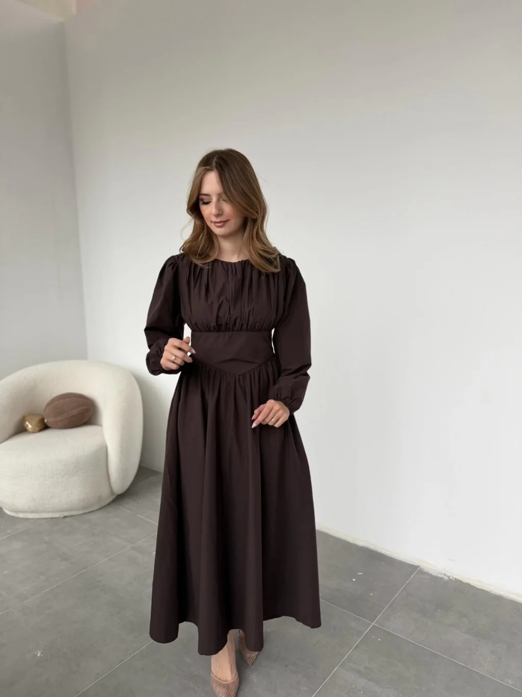 Zarif drapeleri ve bele oturan geniş korsaj detayıyla silueti anında incelten bu elbise; gündüzden geceye, davetten ofise birçok ortamda şık bir kurtarıcı. Dökümlü A-kesim eteği her adımda akışkan görünürken, lastikli manşetler konforu artırır. Sezon bağımsız kullanabileceğiniz, sade ama etkisi güçlü bir tasarım.