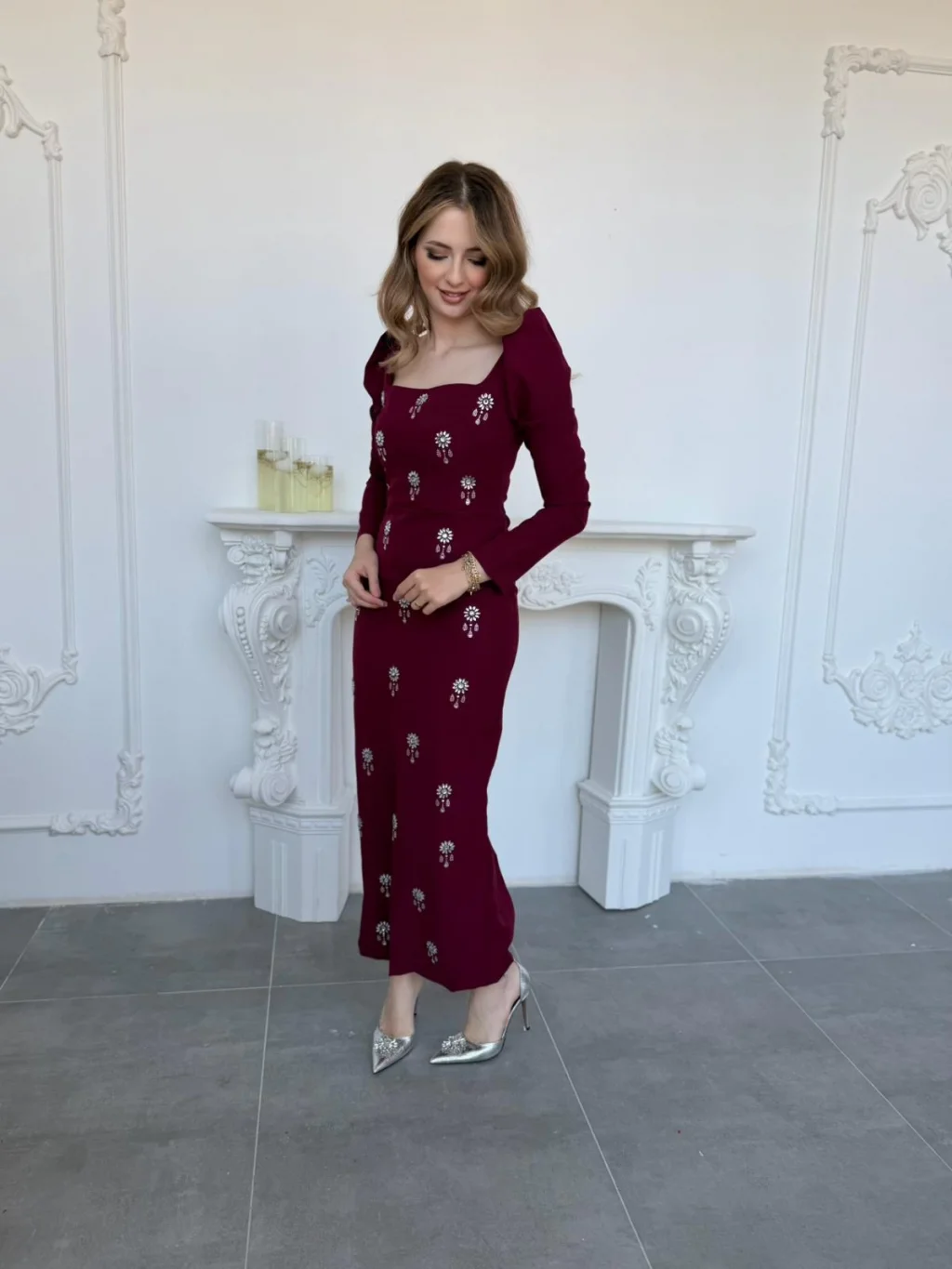 Zarafetin ışıltıyla buluştuğu bu özel tasarım elbise, davetlerden özel günlere kadar her ortamda göz kamaştırıcı bir şıklık sunuyor. Düz kesimiyle asil bir siluet oluştururken, üzerindeki taş işlemeler ışığı zarifçe yansıtarak şıklığınızı bir adım öne çıkarır. Güçlü omuz formu ve kare yaka detayı, modern ve zarif bir görünümü bir araya getirir.