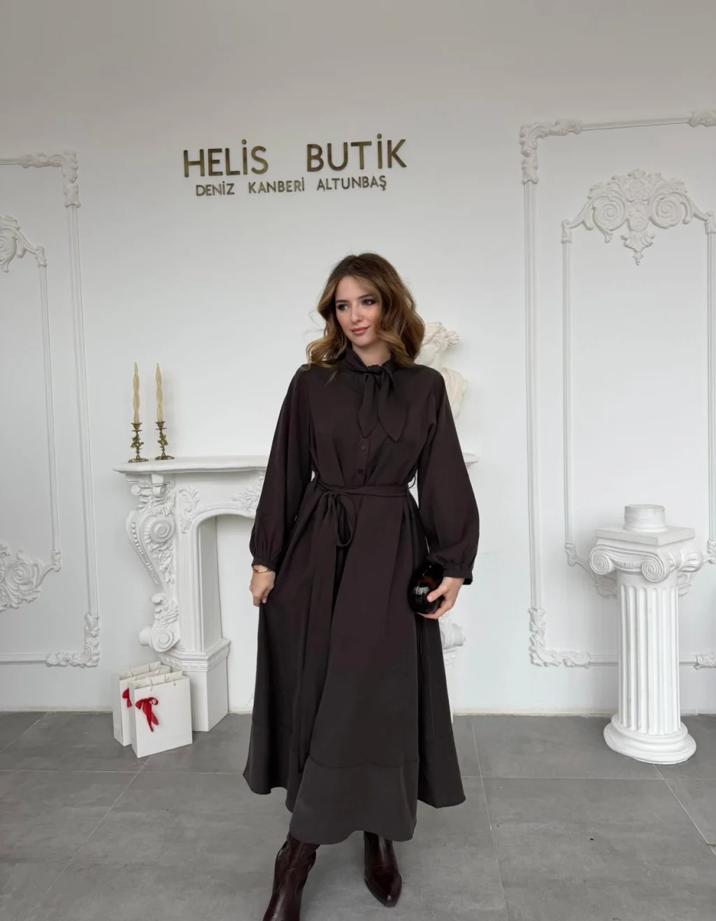 Model: Fular yaka bağlamalı, beli kuşaklı elbise.