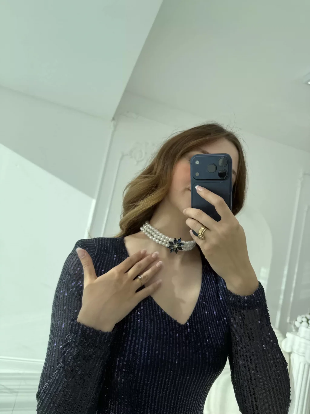 Lacivert Çiçek Taş Detaylı İnci Choker