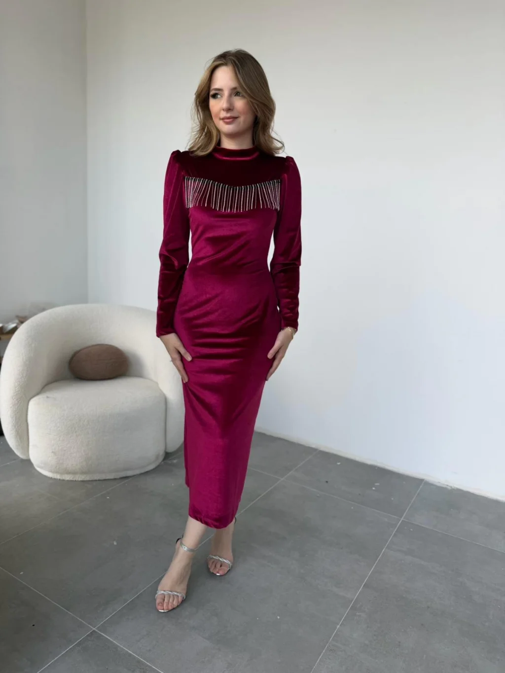 Zarafetin asil dokunuşuyla tasarlanan bu elbise, kadife kumaşın lüks duruşunu metal püskül detaylarıyla buluşturuyor. Yumuşak dokusu, vücudu zarifçe saran tam kalıp formu ve midi boy uzunluğu ile özel davetlerde şıklığınızı kusursuzlaştırır. Kadifenin doğal parlaklığı, omuzdan göğüs hattına uzanan metal püsküllerle ışıltı kazanır. Minimal takılarla tamamlayarak sade ama göz alıcı bir stil yakalayabilirsiniz.