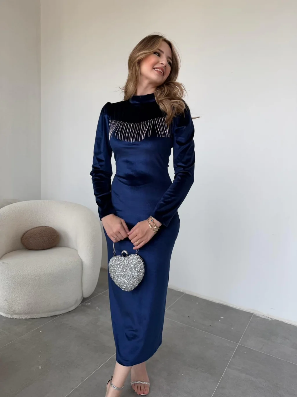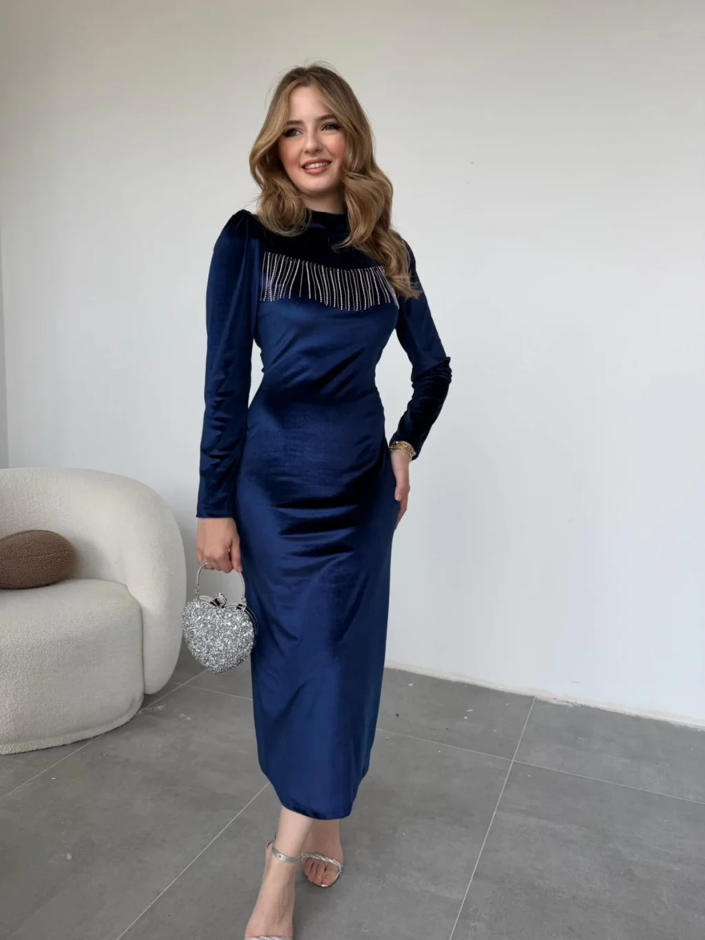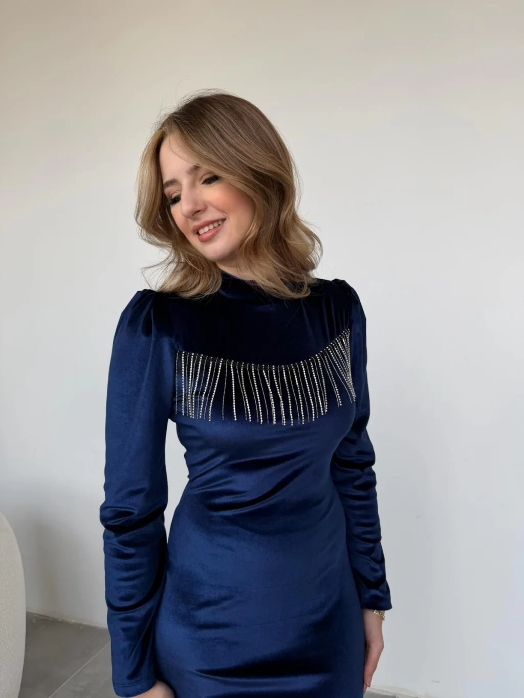 Göğüs Püskül Detaylı Kadife Lacivert Elbise