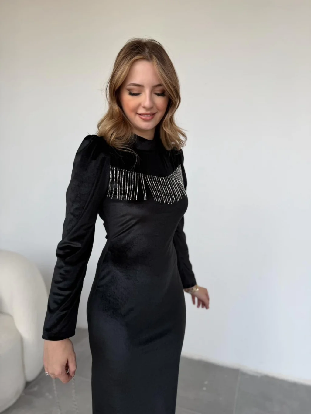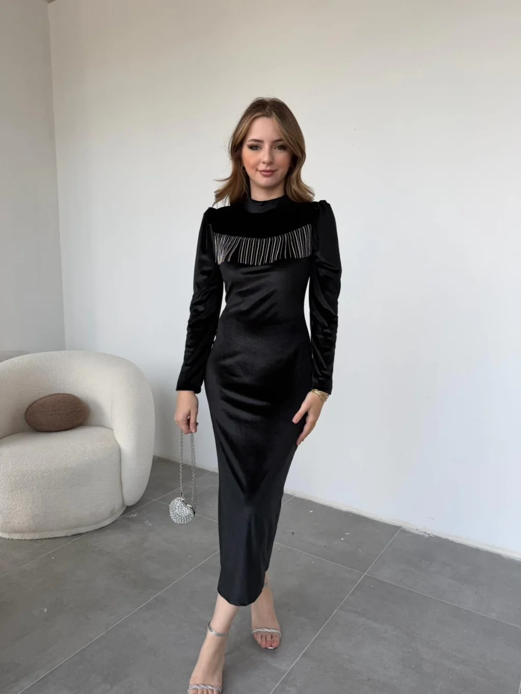 Zarafetin asil dokunuşuyla tasarlanan bu elbise, kadife kumaşın lüks duruşunu metal püskül detaylarıyla buluşturuyor. Yumuşak dokusu, vücudu zarifçe saran tam kalıp formu ve midi boy uzunluğu ile özel davetlerde şıklığınızı kusursuzlaştırır. Kadifenin doğal parlaklığı, omuzdan göğüs hattına uzanan metal püsküllerle ışıltı kazanır. Minimal takılarla tamamlayarak sade ama göz alıcı bir stil yakalayabilirsiniz.