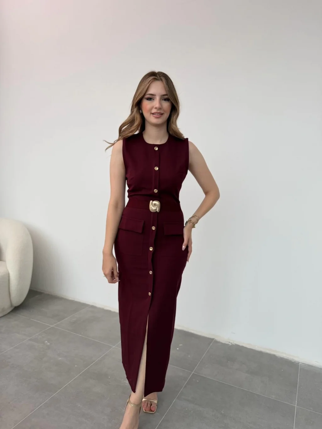 Önden tam boy düğme detayı, kemer tokası ve kalem formuyla modern bir siluet oluştururken; gold aksesuar detayları elbiseye sofistike bir dokunuş katıyor.