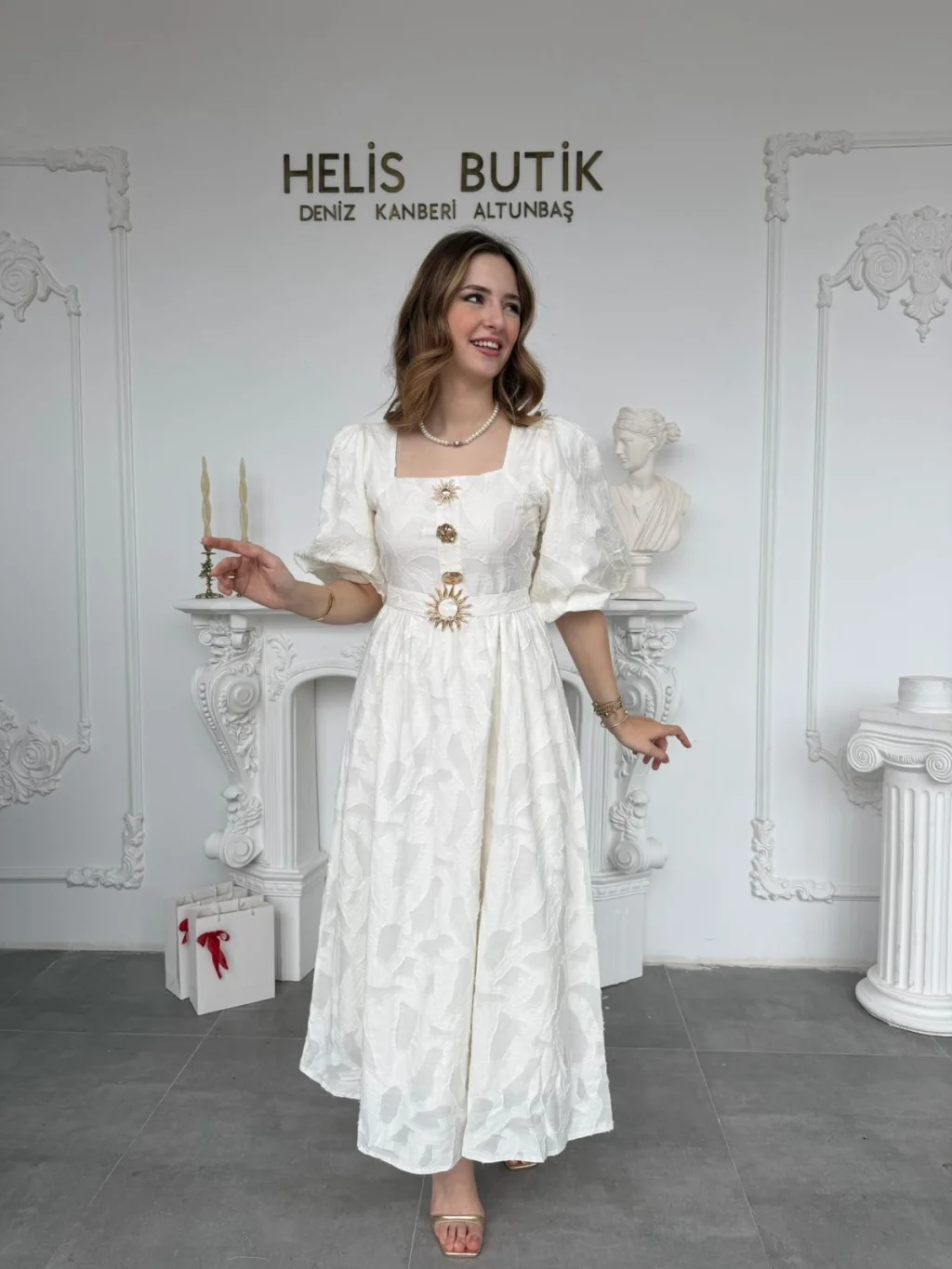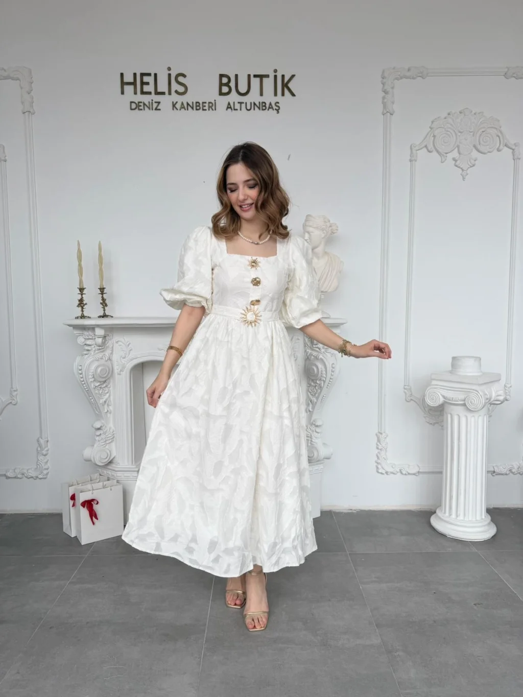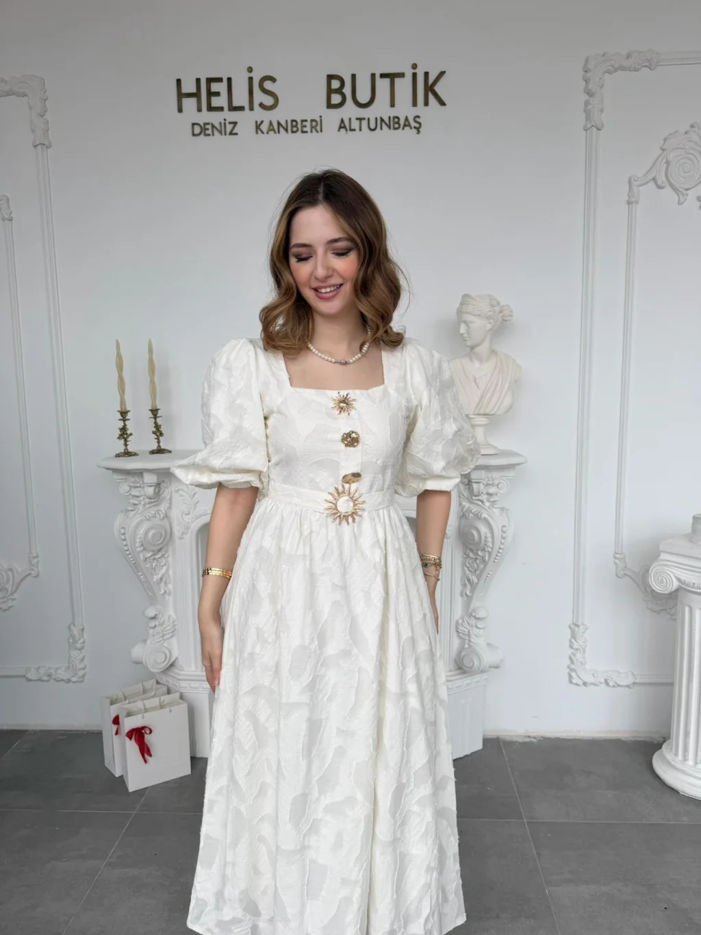 Zarafetin modern detaylarla buluştuğu o özel parçayı buldunuz. Özel kabartmalı dokusuyla dokunduğunuz an kalitesini hissettiren bu elbise, gardırobunuzun en iddialı parçası olmaya aday. Kare yaka kesimi ve omuzlardaki zarif balon kol detayıyla hem retro bir hava estiriyor hem de günümüz trendlerini yakalıyor.