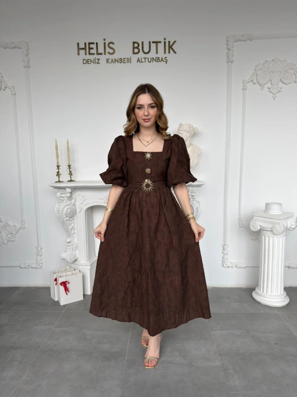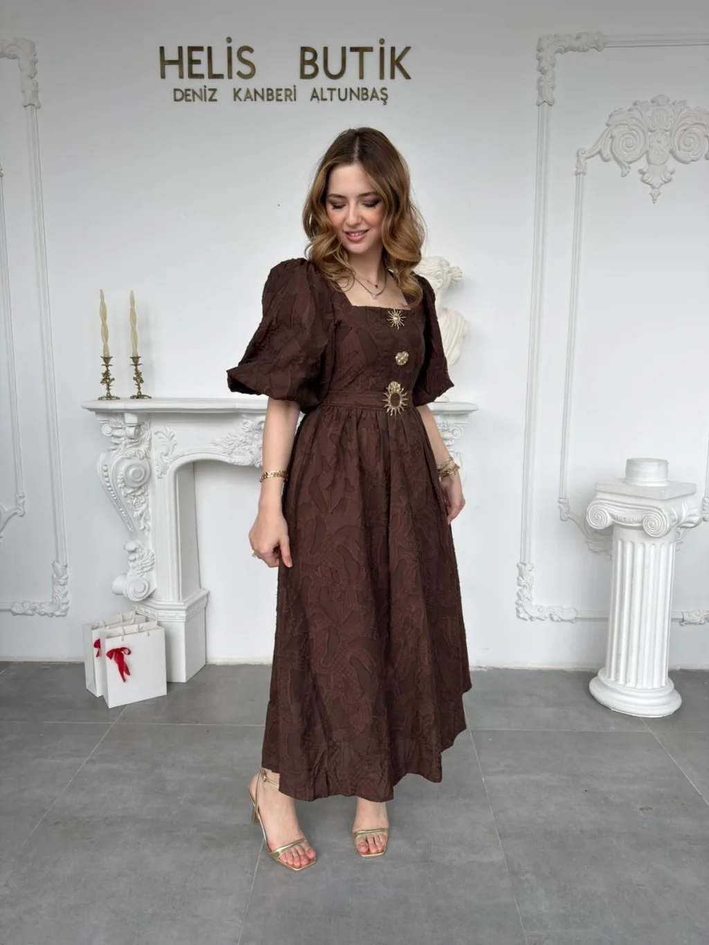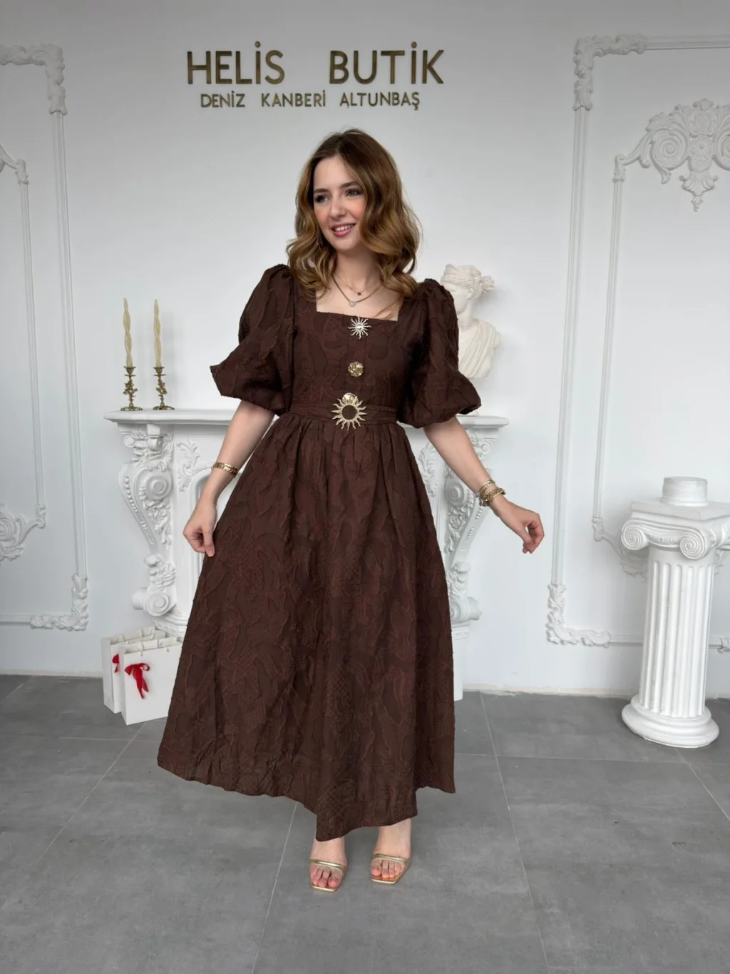 Gold Güneş Düğmeli Kabartma Dokulu Balon Kahve Elbise