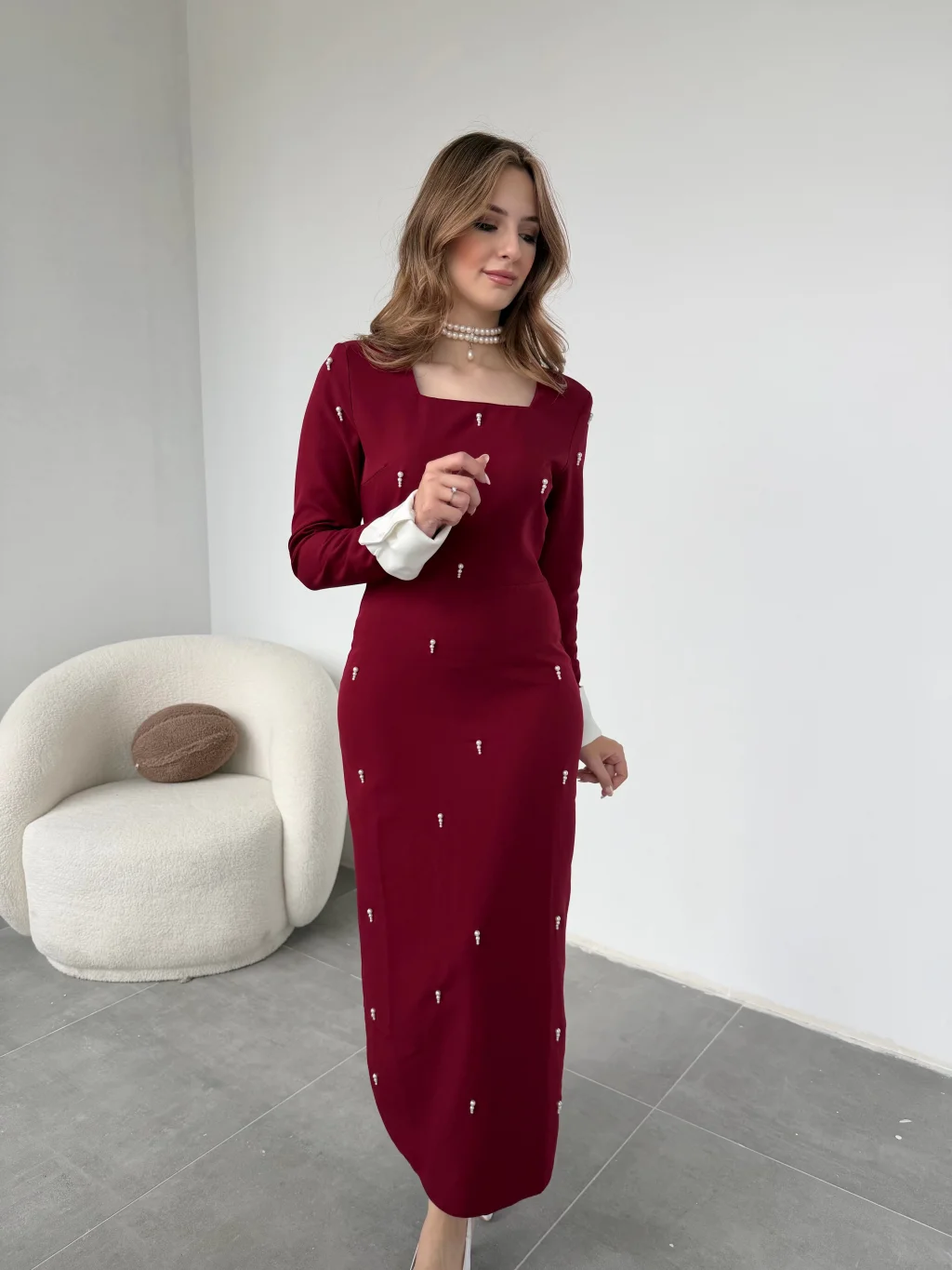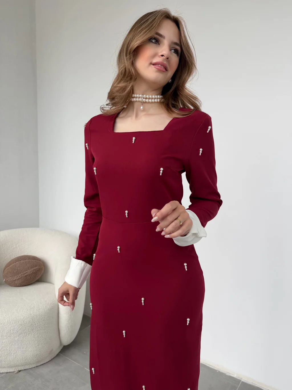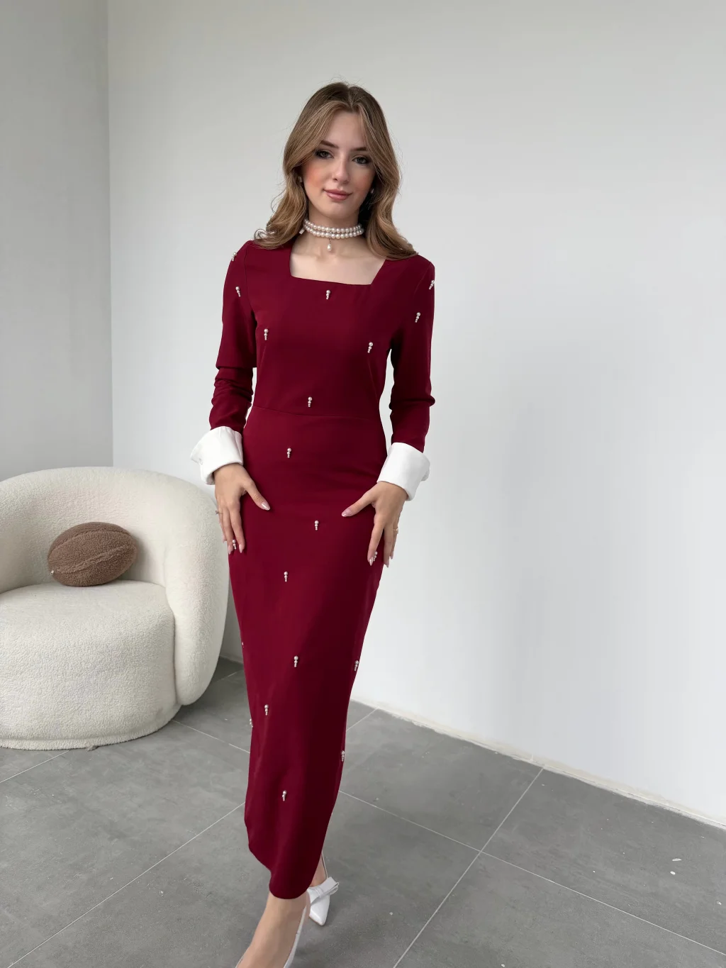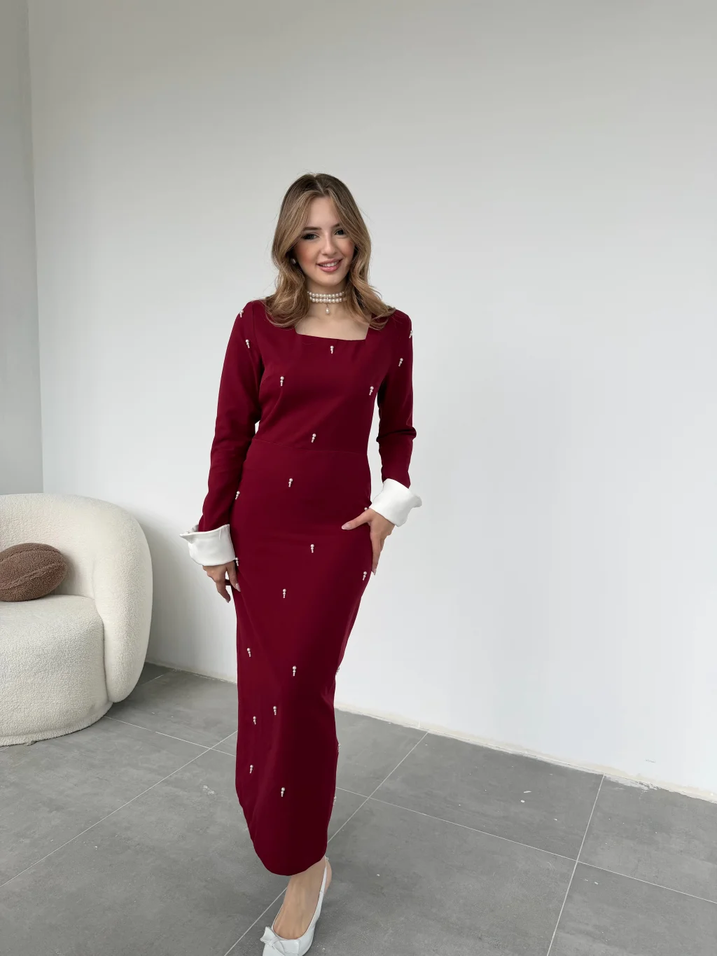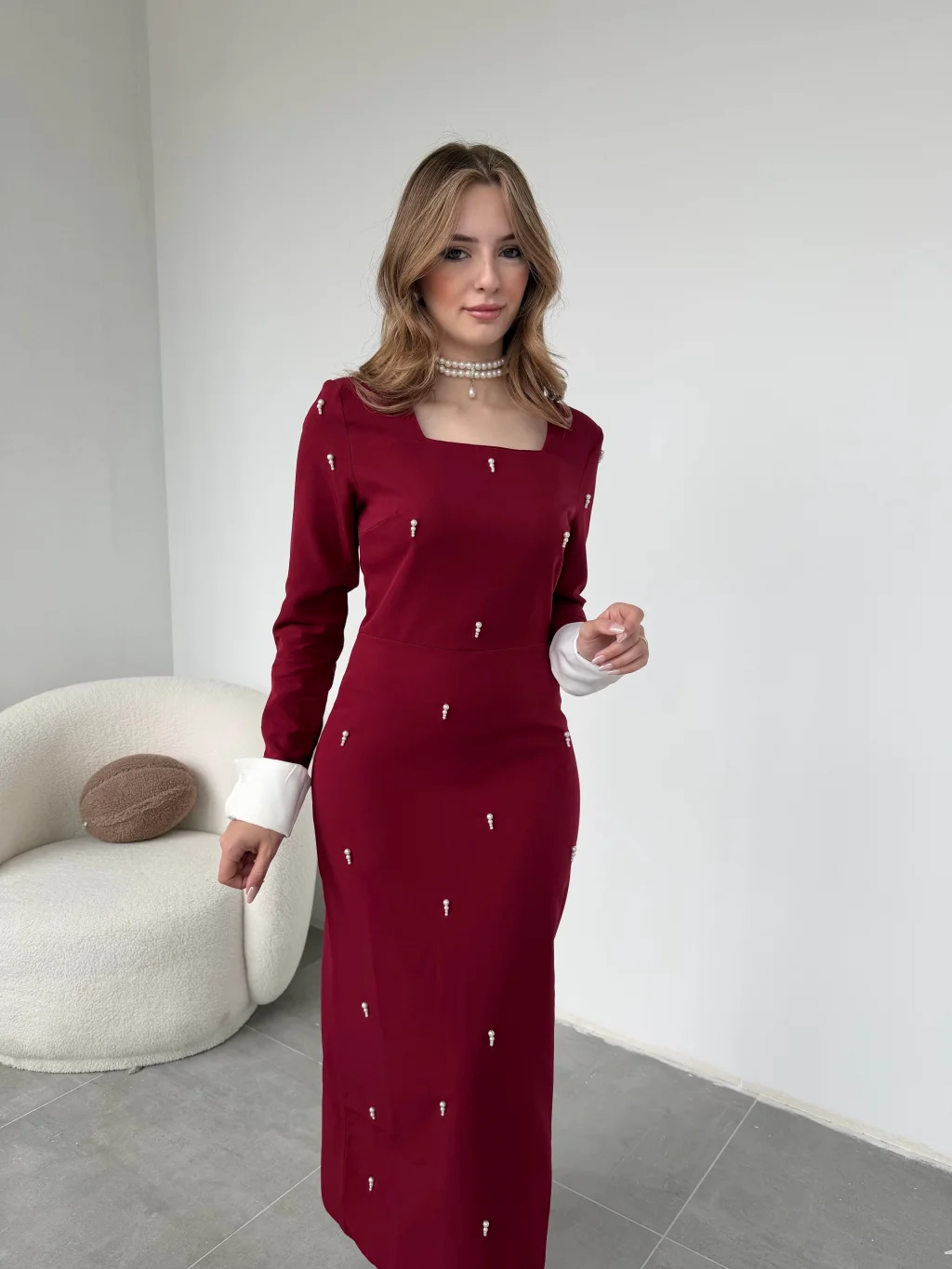 İnci Detaylı Kare Yaka Beyaz Manşetli Bordo Elbise