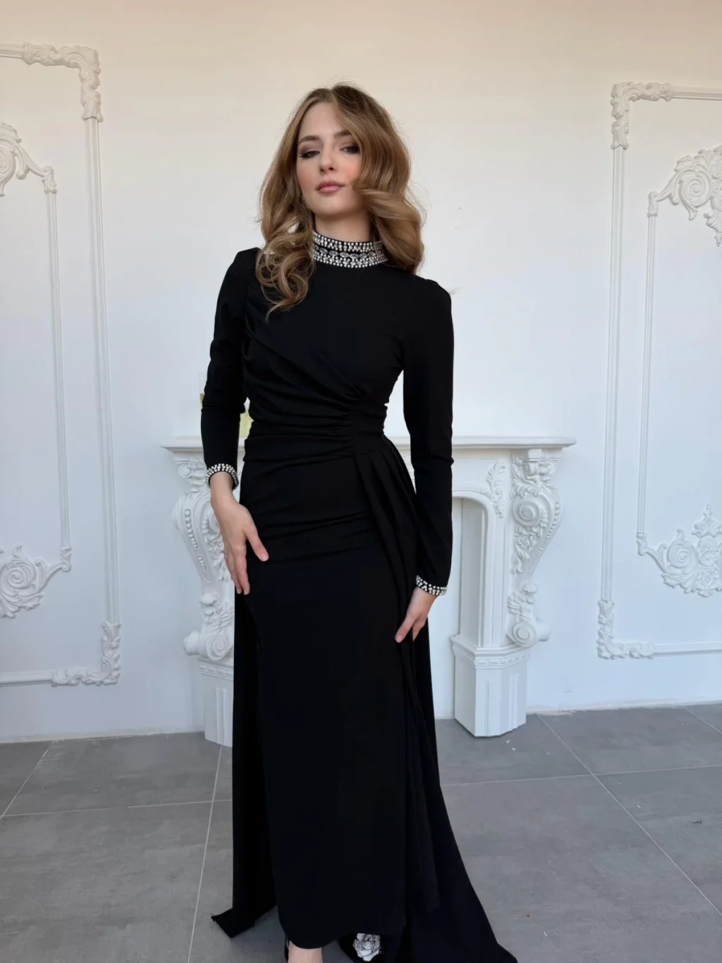 Zarafetin sade ama etkileyici bir hali! Işıltılı inci taş detaylarıyla tamamlanan bu özel tasarım, boydan dökümlü peleriniyle asil bir görünüm sunuyor. Düğün, nişan, davet ve özel akşam organizasyonları için şıklığıyla fark yaratmak isteyen kadınların favorisi olmaya aday.