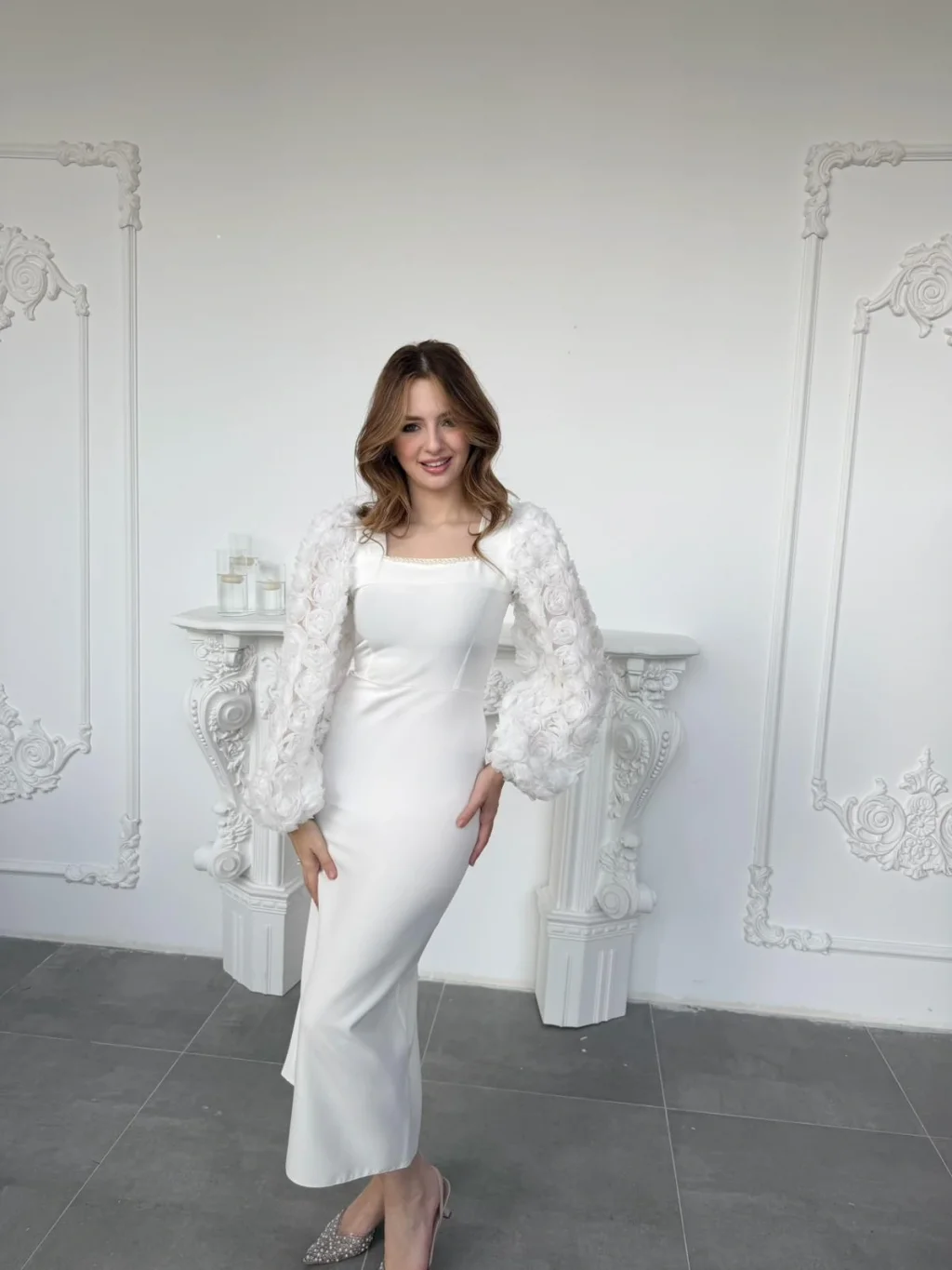 İnci Yaka ve Gül Aplike Kol Detaylı Beyaz Elbise