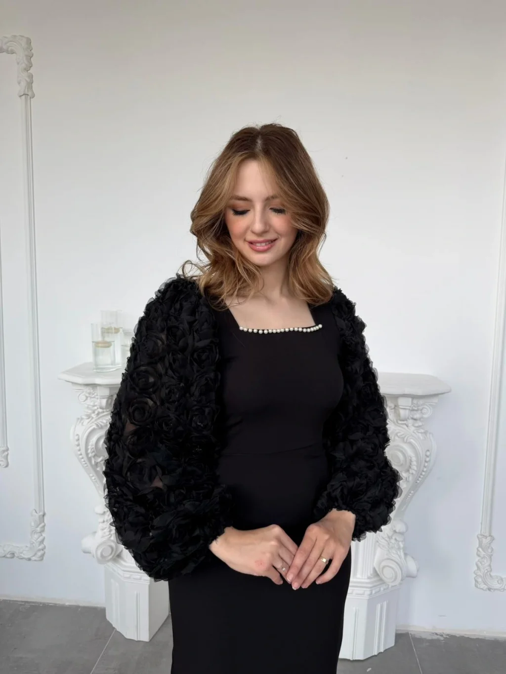 Modern şıklığı özel dokunuşlarla bir araya getiren bu tasarım, Helis Butik’in seçkin çizgisini taşıyan özel bir modeldir. Tam kalıp yapısı sayesinde vücuda yumuşak bir şekilde oturur ve sade kesimi, dikkat çekici kol detaylarıyla birleşerek güçlü bir siluet oluşturur. Kollarında kullanılan özel gül aplike kumaş, elbisenin karakterini öne çıkarırken, yaka kısmındaki inci işleme zarif bir tamamlayıcı etki yaratır. Sadece Helis Butik’e özel bu model; davet, söz, nişan, özel buluşma ve tüm şık kombinlerde rahatlıkla tercih edilebilir.