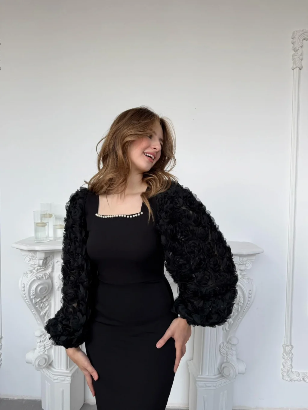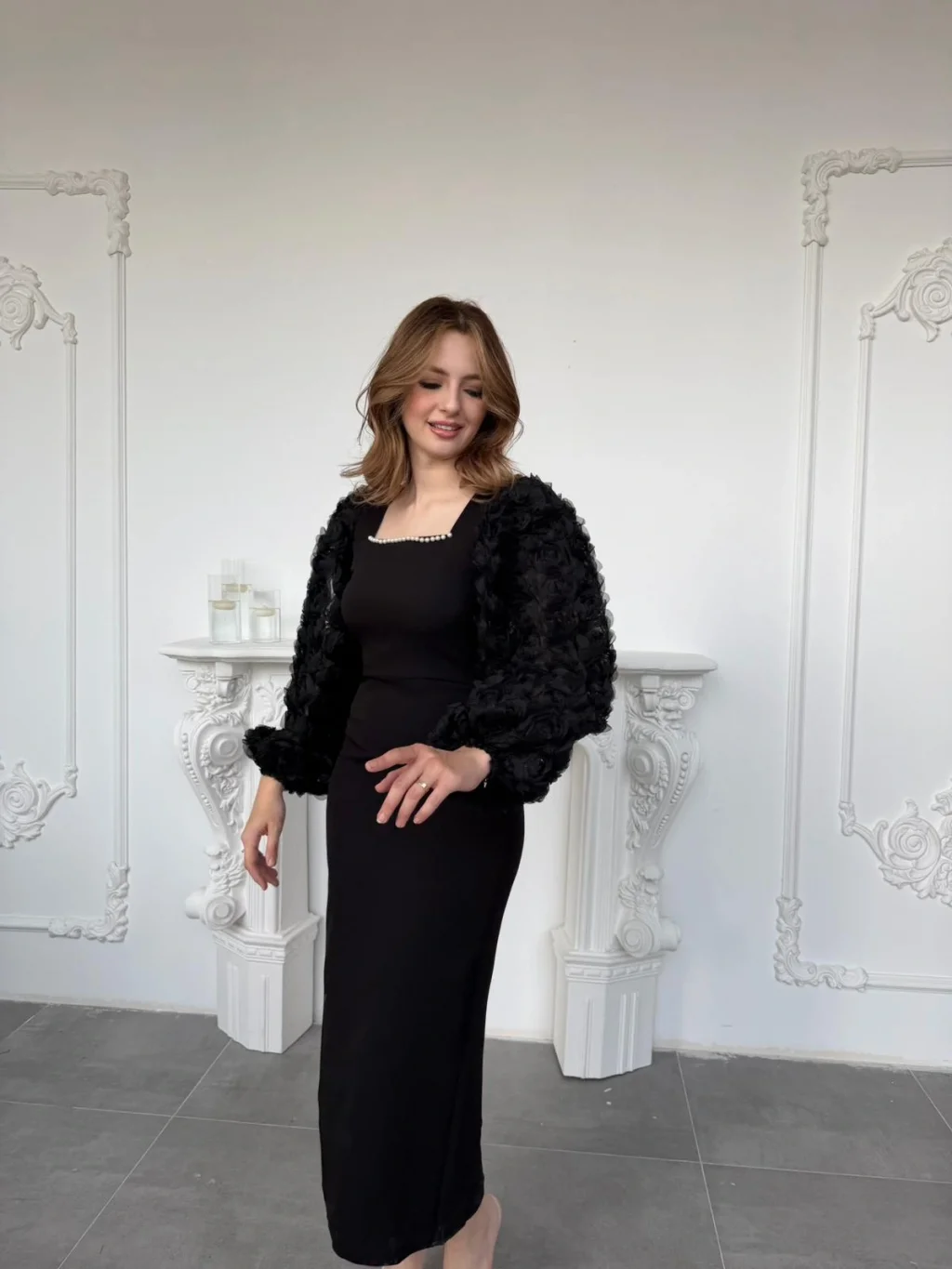 İnci Yaka ve Gül Aplike Kol Detaylı Siyah Elbise