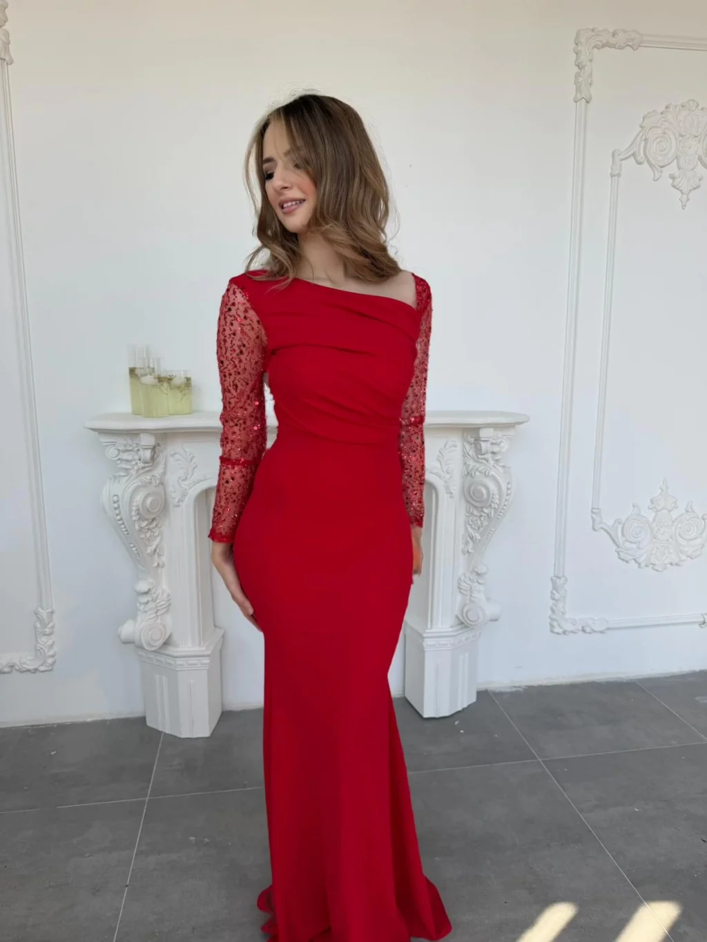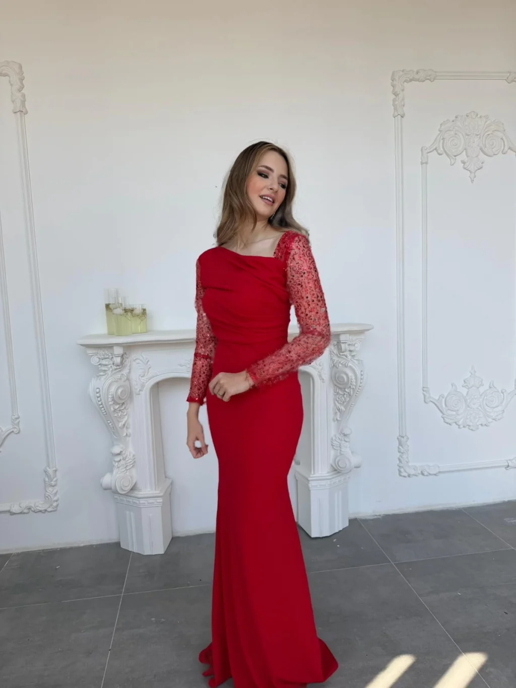 Vücudu saran zarif kesimiyle feminen bir siluet oluştururken, tül üzerine işlenmiş ışıltılı kollar modern ve şık bir görünüm sunuyor.
