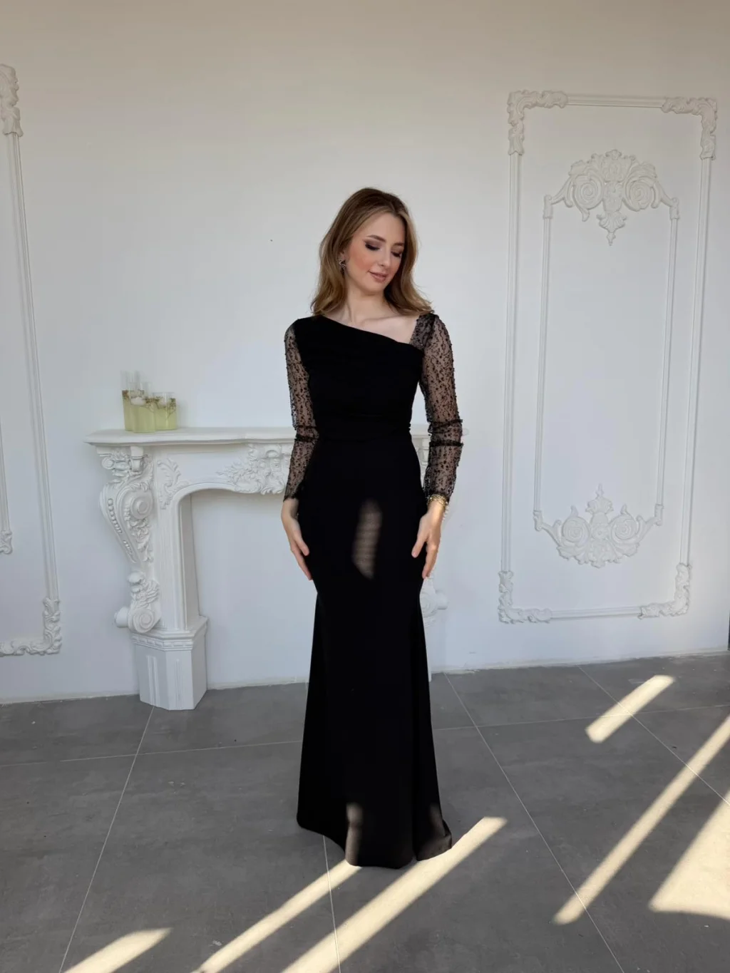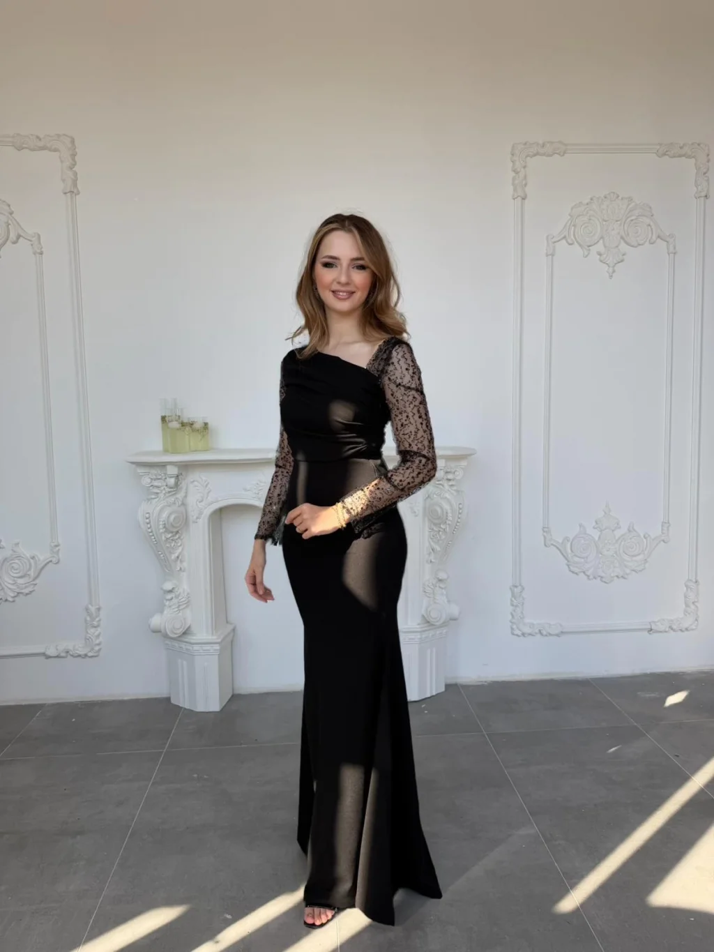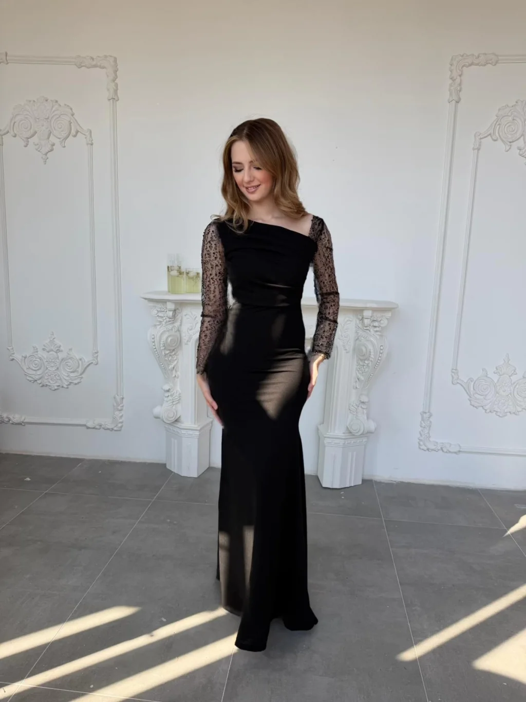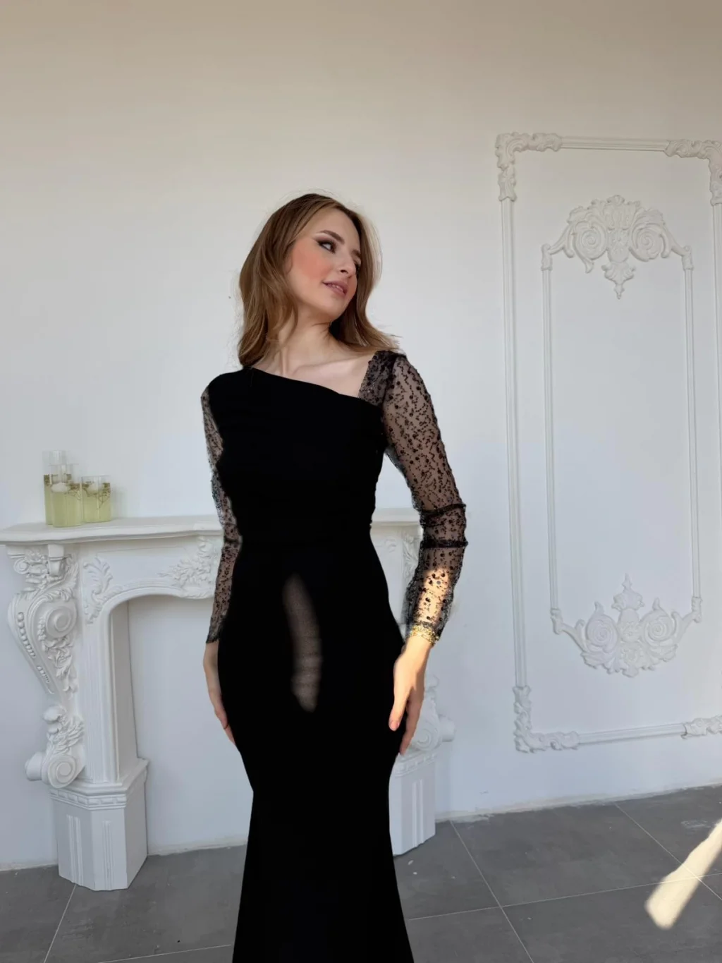 Vücudu saran zarif kesimiyle feminen bir siluet oluştururken, tül üzerine işlenmiş ışıltılı kollar modern ve şık bir görünüm sunuyor.