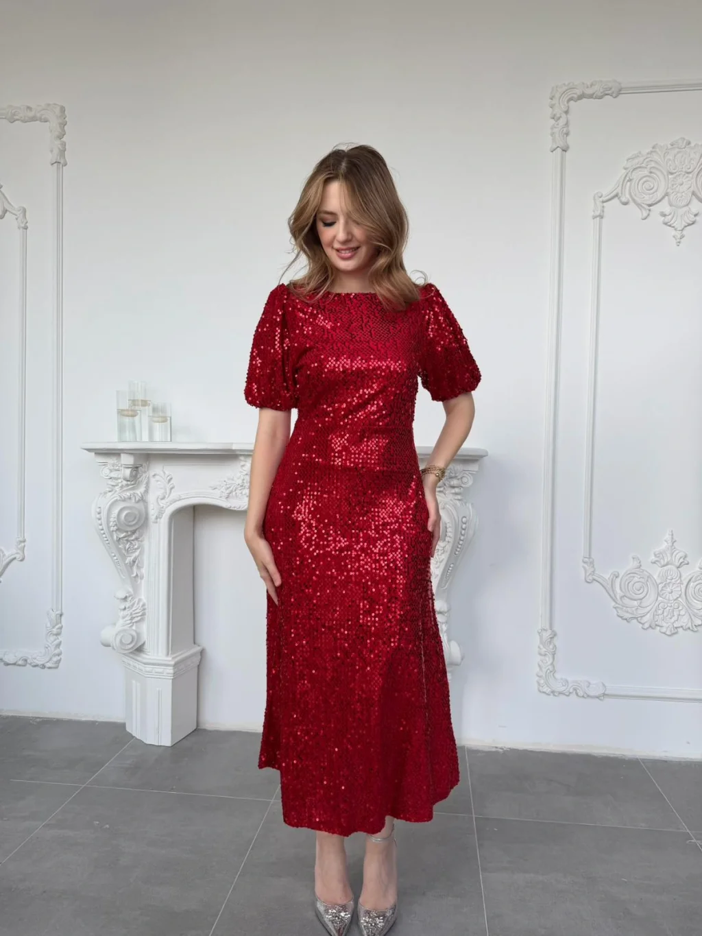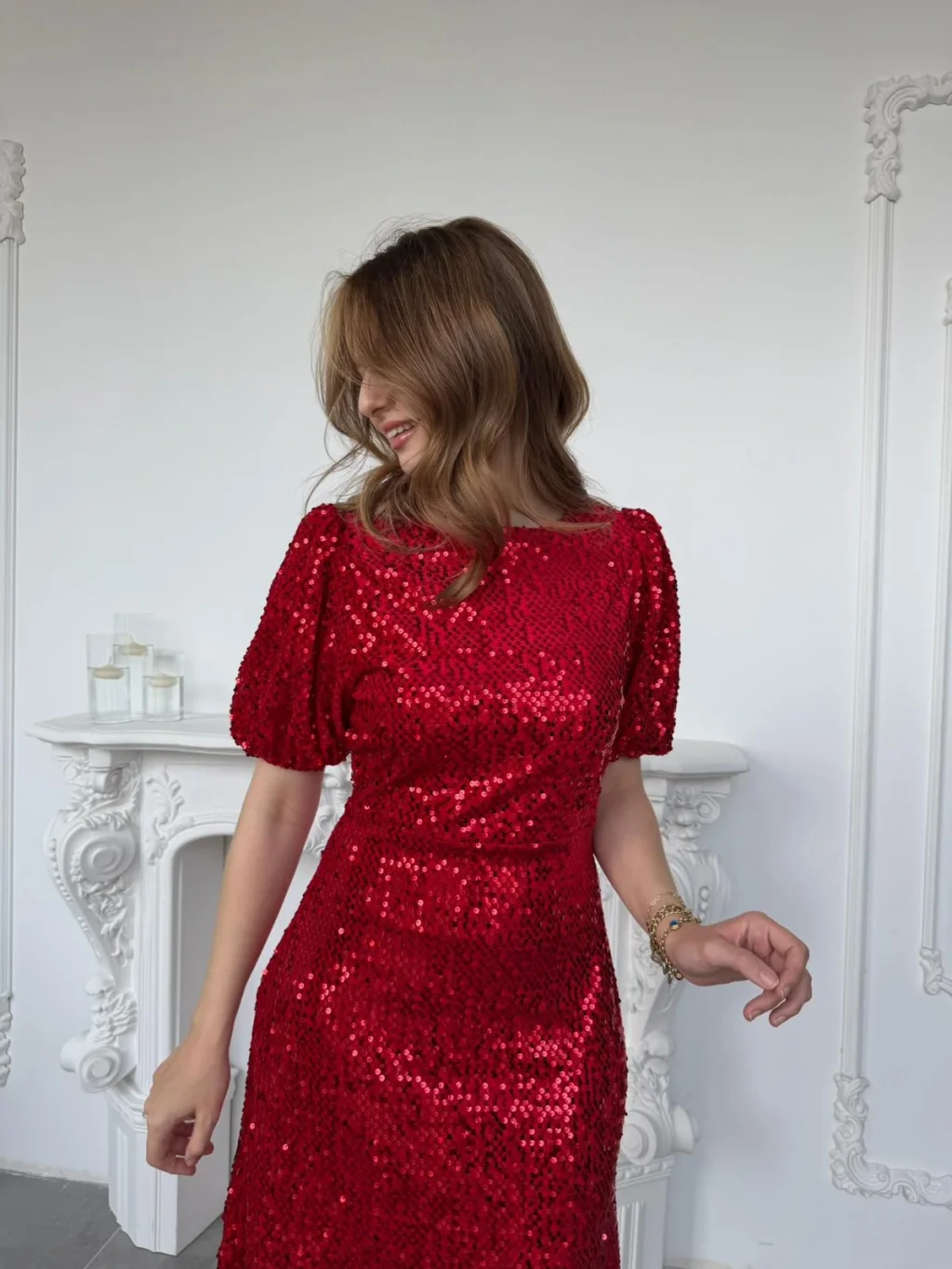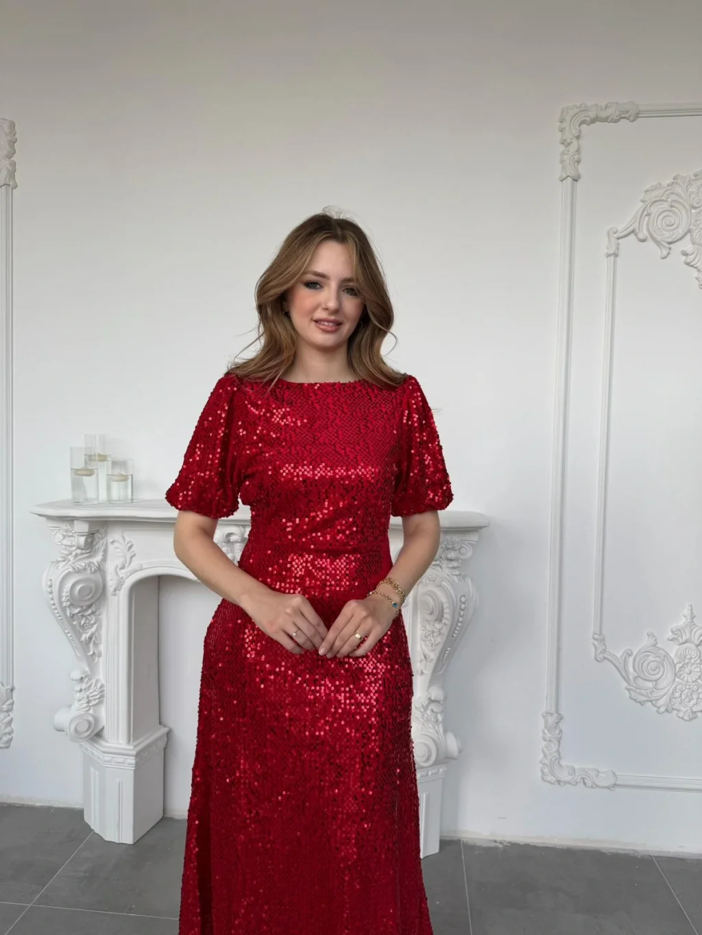 Işıltılı Vatkalı Pul Payet Kırmızı Elbise