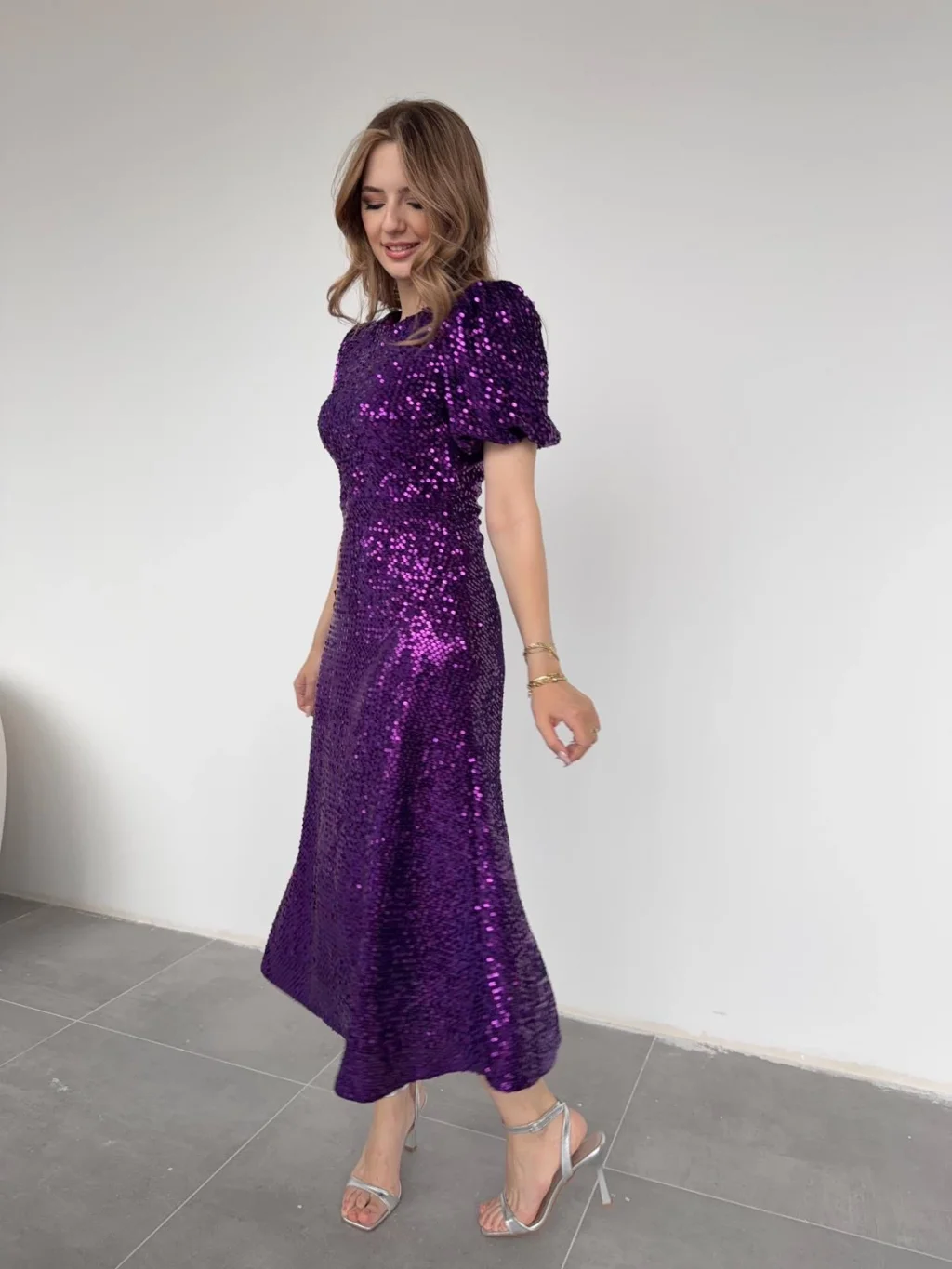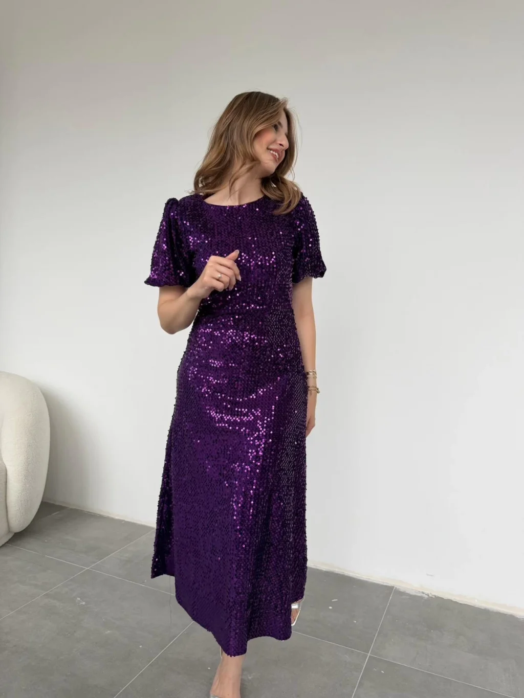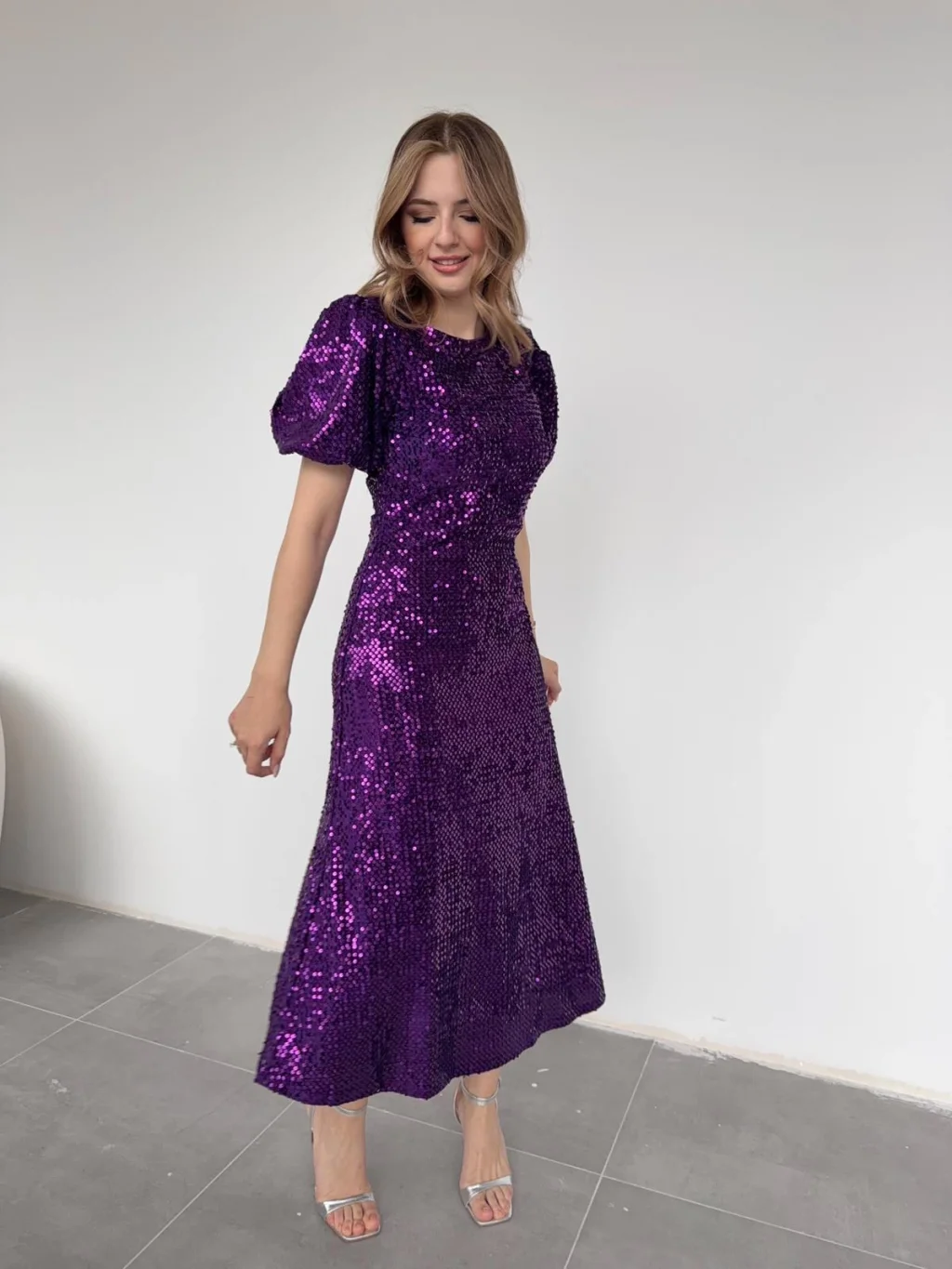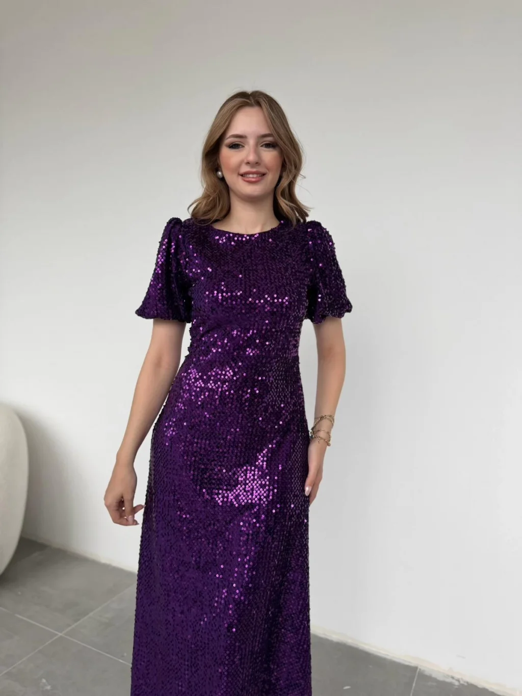 Işıltılı Vatkalı Pul Payet Mor Elbise