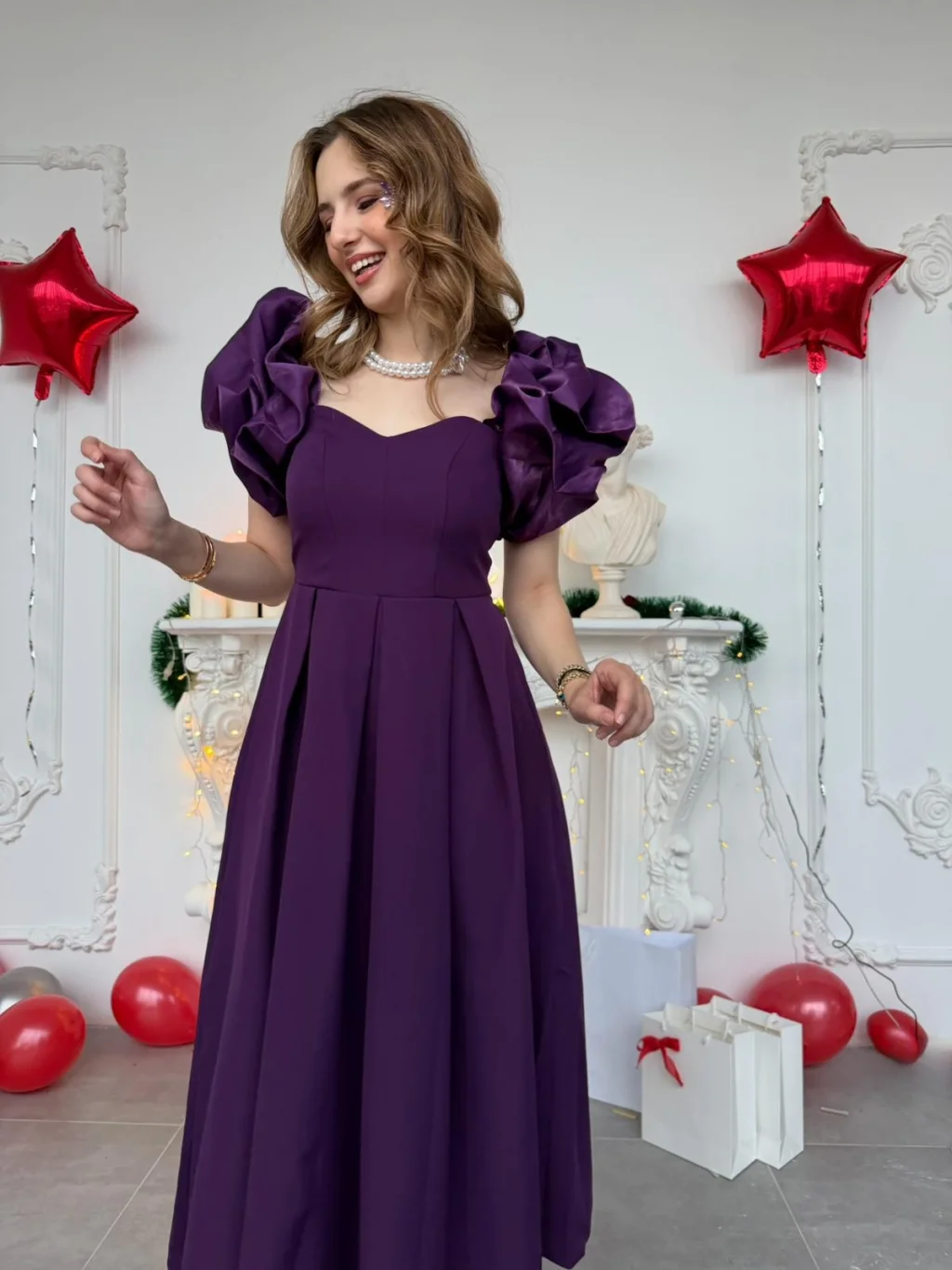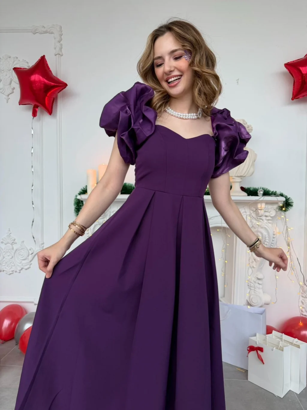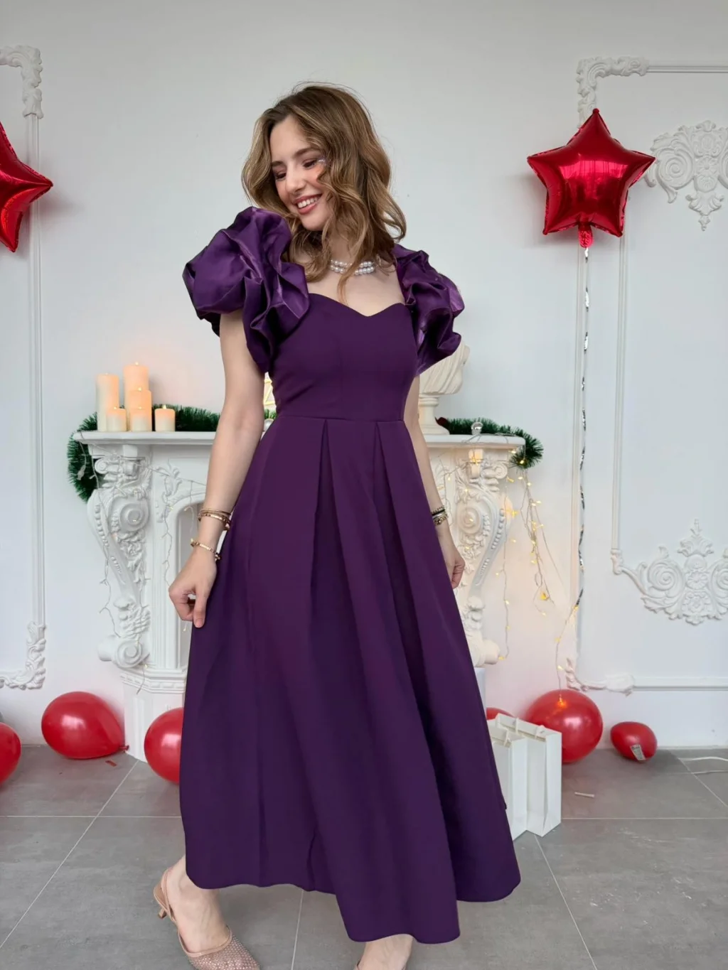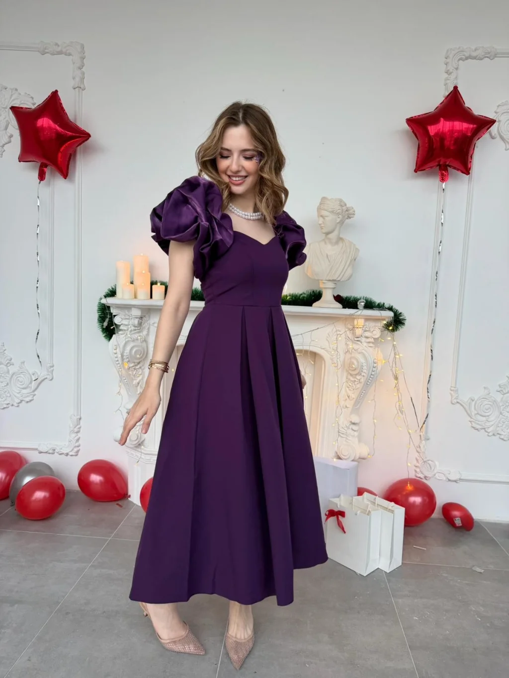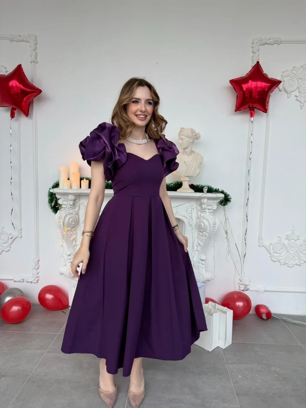 Özel günlerin en çok konuşulan ismi olmaya hazır mısınız? Bu eşsiz mor abiye elbise, zarafeti ve modern detayları bir araya getirerek size hayal ettiğiniz görünümü sunuyor. Elbisenin en dikkat çekici özelliği olan omuzlardaki devasa volanlar, feminen bir silüet oluştururken kalp yaka kesimiyle de dekoltenize şık bir vurgu yapıyor.