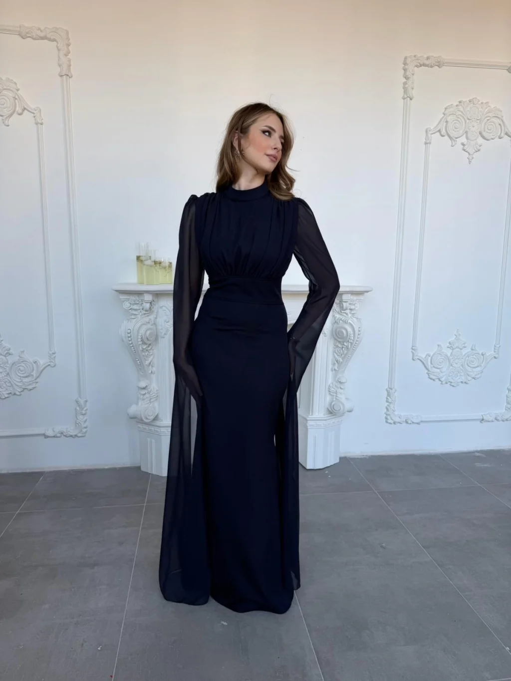 Korse Detaylı Tül Kollu Uzun Lacivert Elbise