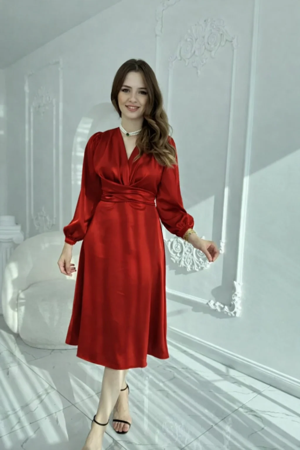 Kuşaklı, Dökümlü ve Şık Tensel Saten Kırmızı Elbise