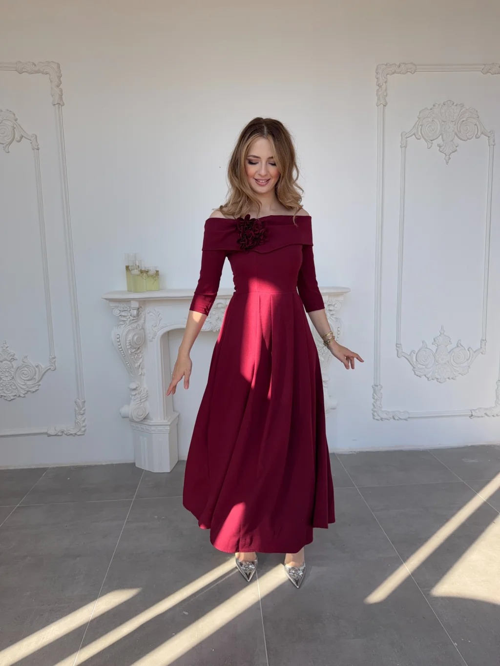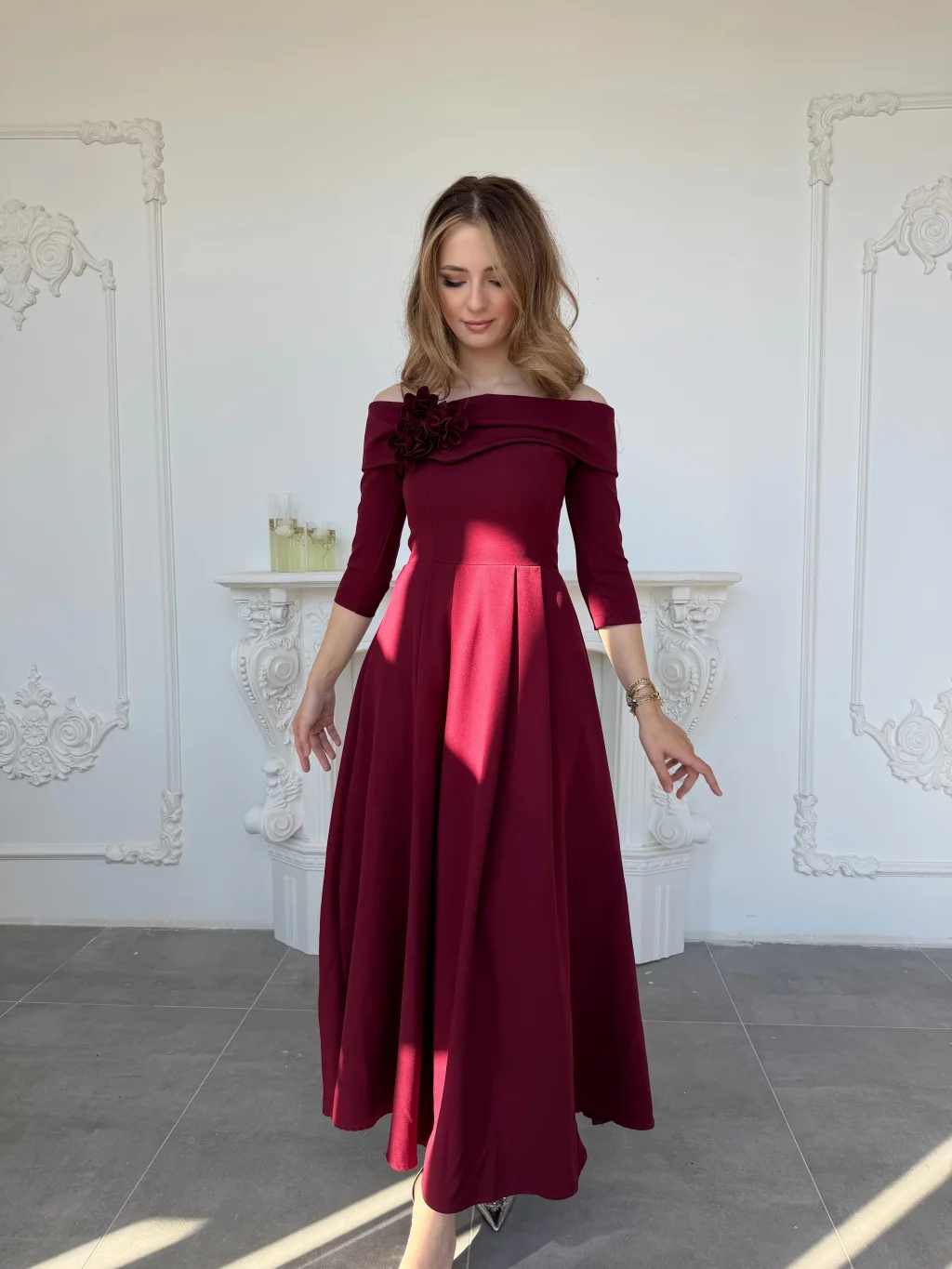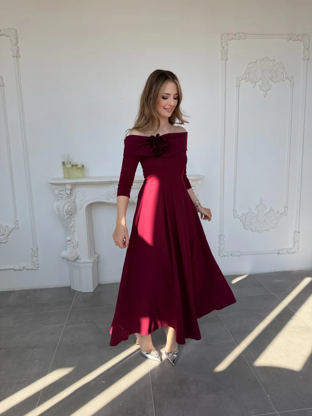Omuzdan açık kesimi ve zarif çiçek detayıyla dikkat çeken bu model, özel davetlerden mezuniyet kutlamalarına kadar birçok ortamda zarif bir duruş sergilemek isteyenler için tasarlandı. Akışkan formu ve dökümlü eteğiyle hem konfor hem de şıklık sunar. Tam kalıp yapısı sayesinde kendi bedeninizi tercih ederek rahat bir uyum yakalayabilirsiniz.