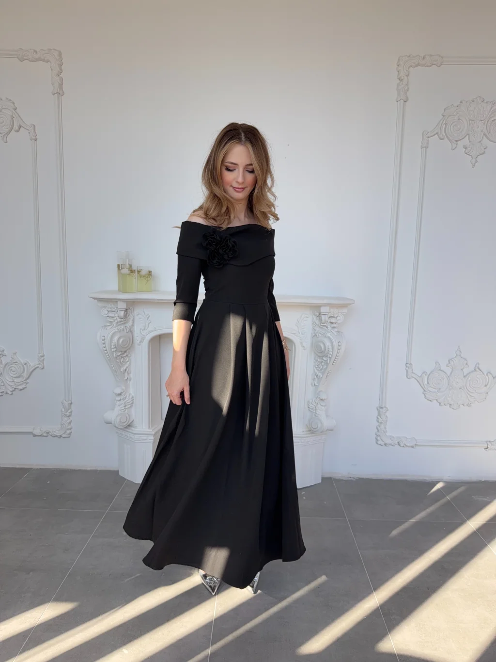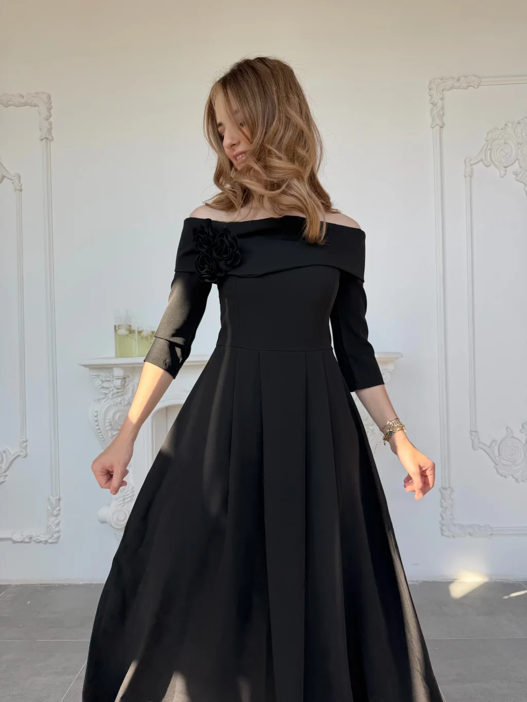 Omuzdan açık kesimi ve zarif çiçek detayıyla dikkat çeken bu model, özel davetlerden mezuniyet kutlamalarına kadar birçok ortamda zarif bir duruş sergilemek isteyenler için tasarlandı. Akışkan formu ve dökümlü eteğiyle hem konfor hem de şıklık sunar. Tam kalıp yapısı sayesinde kendi bedeninizi tercih ederek rahat bir uyum yakalayabilirsiniz.