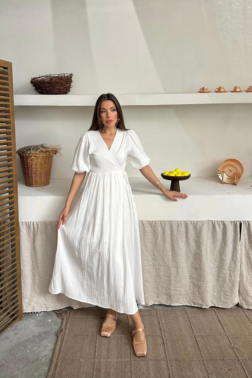 Müslin Kumaş Kuşaklı Uzun Beyaz Elbise