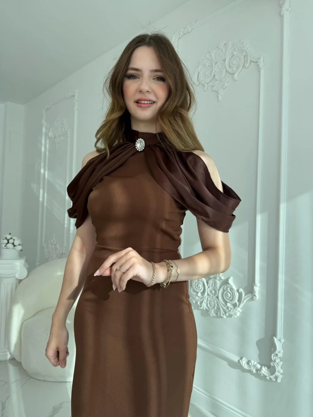 Omuz Detaylı Yaka Broşlu Kahve Abiye Elbise
