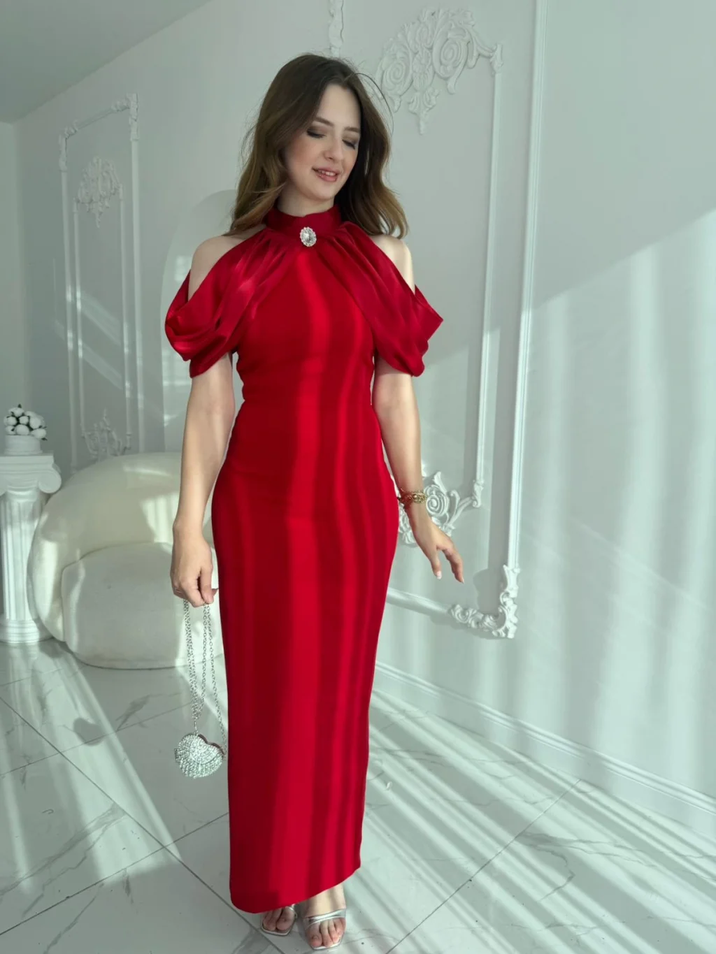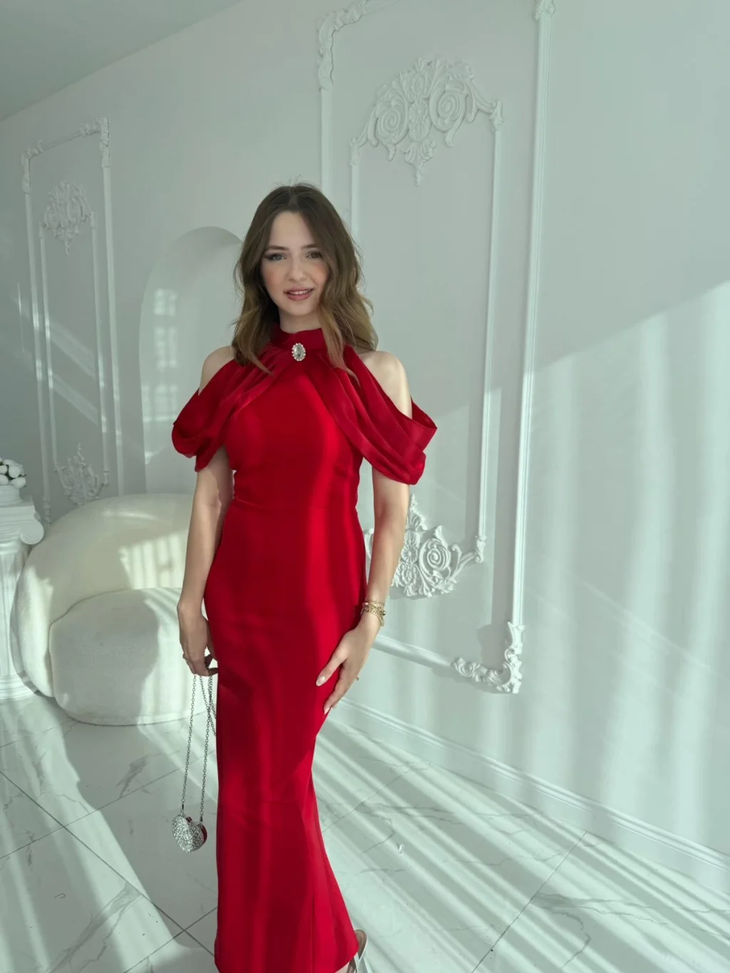 Şıklığı modern detaylarla buluşturan bu özel tasarım abiye, zarif omuz kesimiyle dikkat çekiyor. Omuz kısmındaki double saten kumaş, dökümlü ve asil bir hava katarken; vücudu saran dokuma atlas kumaşı ise şıklığı ve zarafeti ön plana çıkarıyor. Yüksek yaka kısmında yer alan broş detayı, tasarıma sofistike bir dokunuş ekliyor. Tam kalıp formu ile vücudu kusursuz şekilde kavrayan bu elbise; davetlerden özel gecelere, nişan ve söz törenlerinden şık kutlamalara kadar birçok ortamda zarif bir seçim olacak.