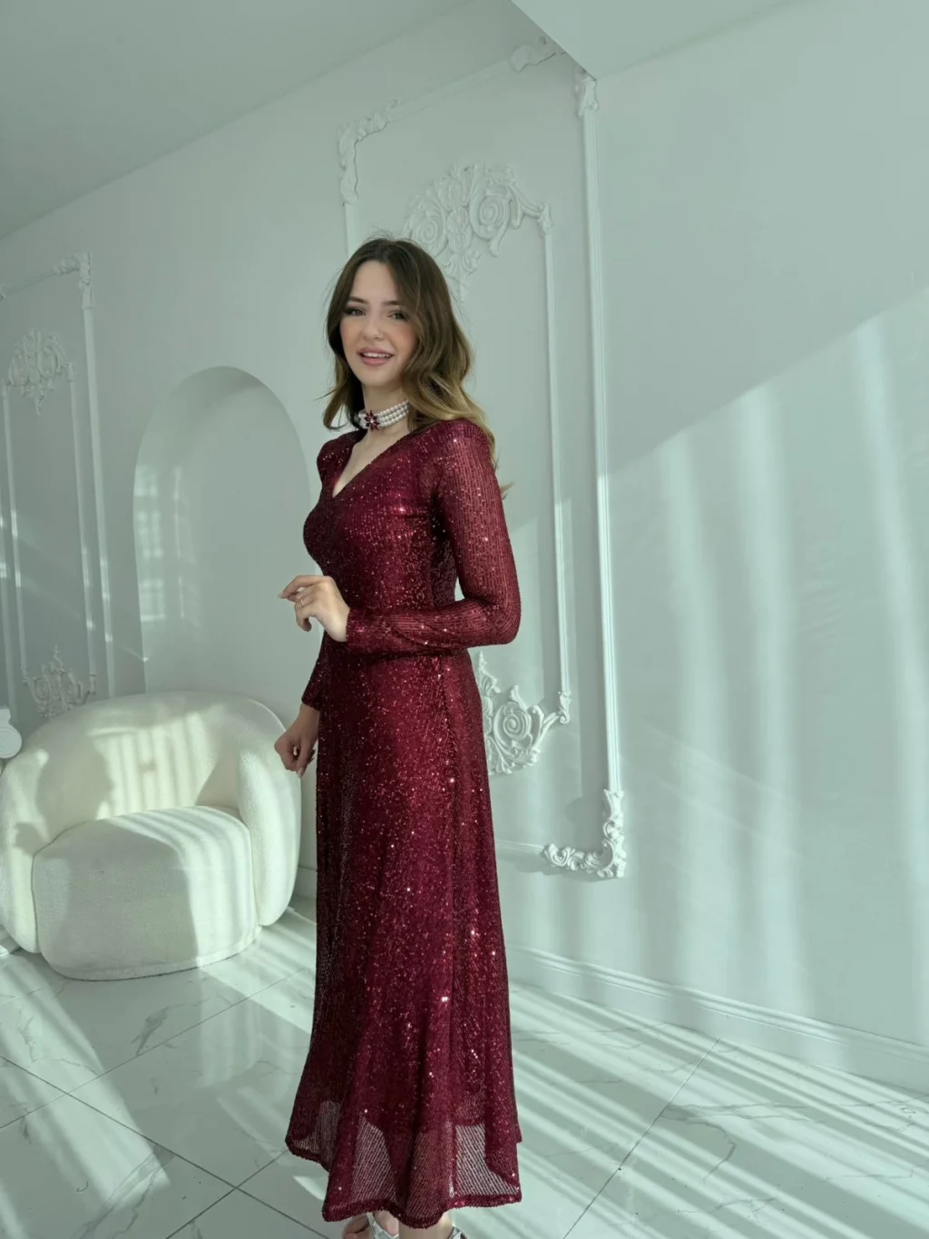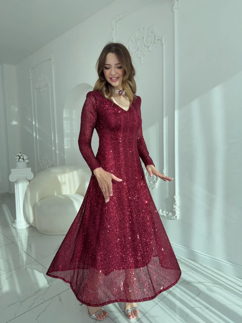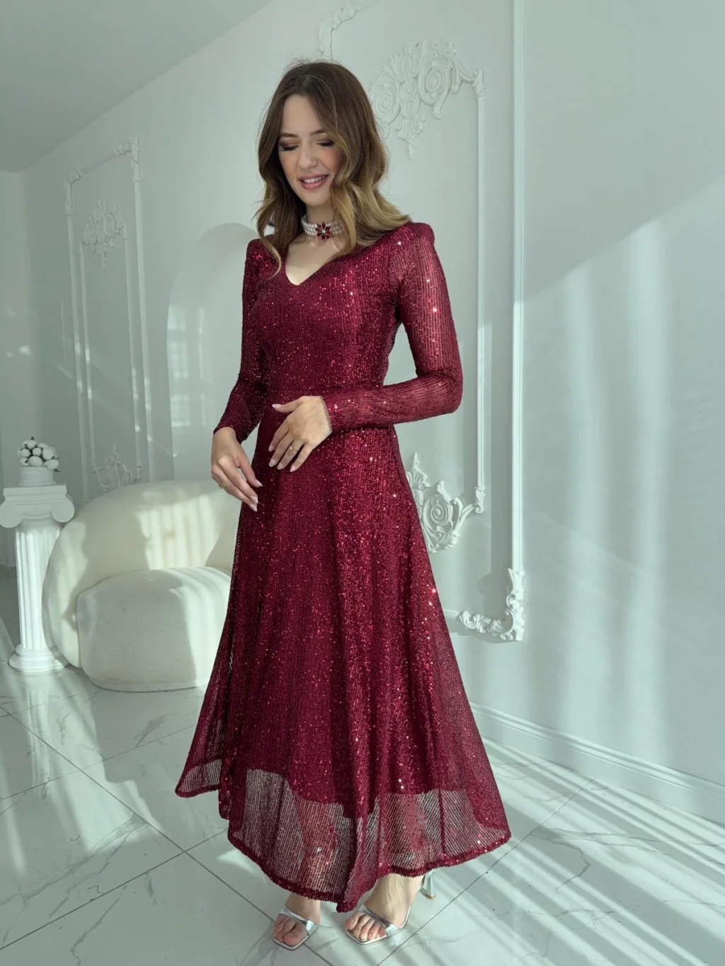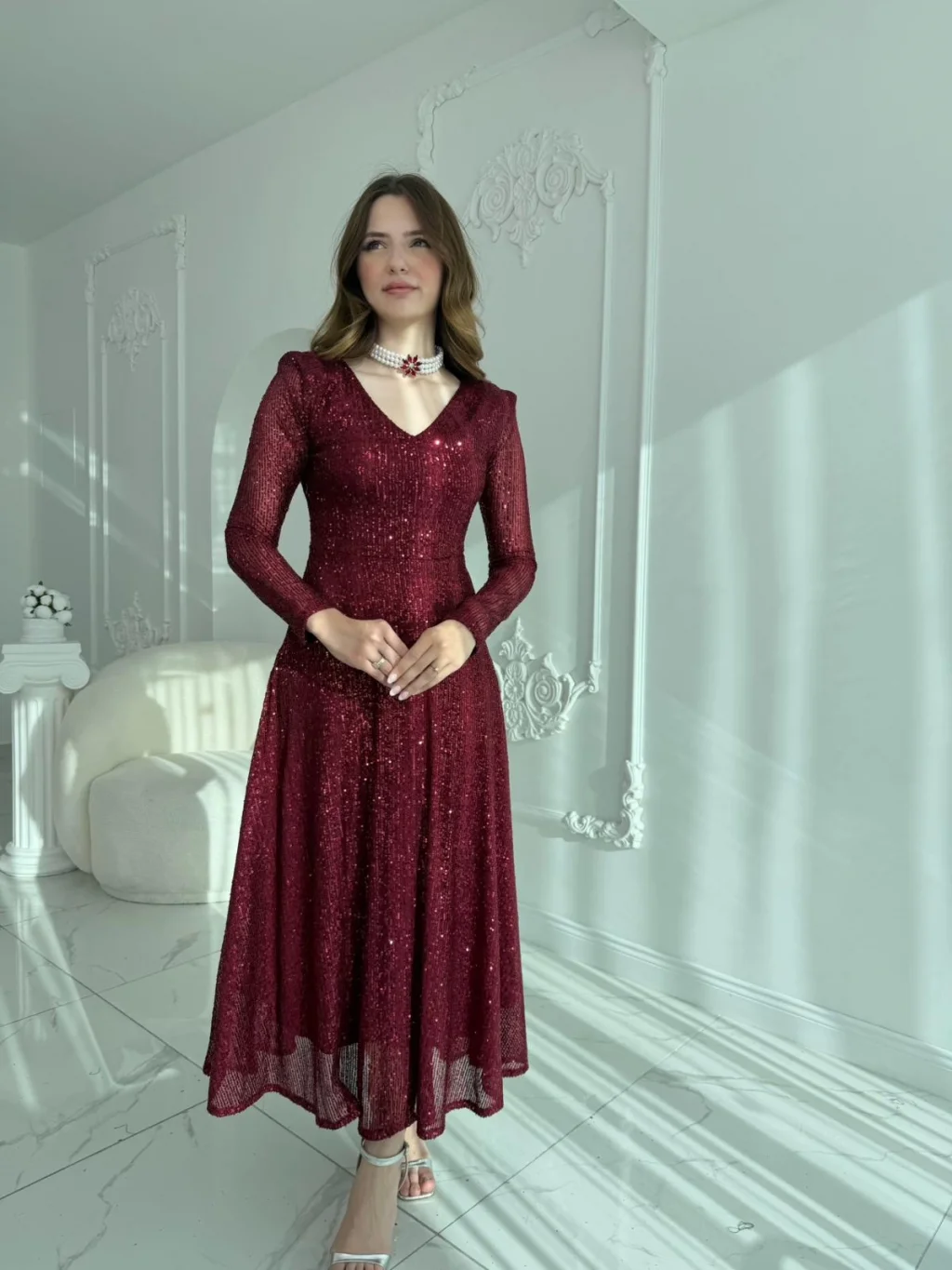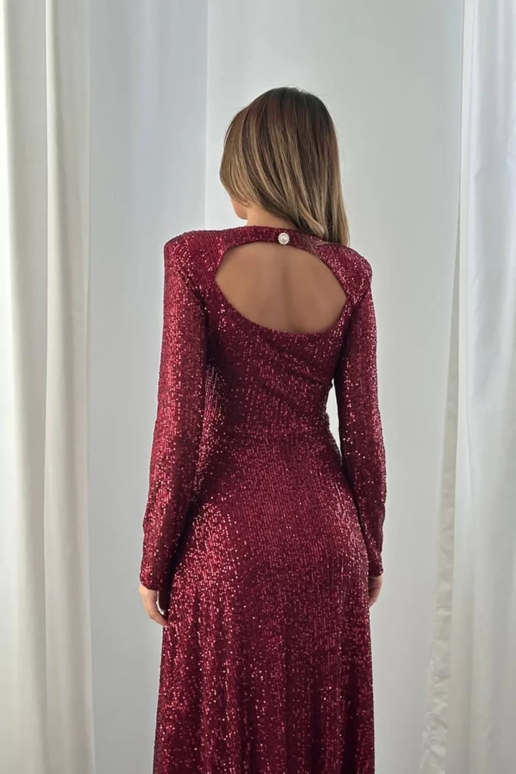 Işıltısı ve zarif tasarımıyla özel günlerinizde göz kamaştırın! V yaka detayı, uzun kollu formu ve vücudu zarifçe saran kesimi ile şıklığı ön plana çıkaran bu abiye, payet işlemeli kumaşı sayesinde her adımda parıltısını ortaya koyuyor. Arka kısmında yer alan pencere detayı ve incili broş dokunuşu ise modele modern ve sofistike bir hava katıyor. Astarlı yapısı ile rahat kullanım sunan elbise, hem davetlerde hem de özel organizasyonlarda vazgeçilmez tercihlerinizden olacak.