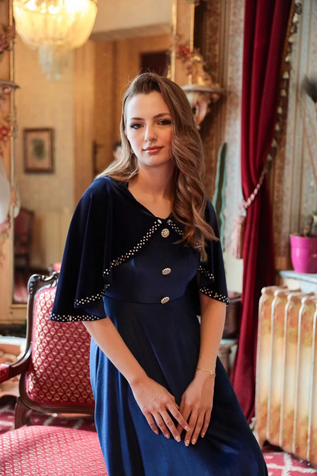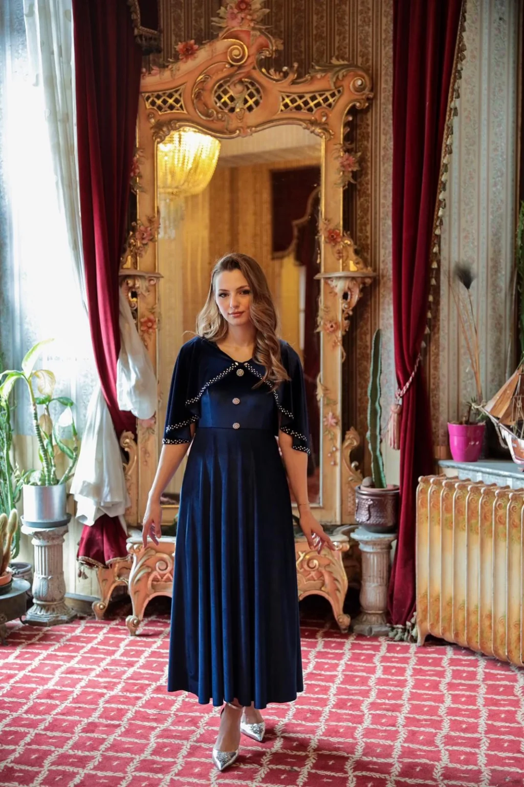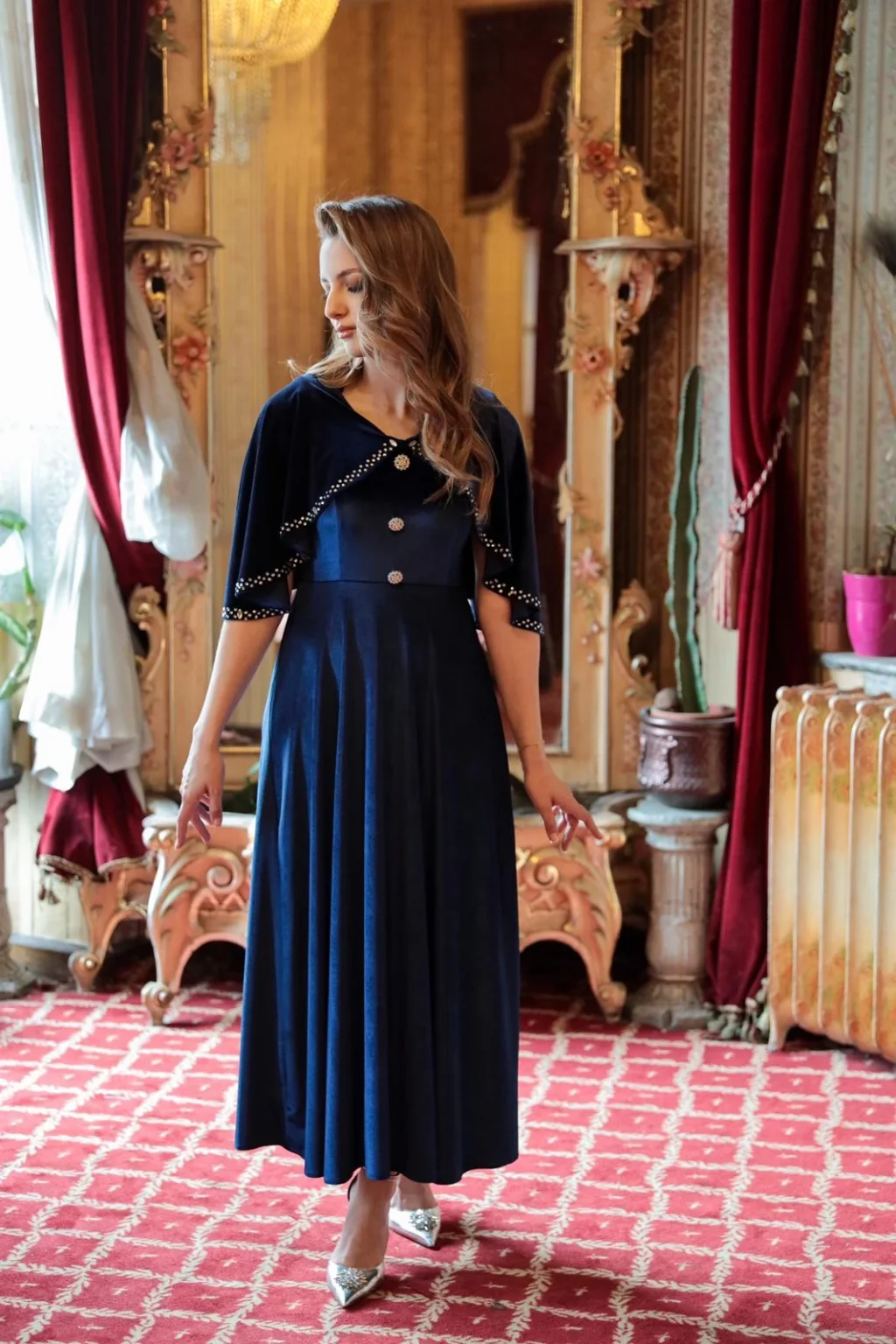 Zarafetin ve asil duruşun buluştuğu bu özel tasarım elbise, pelerin formundaki üst detayı ve inci taş işlemeleriyle göz alıcı bir duruş sunar. Kadife dokusuyla hem şık hem konforlu bir kullanım sağlar. Pelerini sabit tasarımdadır ve elbisenin parçasıdır. Özel taşlı düğmeleriyle sofistike bir görünüm kazandırır; özel davetler, söz-nişan organizasyonları ve akşam yemekleri için ideal bir tercihtir.