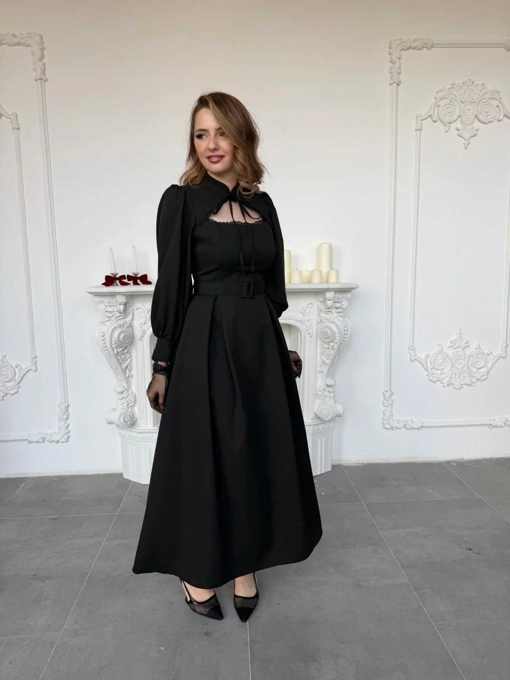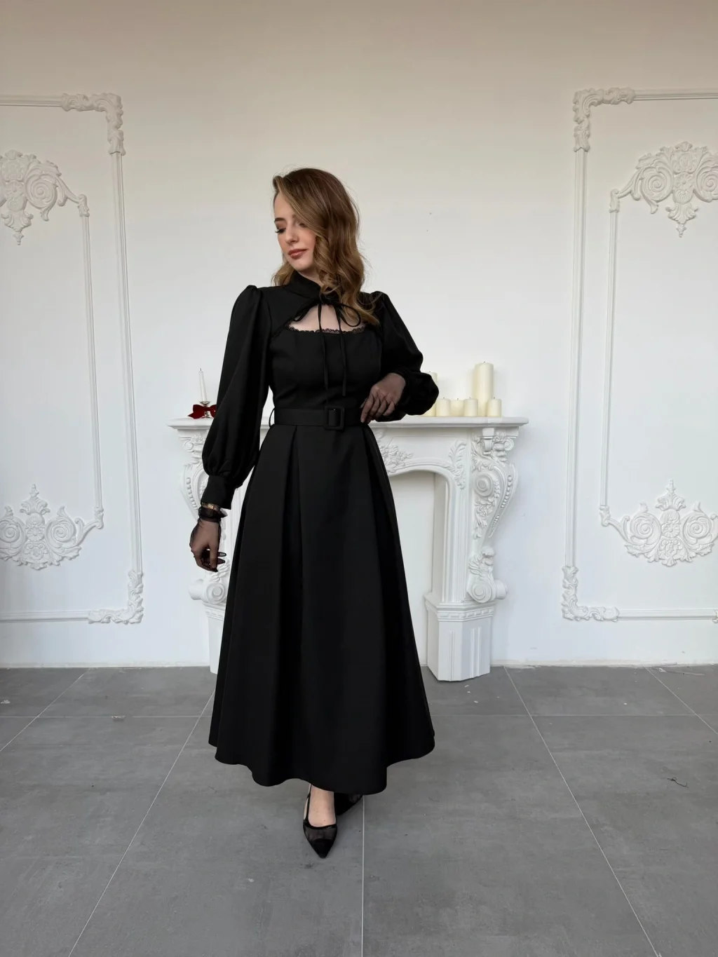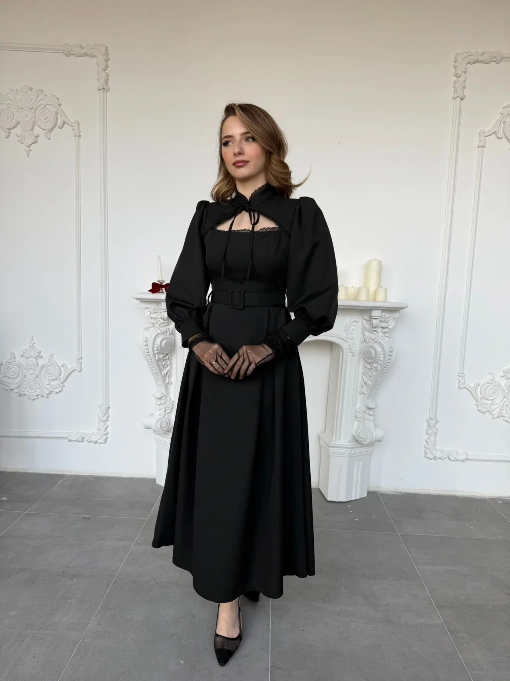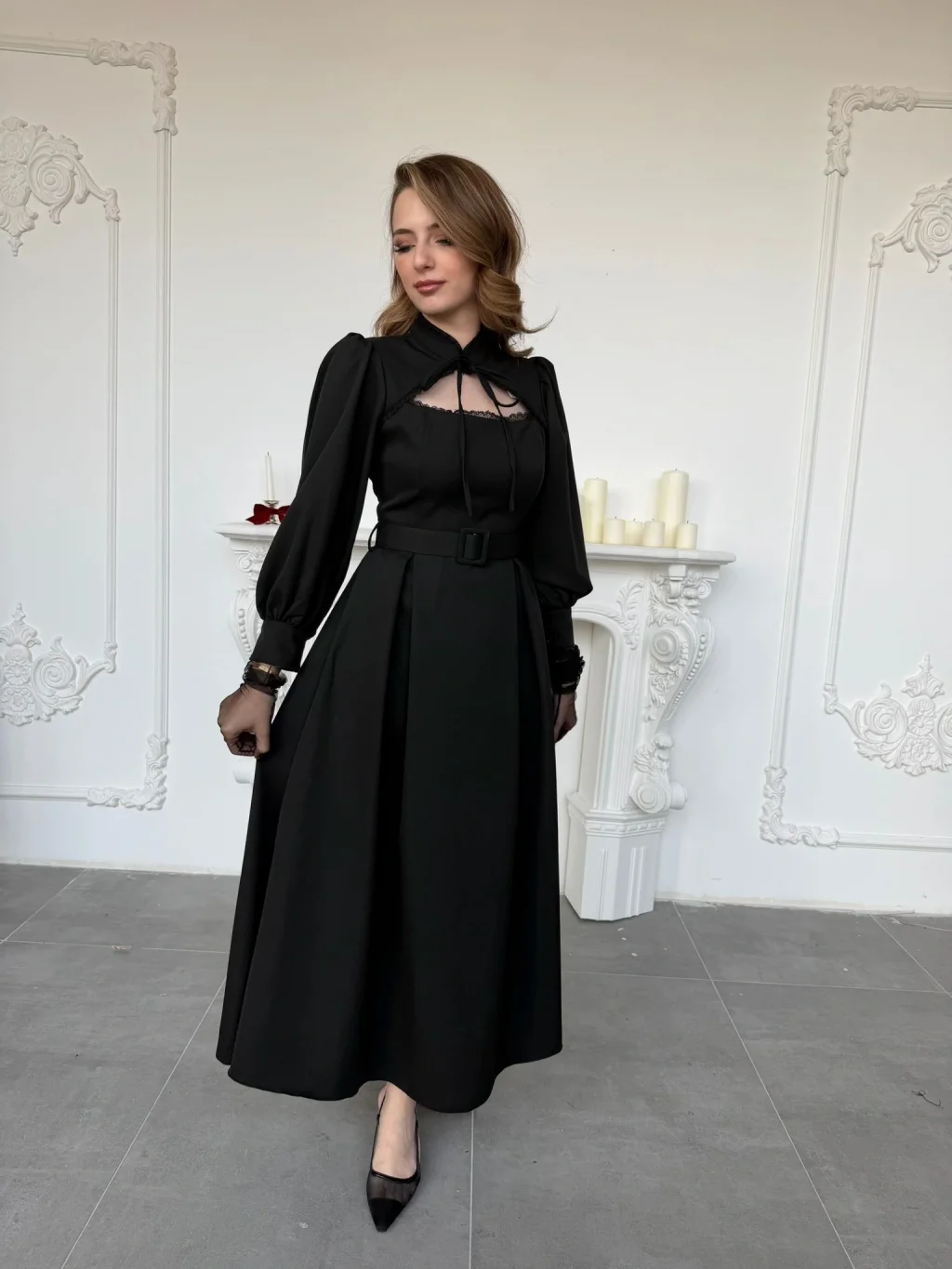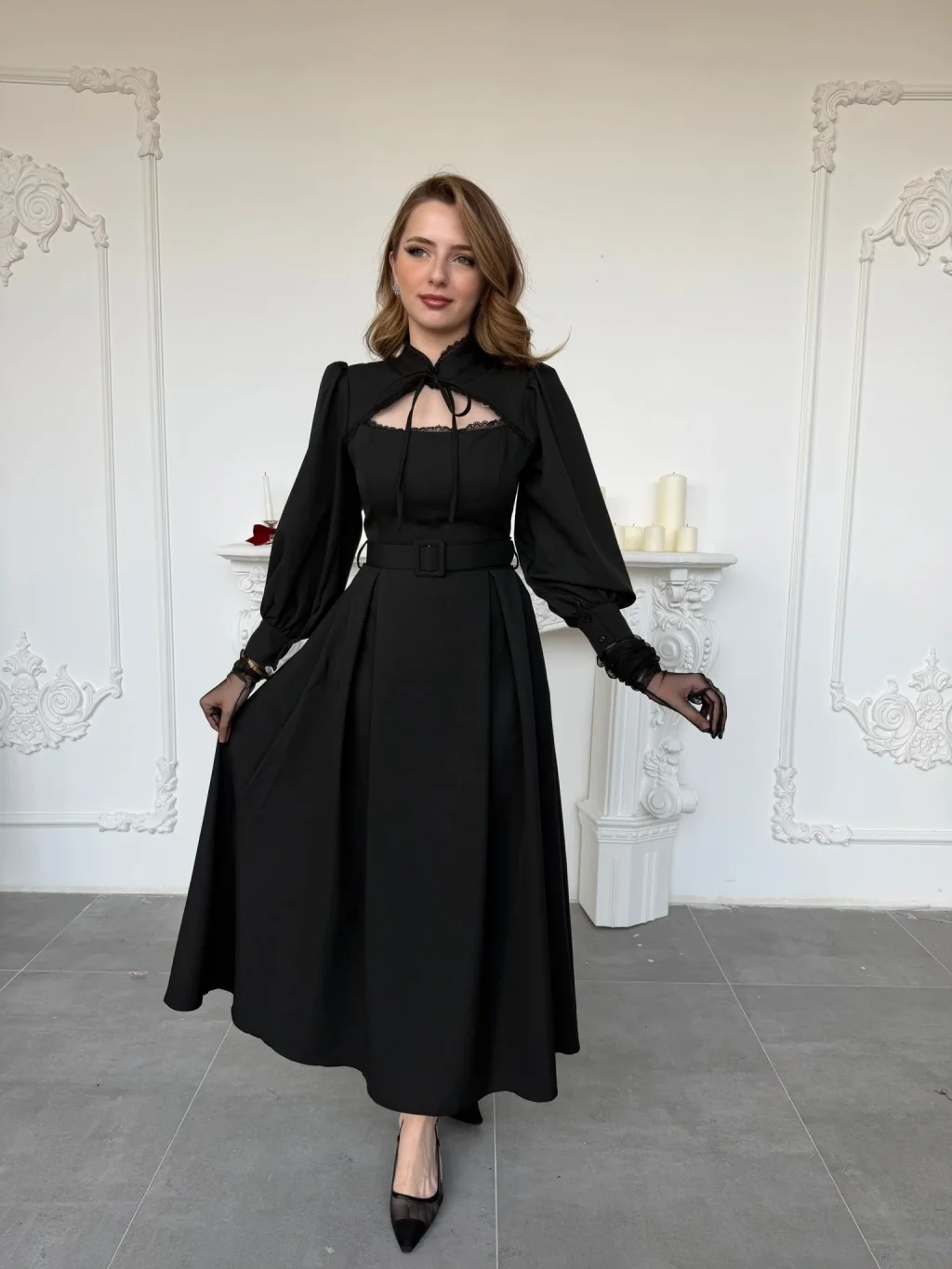 Zarafetini modern dokunuşlarla birleştiren bu özel tasarım elbise, pencere yaka formu ve bağlama detayıyla bir anda tüm dikkatleri üzerine çekiyor. Belde yer alan elbise ile bütünleşik kemer, silueti daha da zarif gösterirken, hacimli kollar ve akıcı dökümlü etek formu görünümü güçlendiriyor. Arkadan fermuar kapamasıyla pratik kullanım sunan model, özel günlerden davetlere kadar her anınıza eşlik edecek güçlü bir Helis dokunuğu taşıyor. Eldivenler çekim konsepti için kullanılmıştır, ürüne dahil değildir.