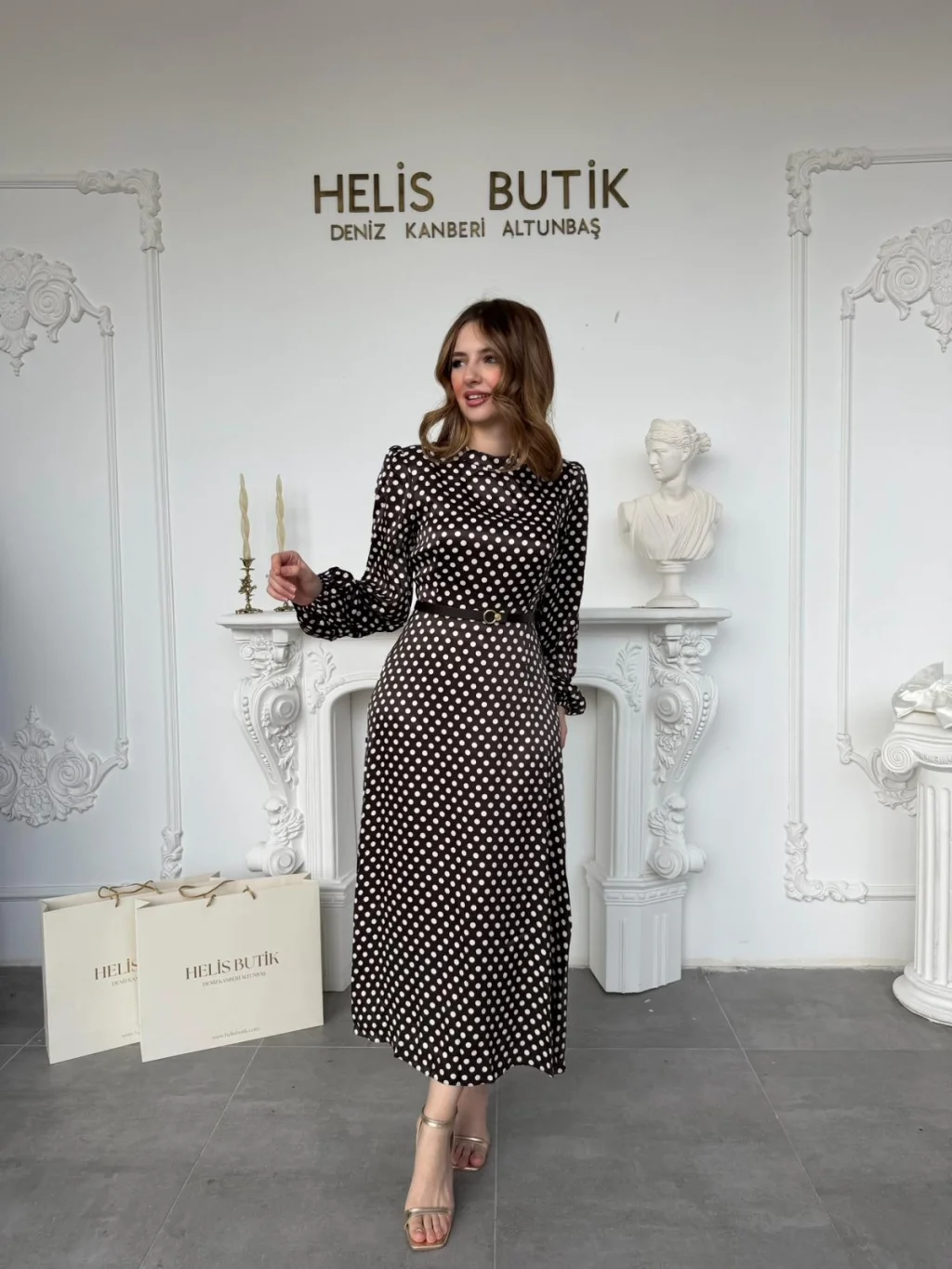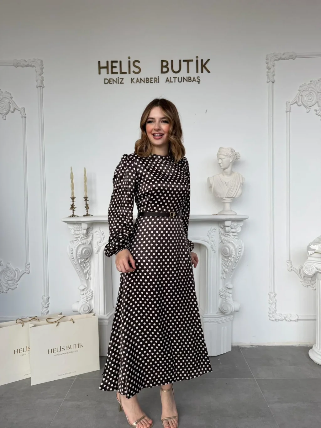 Zamansız şıklığın en tatlı hali puantiye, Helis Butik kalitesiyle yeniden yorumlandı. Gardırobunuzun en joker parçası olmaya aday bu elbisemiz, kalın premium saten kumaşı sayesinde hem dik bir duruş sergiliyor hem de o aradığınız asil parlamayı sunuyor.