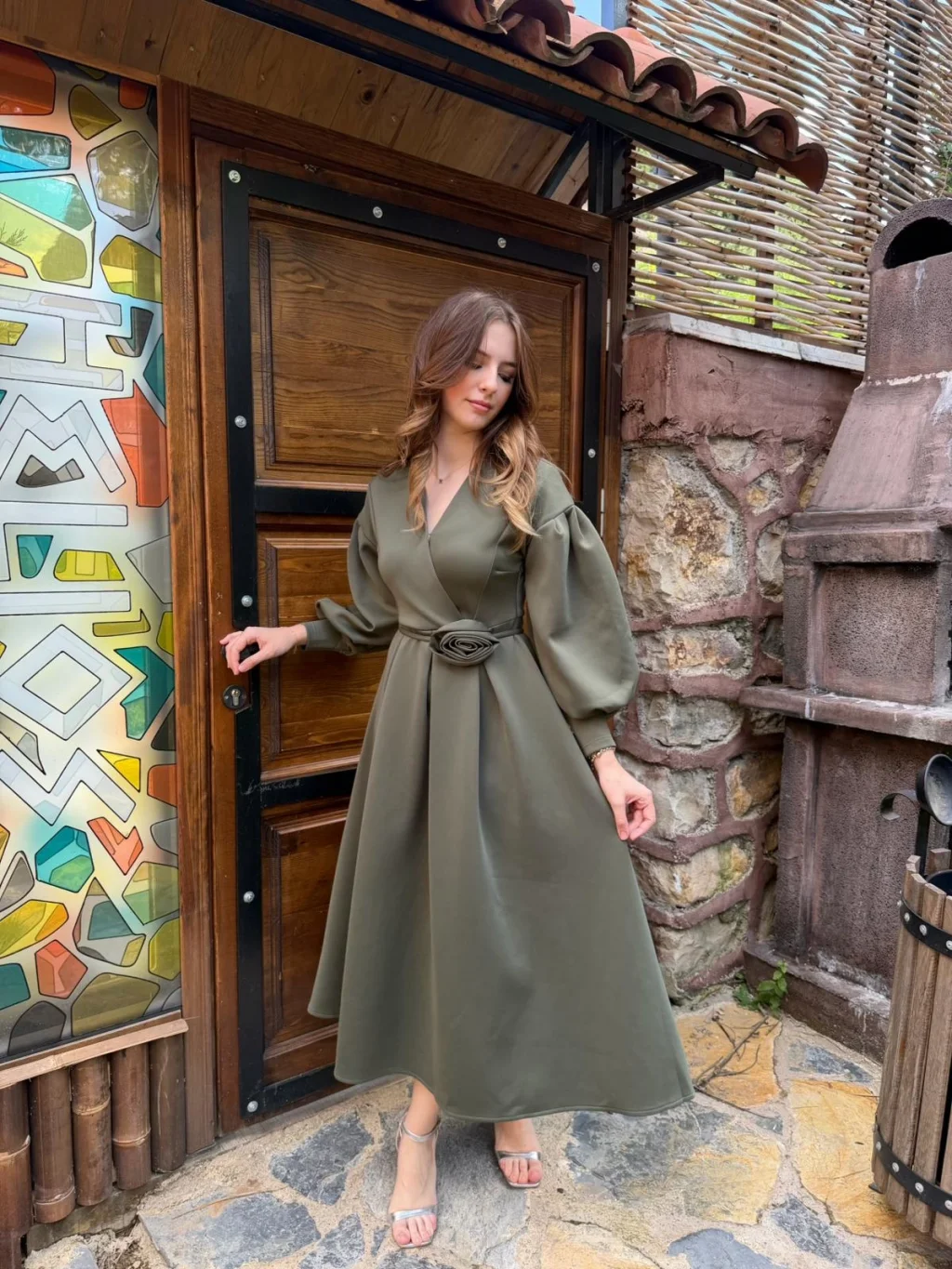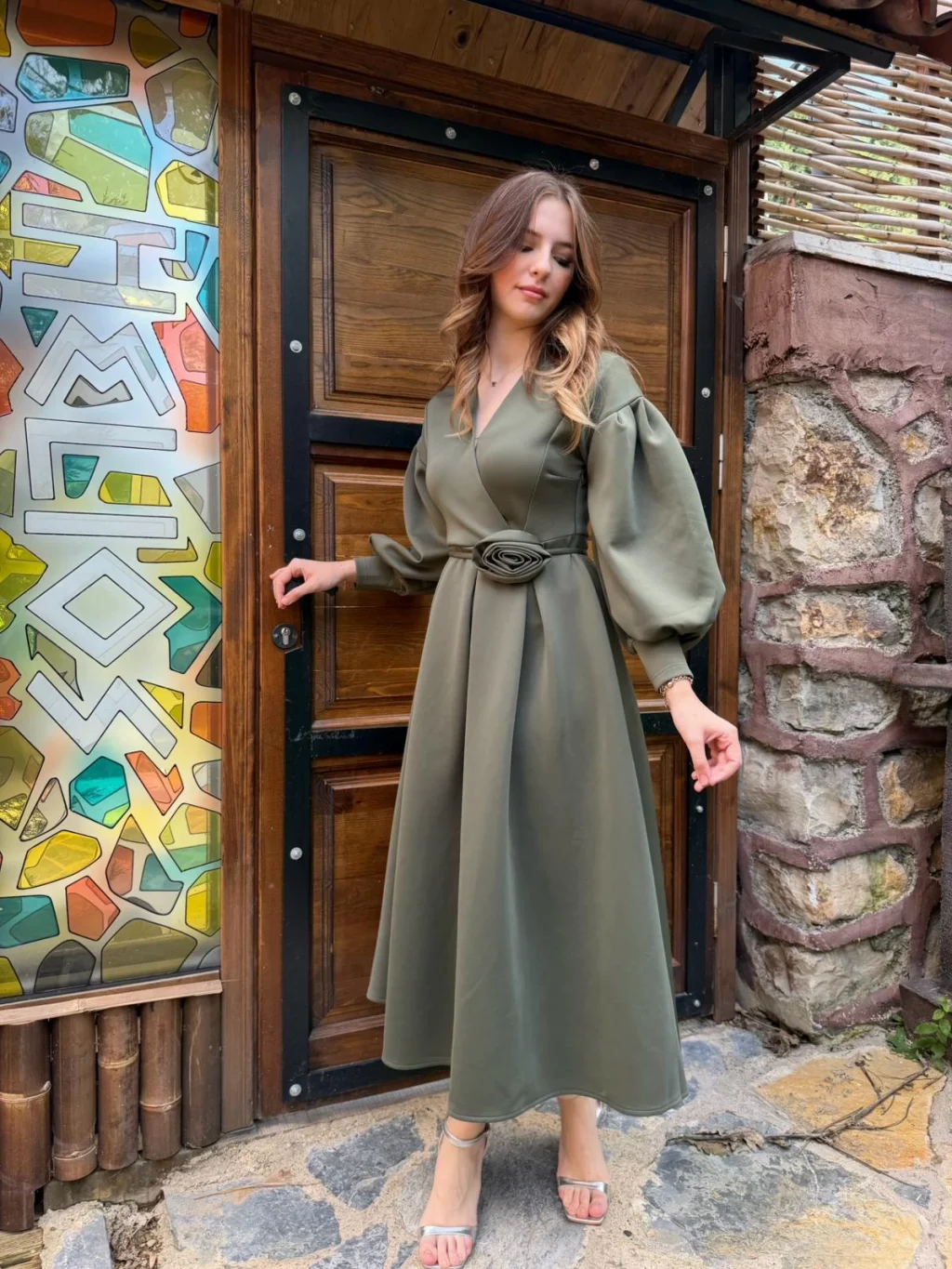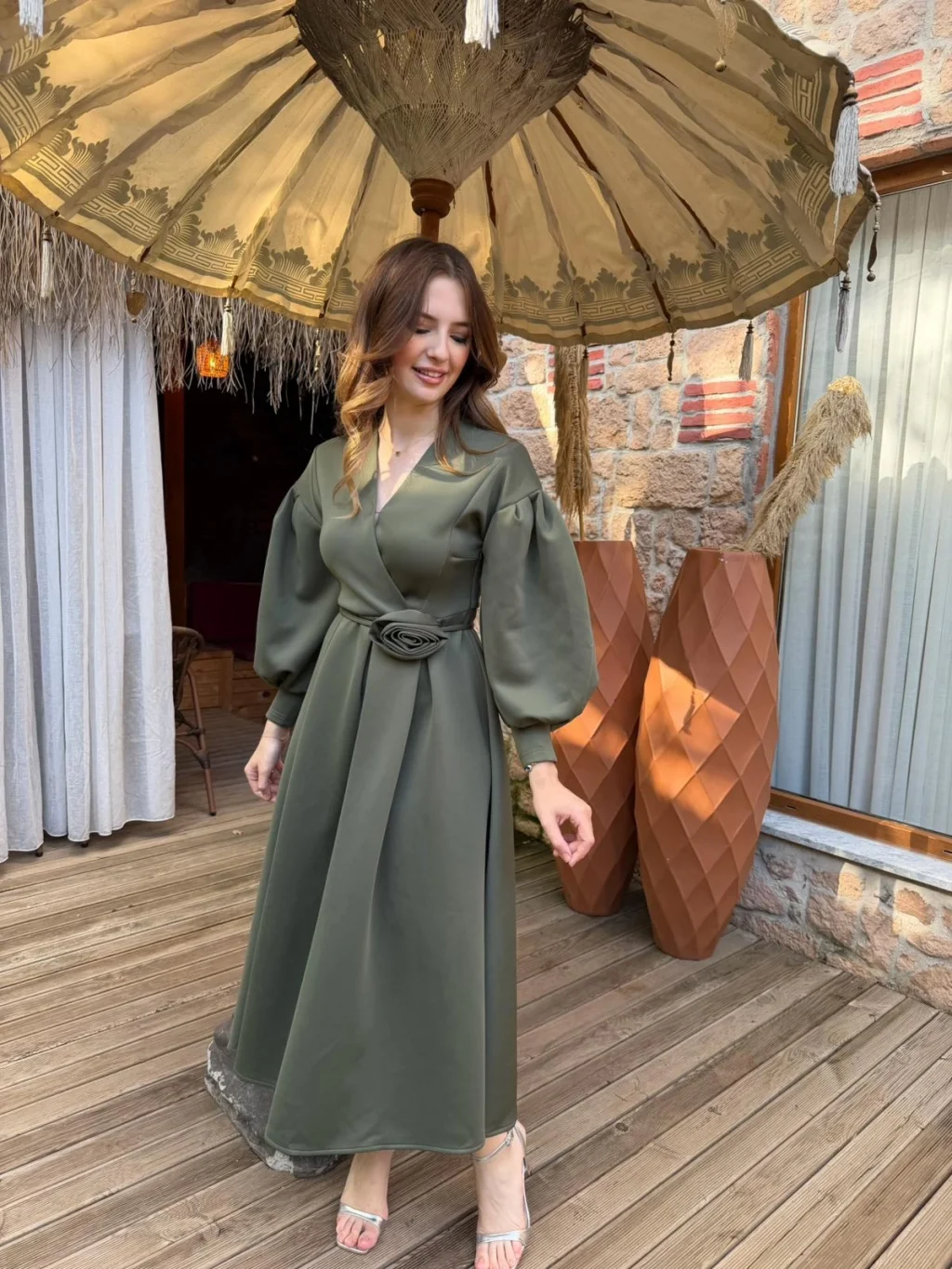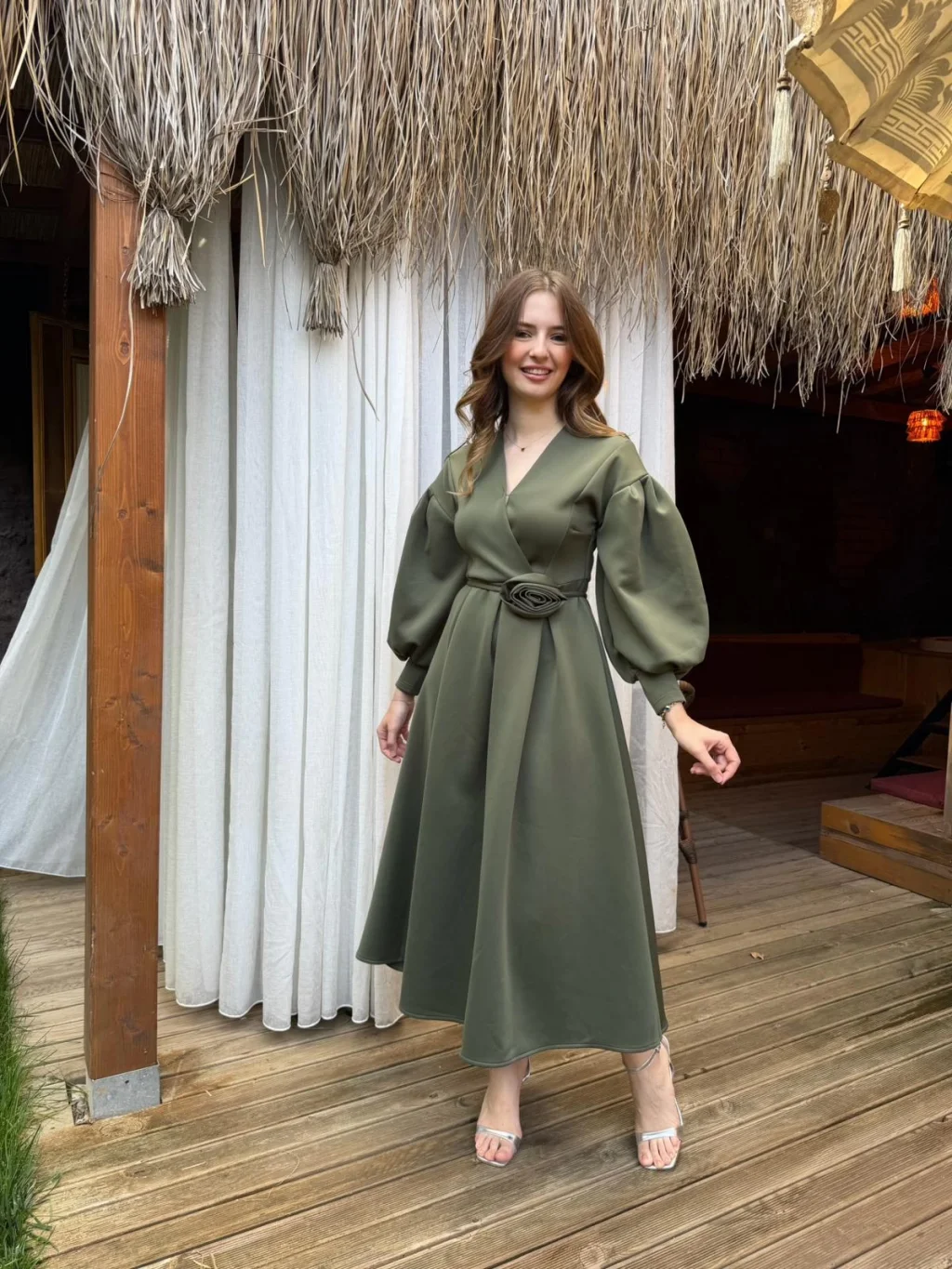 Scuba kumaşın tok ve kaliteli dokusu sayesinde formunu koruyan bu özel tasarım elbise, V yaka kesimi ve balon kollarıyla modern bir siluet oluşturur. Bel kısmındaki çıkarılabilir çiçek formundaki kuşak kemer, hem romantik hem de asil bir hava kazandırır. Davetlerden günlük şıklığa kadar birçok ortamda rahatlıkla tercih edebileceğiniz bu tasarım, sade ama etkileyici bir görünüm arayan kadınlar için mükemmel bir seçimdir.