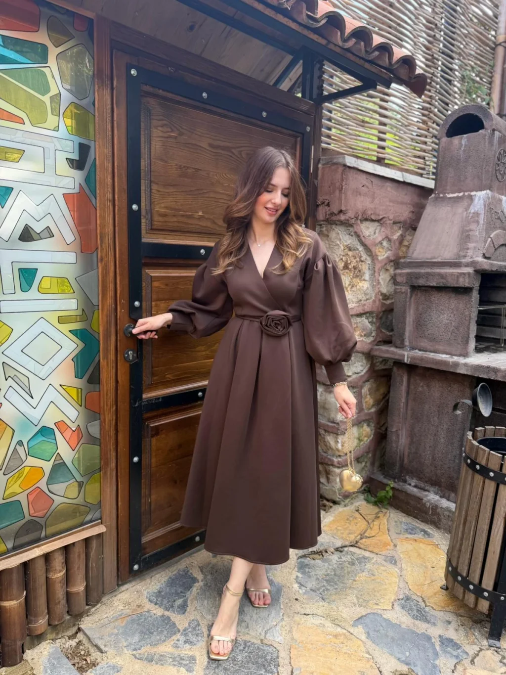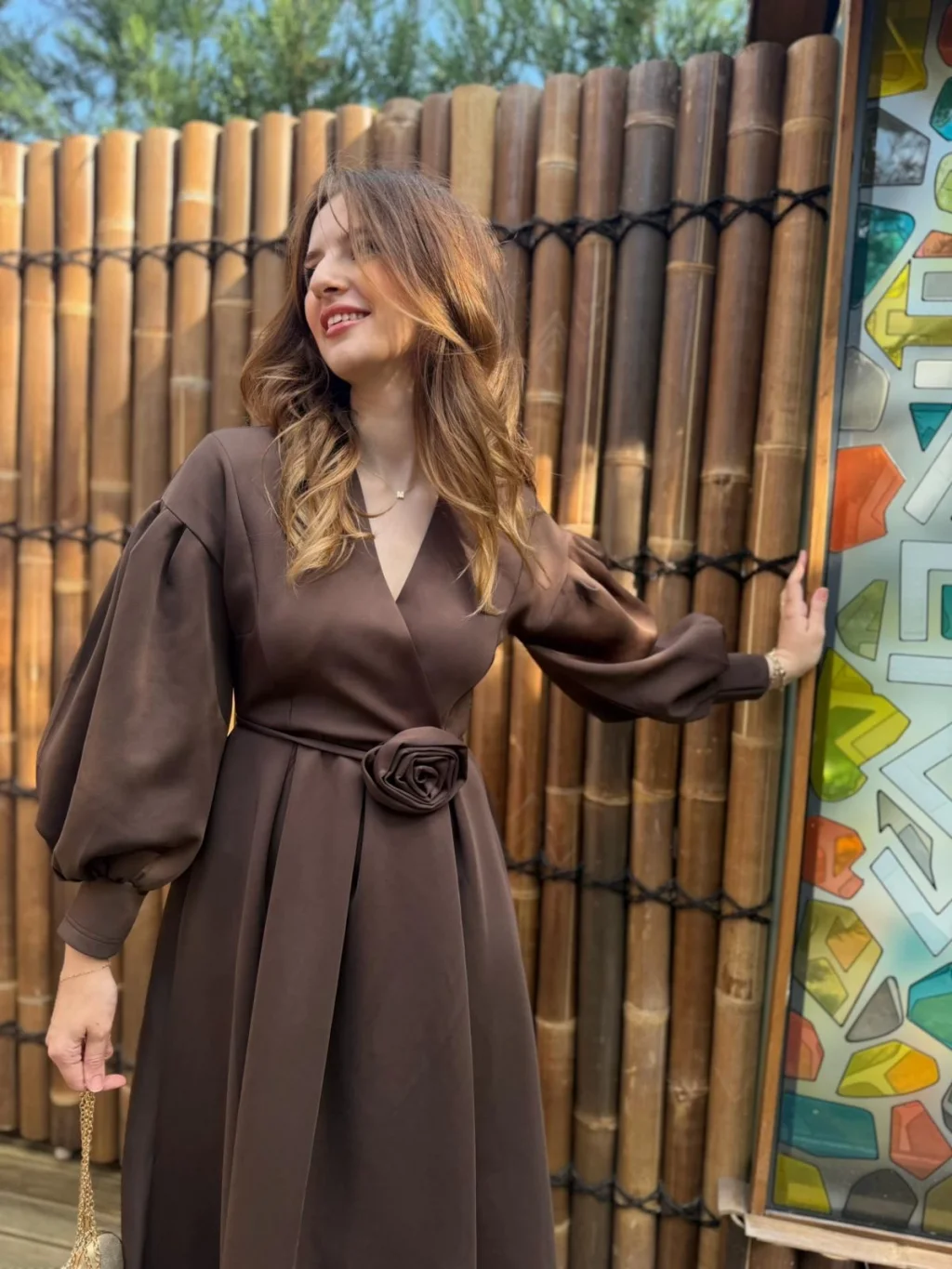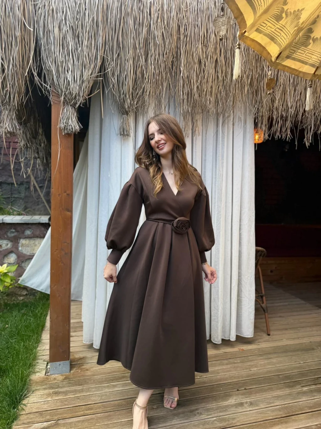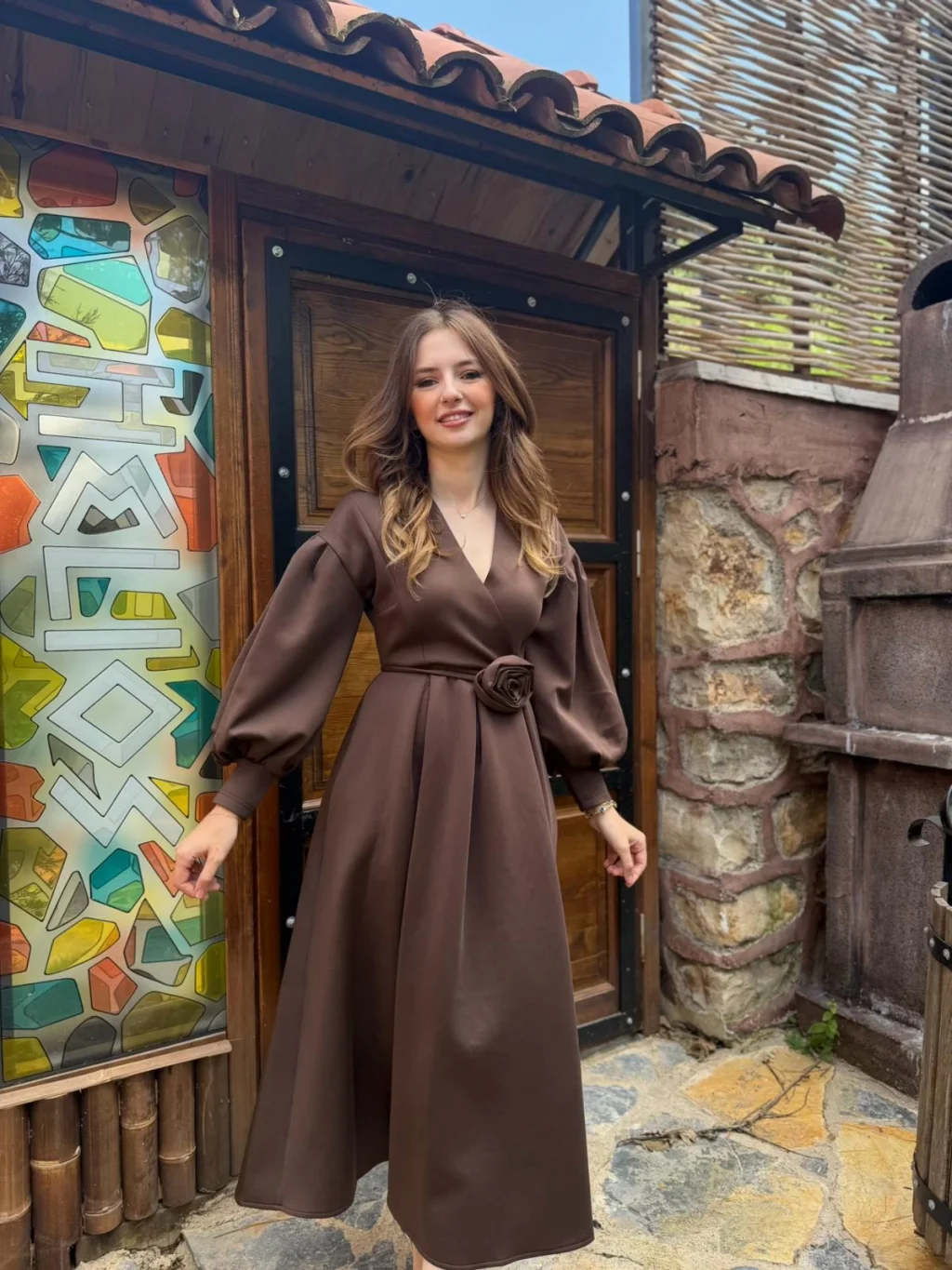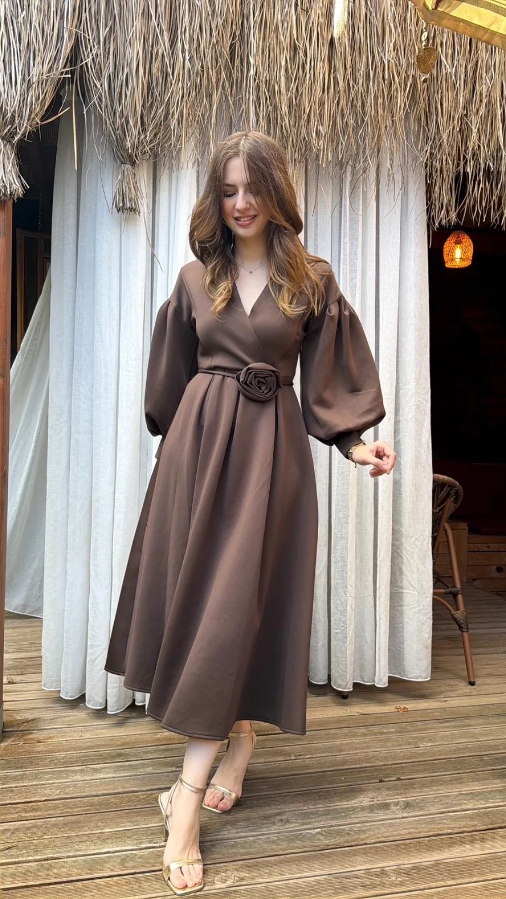 Scuba kumaşın tok ve kaliteli dokusu sayesinde formunu koruyan bu özel tasarım elbise, V yaka kesimi ve balon kollarıyla modern bir siluet oluşturur. Bel kısmındaki çıkarılabilir çiçek formundaki kuşak kemer, hem romantik hem de asil bir hava kazandırır. Davetlerden günlük şıklığa kadar birçok ortamda rahatlıkla tercih edebileceğiniz bu tasarım, sade ama etkileyici bir görünüm arayan kadınlar için mükemmel bir seçimdir.
