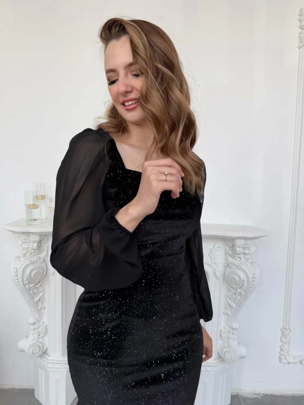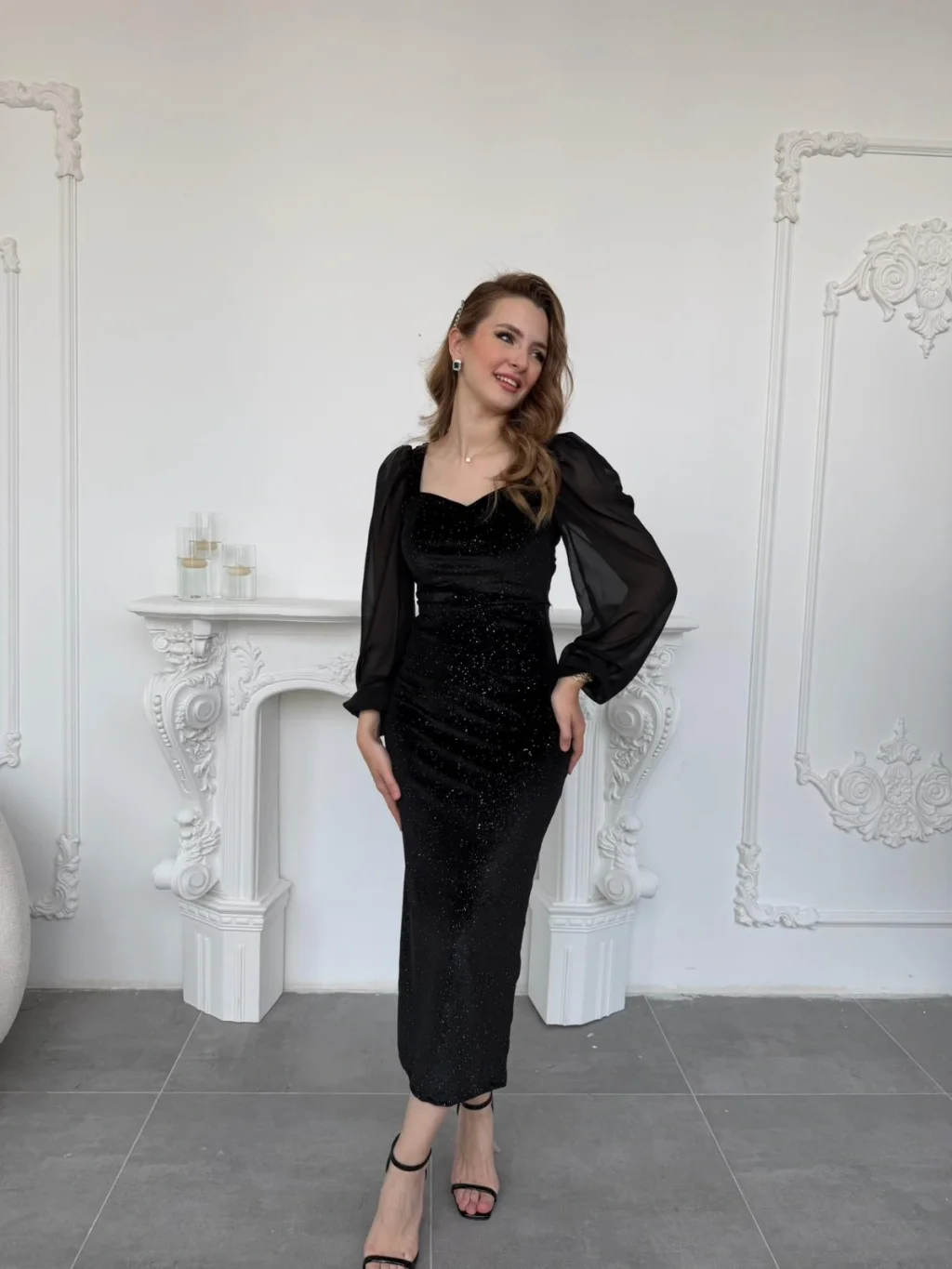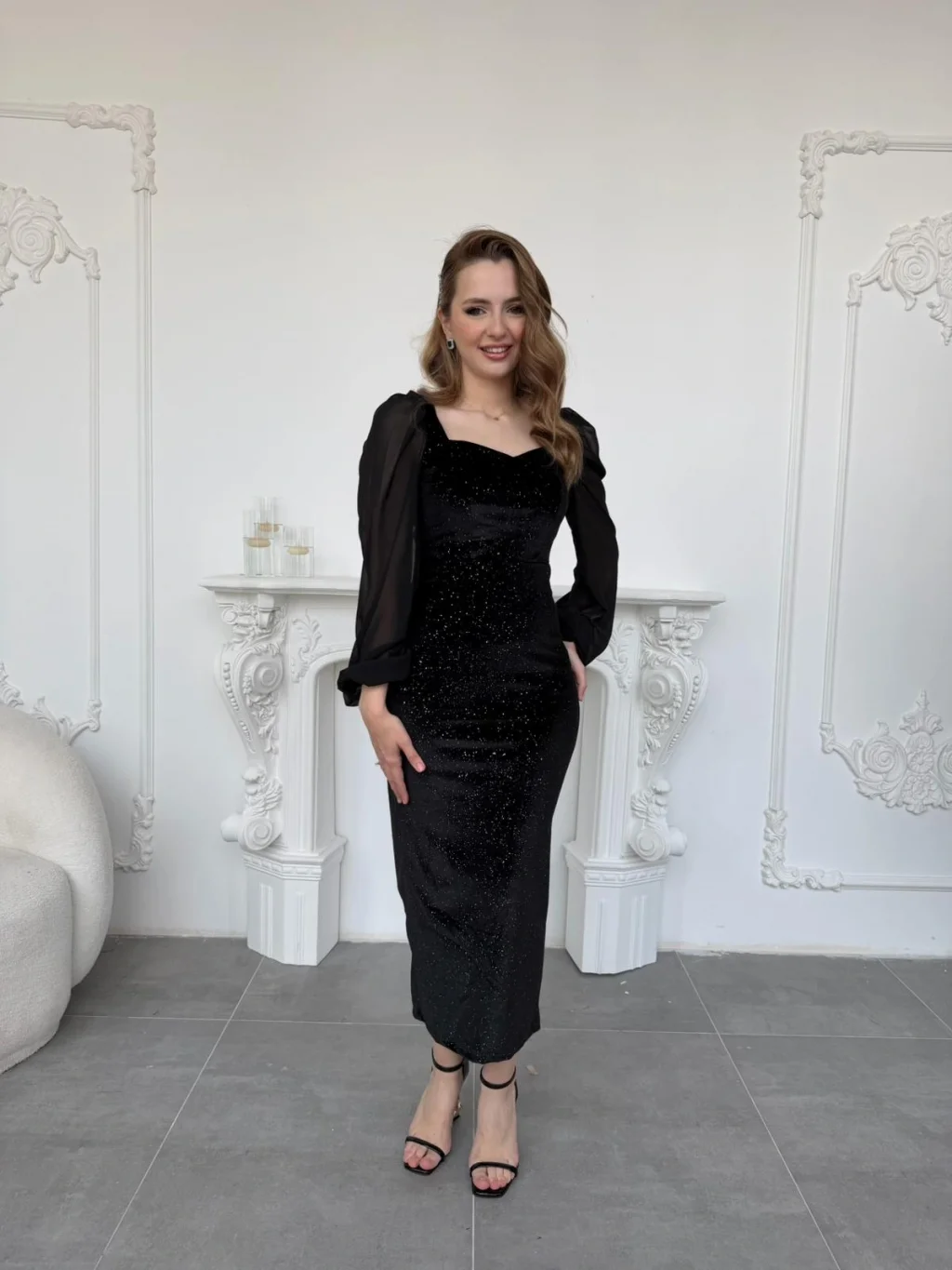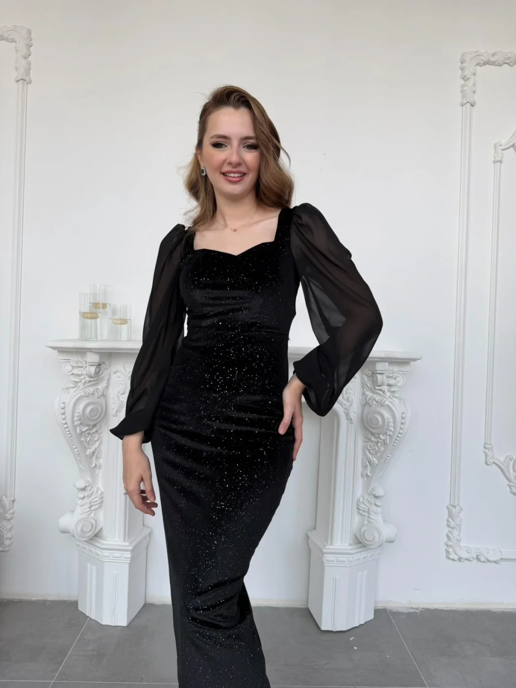 Işıltılı kadife dokusuyla zarif bir parıltı sunan bu özel tasarım elbise, şifon kollarının akışkan görünümüyle birleşerek şık davetlerin en güçlü tamamlayıcısı oluyor. Gövde kısmındaki hafif simli ışıltılar, elbiseye hem sade hem de dikkat çekici bir duruş kazandırırken; uzun formu ve arkasındaki yırtmaç detayı yürüyüşe zarif bir hareket katıyor.