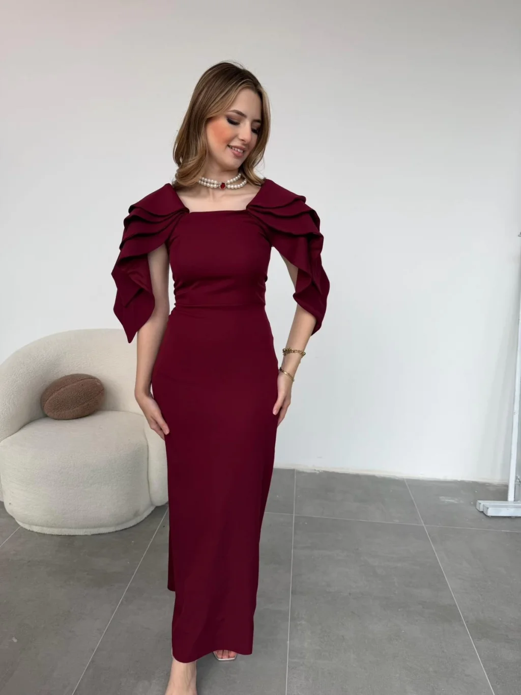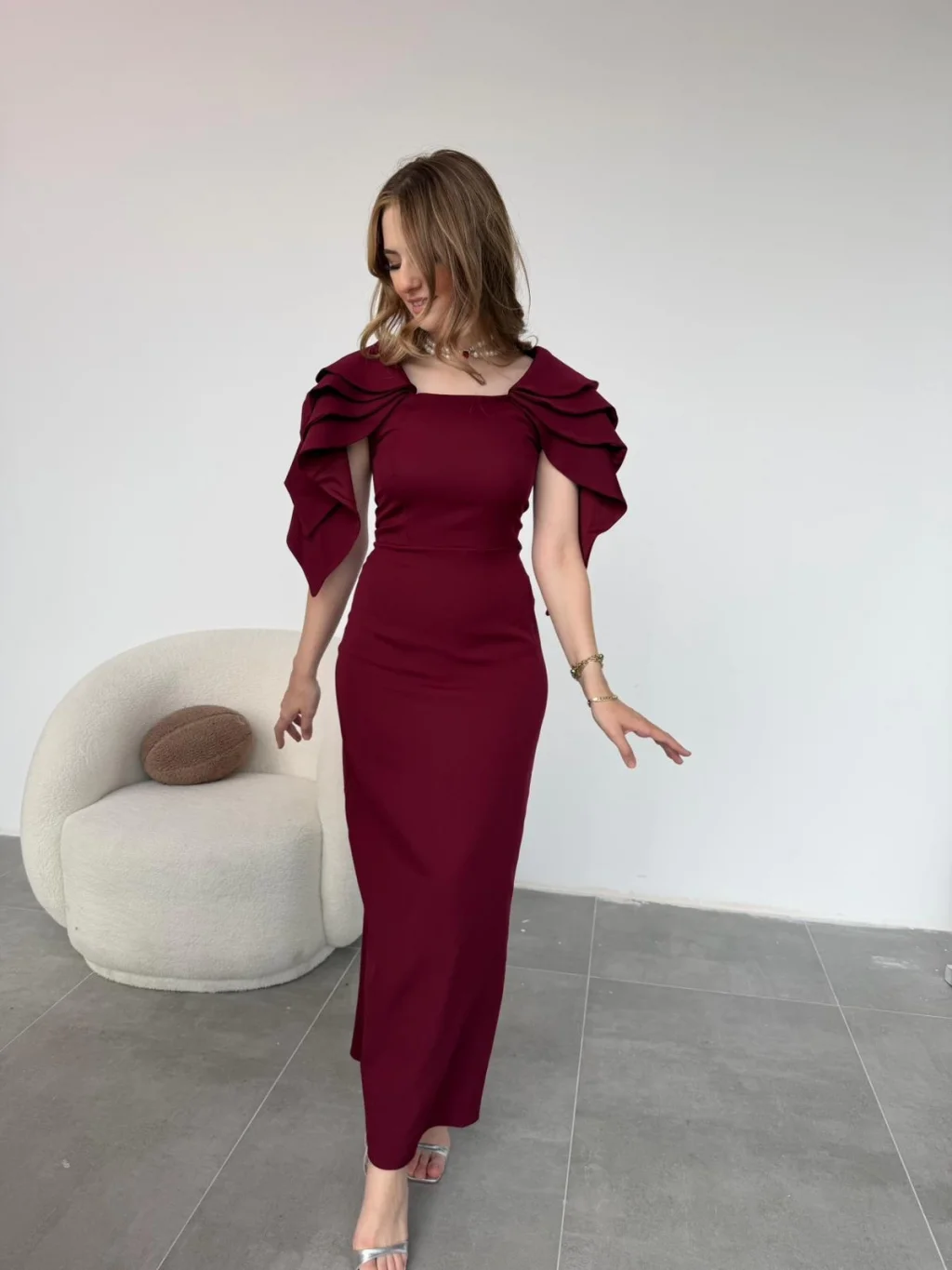 Şık Kat Detaylı Angel Model Bordo Elbise