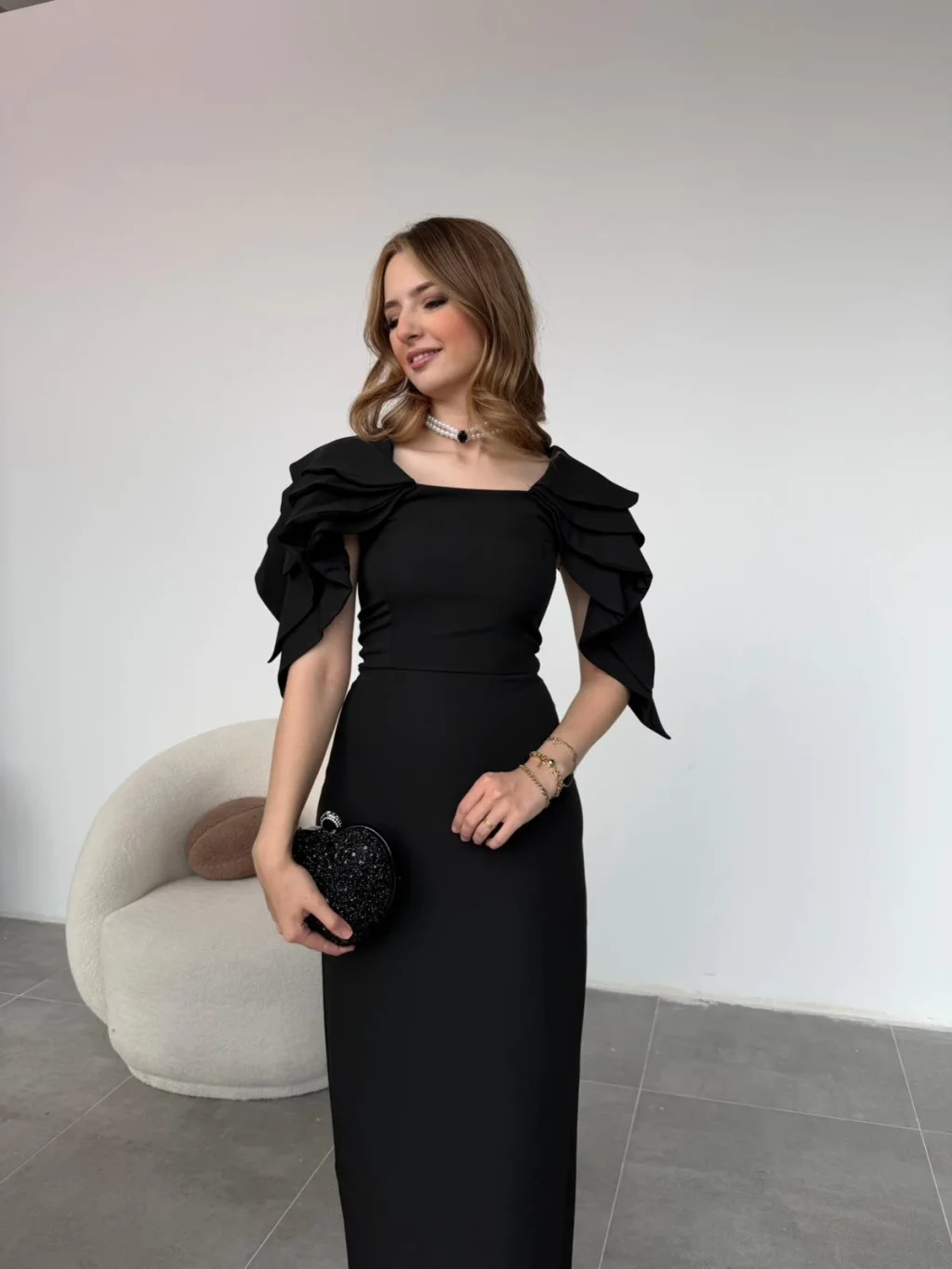 Angel model elbise, zarif duruşu ve şık kat detaylı omuz tasarımıyla özel davetlerin yıldızı olmaya aday. Dokuma atlas kumaşın akıcı formu, vücudu nazikçe sararken rahat bir kullanım da sunar. Uzun boy kesimiyle davetlerde, nişanlarda ve özel akşamlarda asil bir görünüm oluşturur.