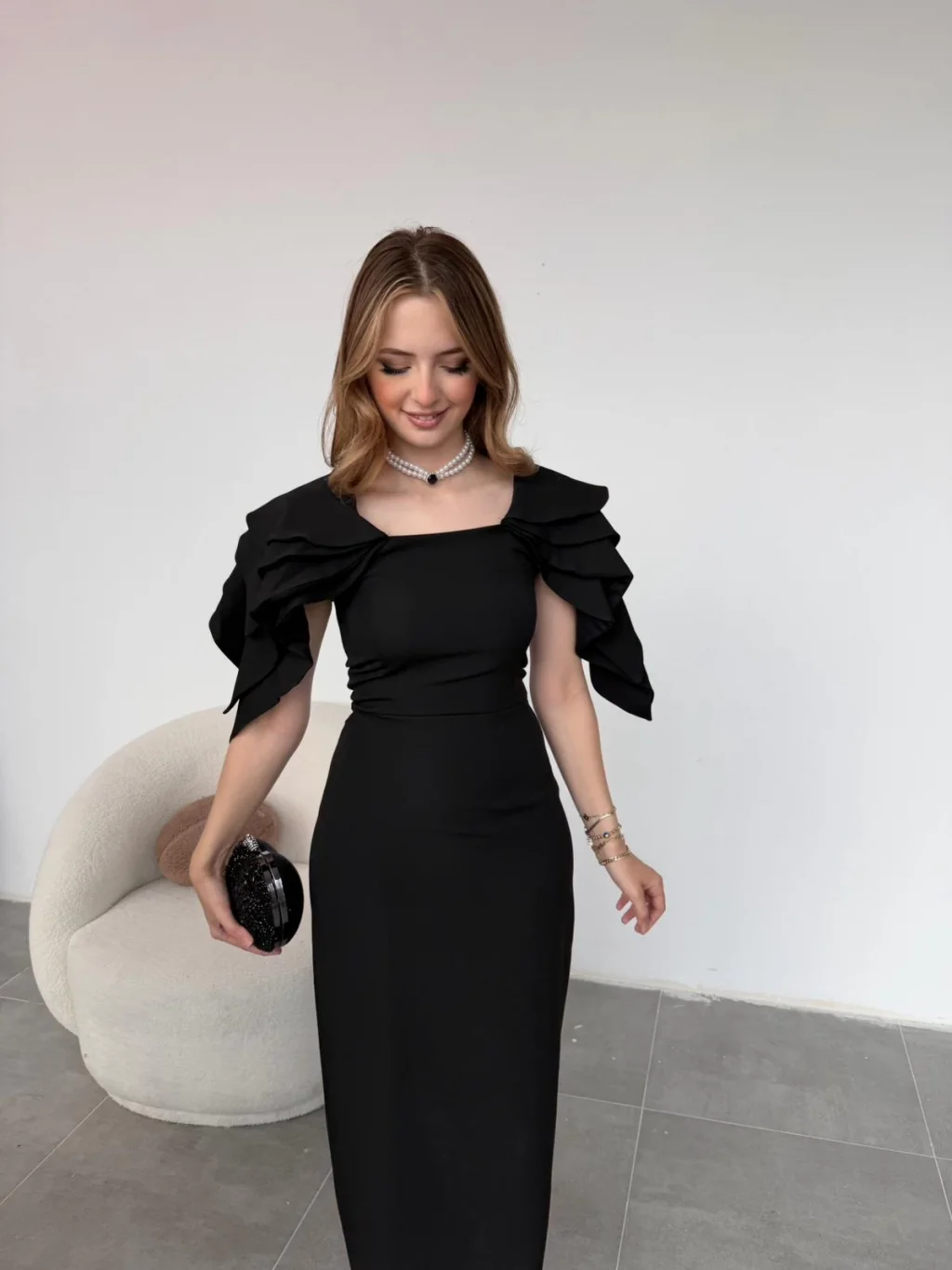 Şık Kat Detaylı Angel Model Siyah Elbise